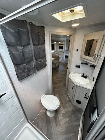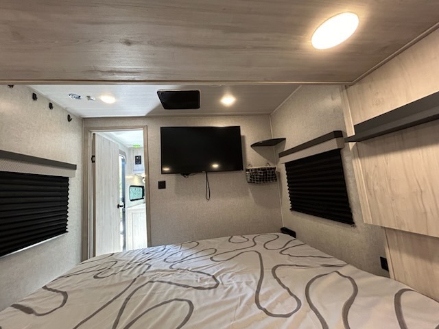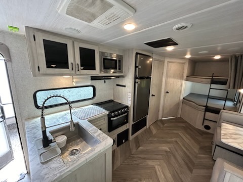 Load up the family, your clothes, gear, food and head out for a fun long-weekend at your local state park! As you easily load through the dual entry doors, you will find lots of storage throughout in the dual wardrobes in the private bedroom, underneath both the oversized booth dinette and jack knife sofa, and within the overhead cabinets and large pantry in the galley kitchen, plus the exterior oversized pass-through storage allows you to bring along the larger items. You will sleep like a king while the family loves sleeping on the double-size bunks and furniture once easily setup for nighttime. You have several more conveniences such as a second entry door into the full bathroom, a ladder for the bunks, a fireplace underneath the entertainment center and the option to add an outdoor kitchen.