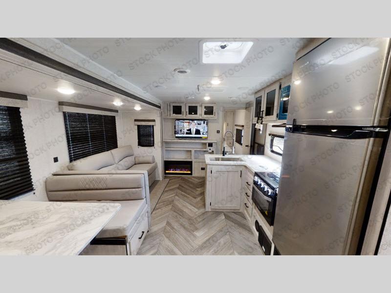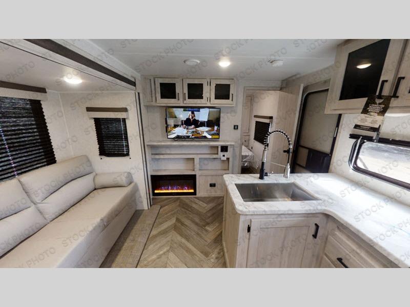 Load up the family, your clothes, gear, food and head out for a fun long-weekend at your local state park! As you easily load through the dual entry doors, you will find lots of storage throughout in the dual wardrobes in the private bedroom, underneath both the oversized booth dinette and jack knife sofa, and within the overhead cabinets and large pantry in the galley kitchen, plus the exterior oversized pass-through storage allows you to bring along the larger items. You will sleep like a king while the family loves sleeping on the double-size bunks and furniture once easily setup for nighttime. You have several more conveniences such as a second entry door into the full bathroom, a ladder for the bunks, a fireplace underneath the entertainment center and the option to add an outdoor kitchen.