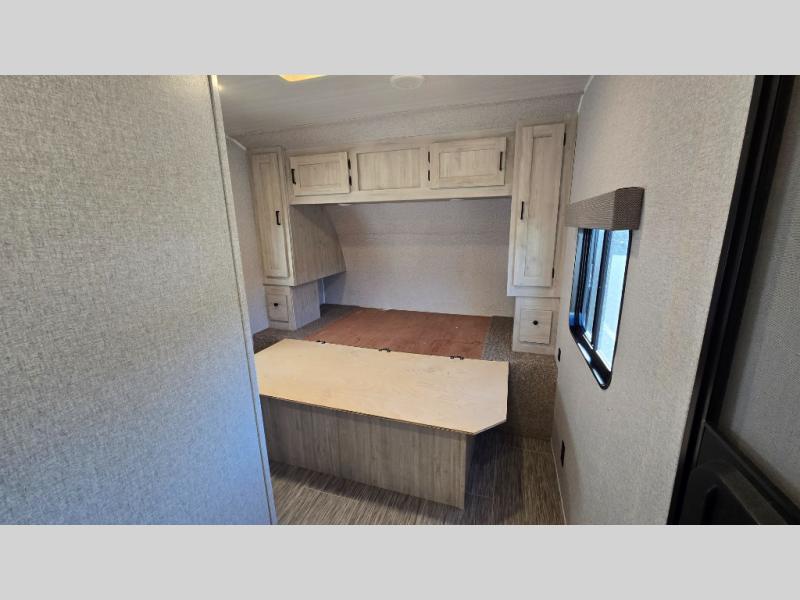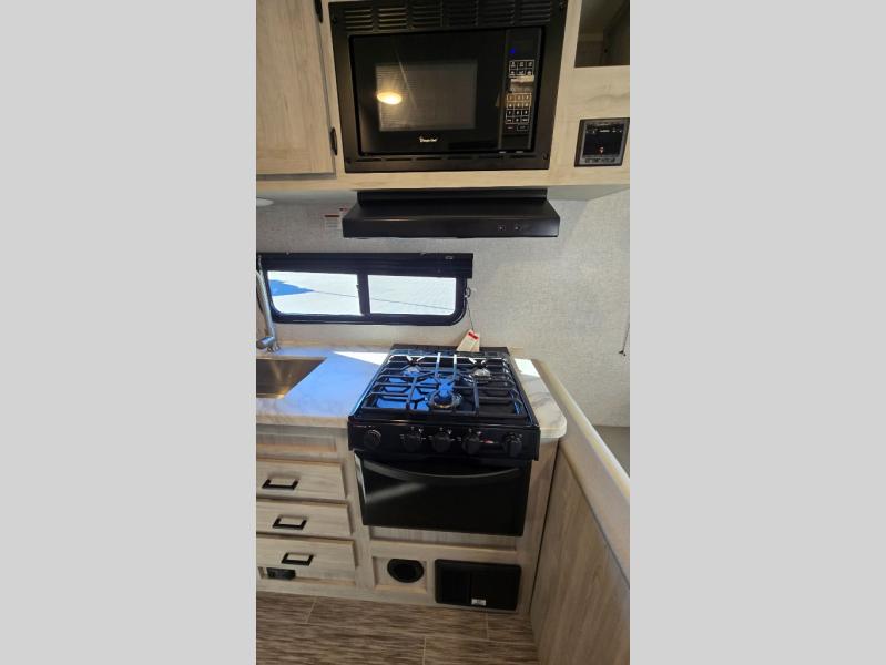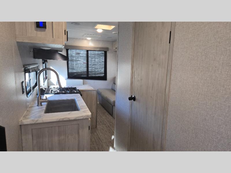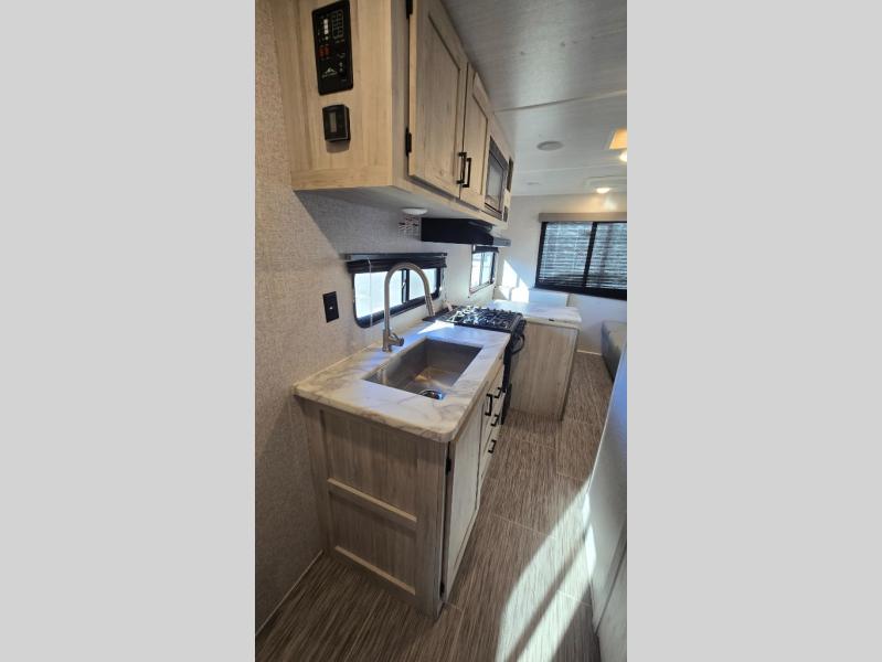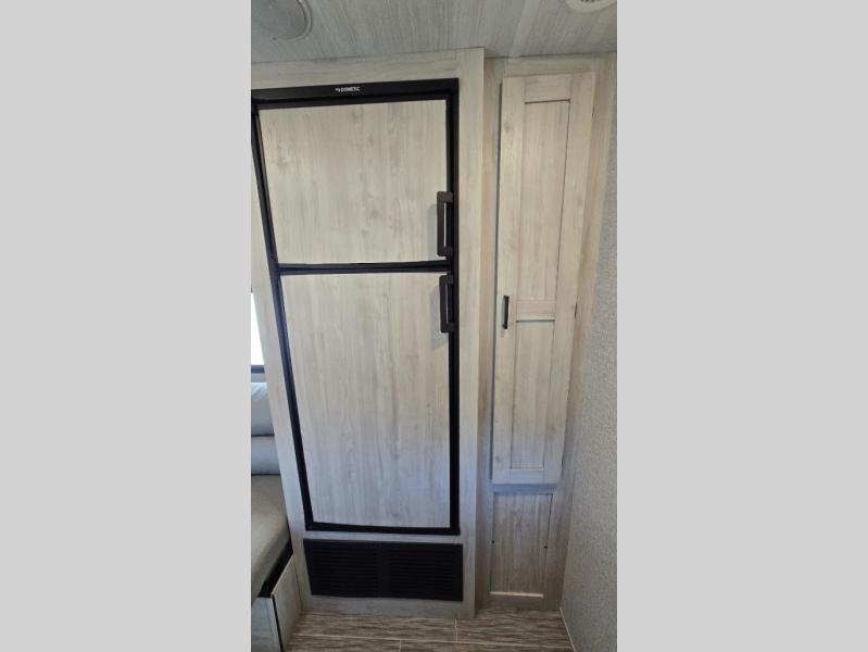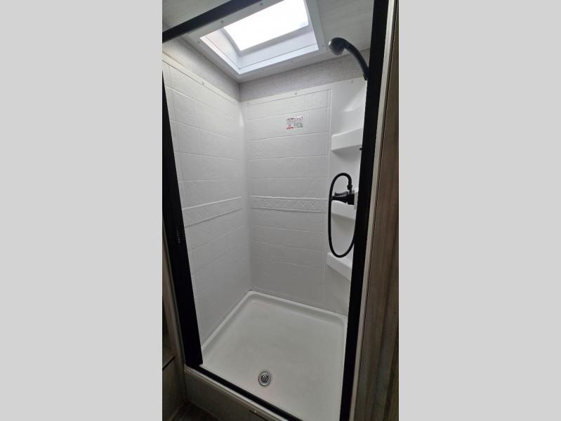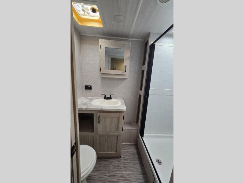 The front private bedroom offers a walk-around queen bed with ample storage, creating a relaxing retreat after a day of adventure. The fully equipped kitchen includes generous counter space, a refrigerator, microwave, stove, and plenty of cabinetry for all your camping essentials. A full bathroom with shower ensures comfort wherever your travels take you.