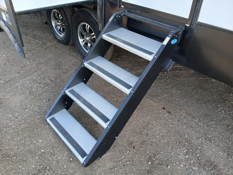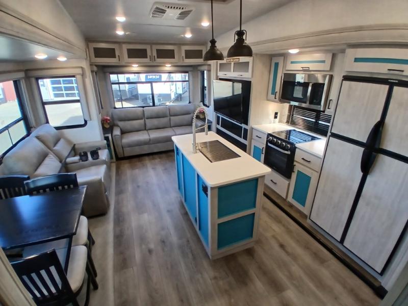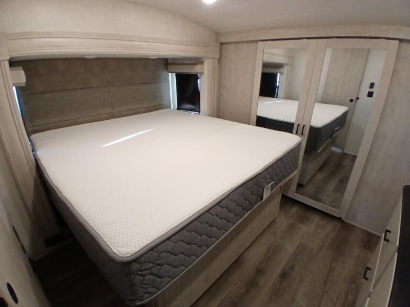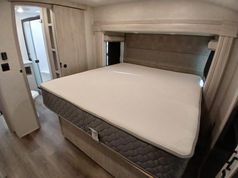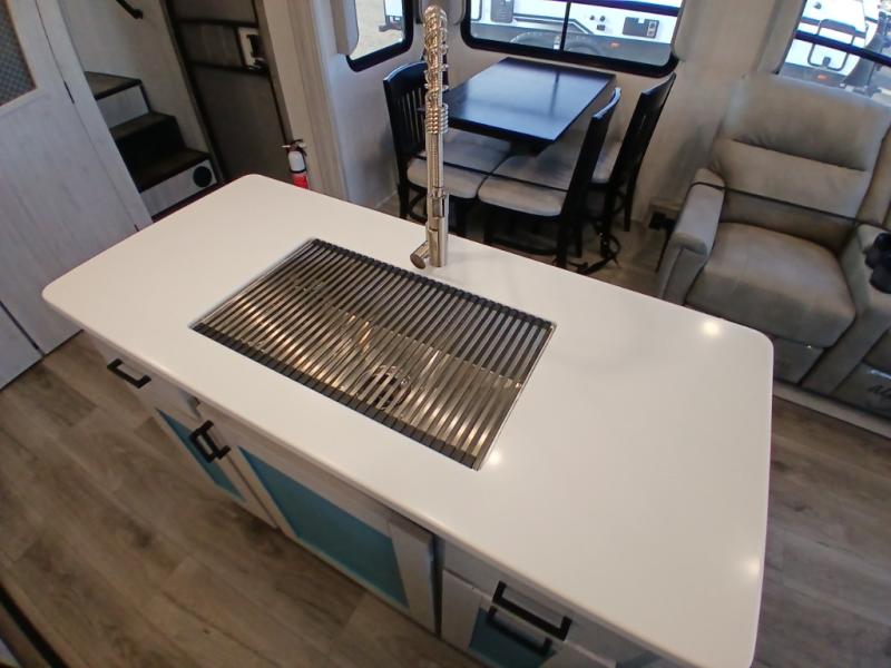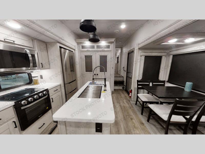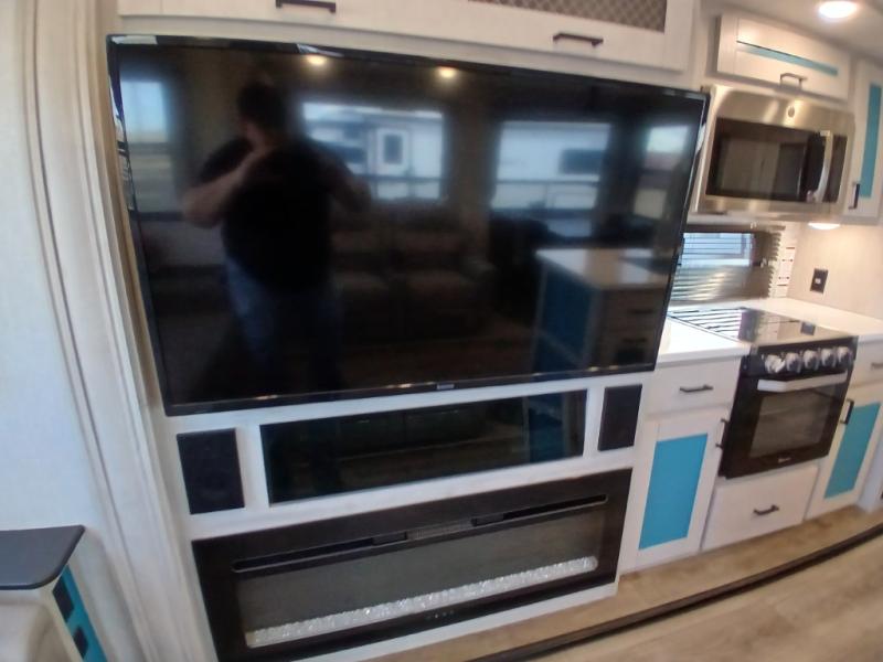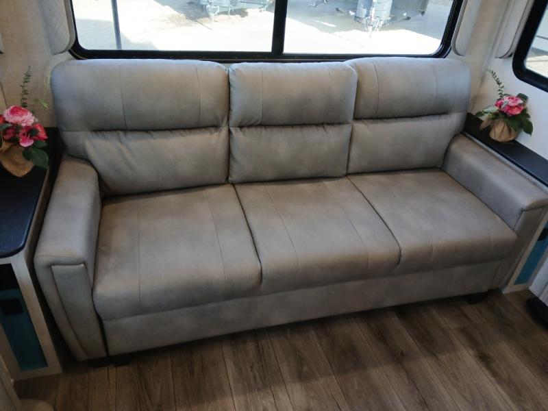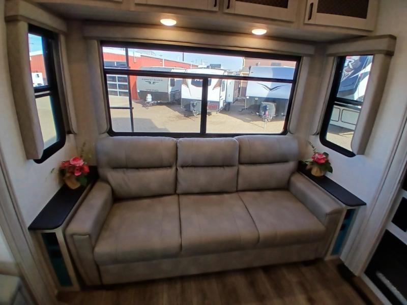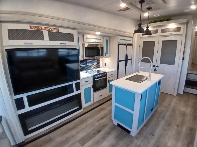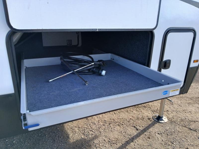Take this Tandara fifth wheel out to the campsite and experience luxury while you camp! You will have a master suite that is quite impressive with its full-width wardrobe, king bed slide, under-bed storage, and private entrance into the dual-entry bathroom. The kitchen island is easy to gather around while you're cooking dinner or enjoying a late-night snack, and the hide-a-bed sofa will be comfortable for lounging or sleeping. As you spend time outside under the two electric awnings, you can grab some extra charcoal or camping chairs from the oversized pass-through storage.