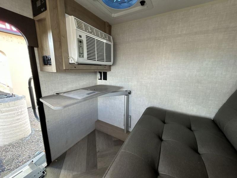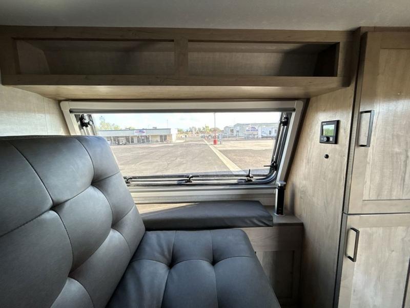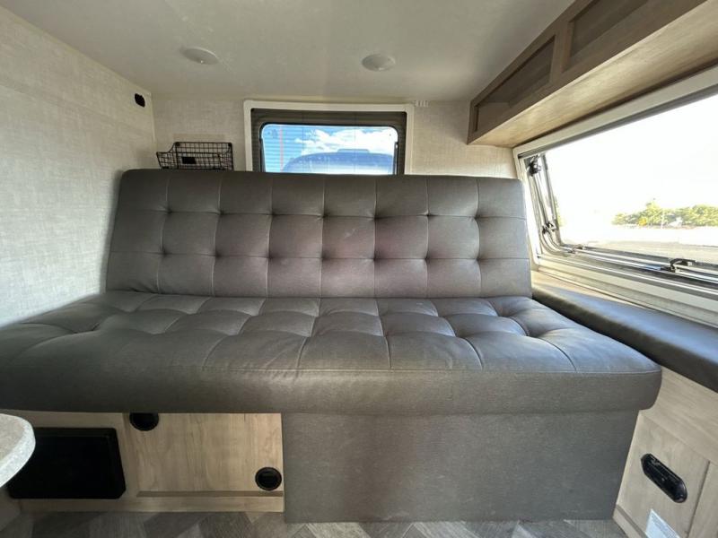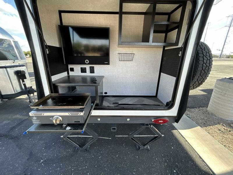 If you desire camping in the woods with your favorite person then you need this travel trailer! You can rest up each night on the futon sofa with an overhead shelf and nightstand nearby to set your glass of water. There is also a wardrobe to keep your clothes looking nice and a mobile desk/table to get some work done or eat a meal that you prepared with the rear outdoor kitchen. You even have a Camco DC 12V/AC 110V portable 75- liter refrigerator/cooler/freezer to keep your perishables fresh and a 12V HDTV with a built-in Bluetooth soundbar AV system to crank up the tunes while you cook. The front exterior not only has a lockable gear box, but also a pass-through storage area for all of your camping essentials!