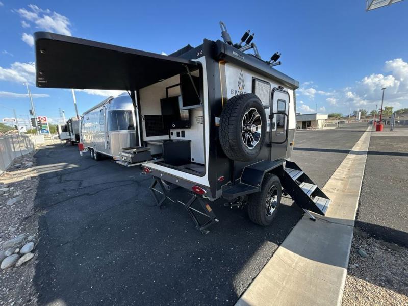Head to the great outdoors in one of these Ember RV Overland Micro Series travel trailers! The CURT independent suspension comes with heavy-duty coil springs with dual shock absorbers on each wheel. With a heavy-duty off-road tube steel frame and five sided aluminum construction, you can be sure they will hold up for every adventure. You can go to the campsite or go off the grid with Go Power!® 190W rooftop solar panel, 30 amp solar controller, and 1,000W Pure Sine wave inverter. Your units vitals will be protected by the enclosed radiant barrier underbelly and you will be protected by the manual Thule® outland awning. Keep the dirt outside where it belongs with the outside shower, but there's no need to worry if some is tracked inside thanks to the easy to clean Shaw flooring. Come choose your favorite model today!