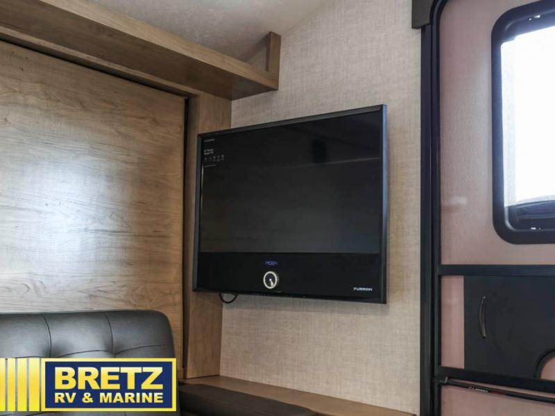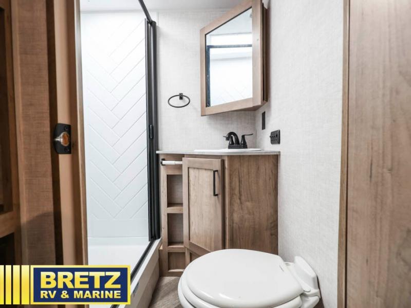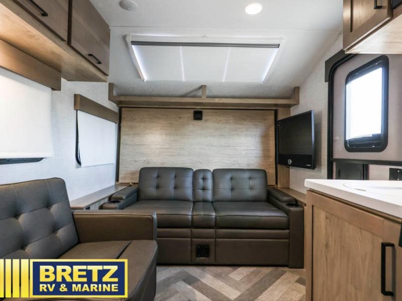 Enjoy a home away from home with the whole family in this travel trailer! Lay your head at night on the front queen bed and gaze up at the stars through the "Stargazer" skylight or watch a movie with the 12V HDTV with an AV system. Two others can sleep on the set of bunk beds and the lower bunk can even fold for storage, plus there is an exterior storage door by the lower bunk area. Freshen up each morning in the rear corner bathroom featuring a 24" x 40" shower and then grab some eggs from the 8 cu. ft. refrigerator to fry up on the two burner cooktop. You can enjoy your meals at the jackknife sofa with removable table. This can also double as extra sleeping space at night!