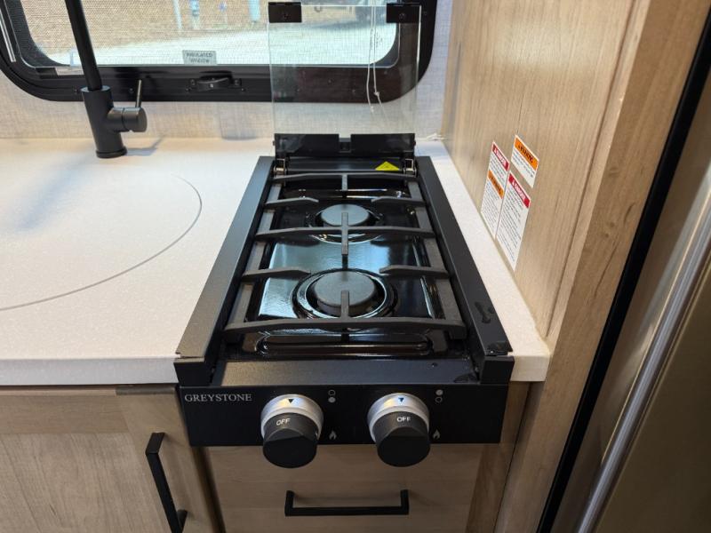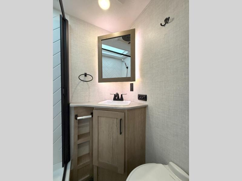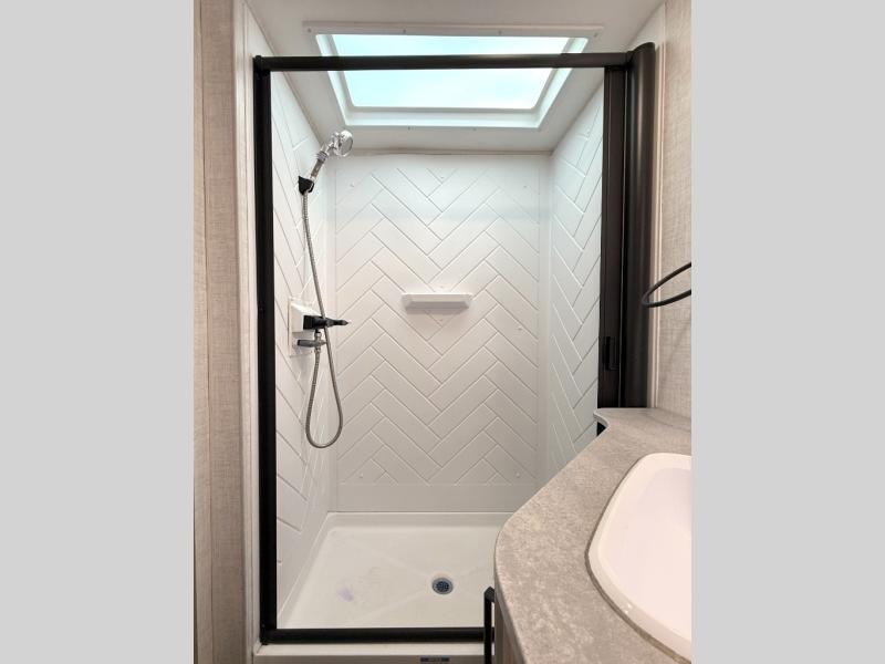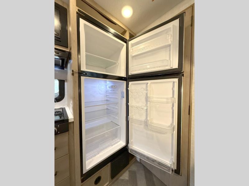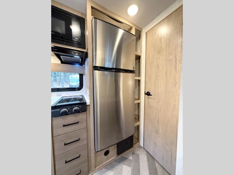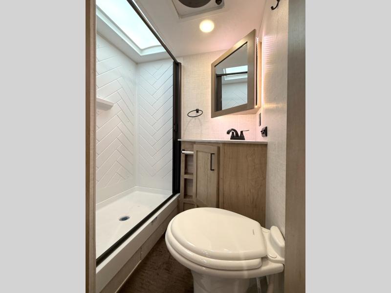 Enjoy a home away from home with the whole family in this travel trailer! Lay your head at night on the front queen bed and gaze up at the stars through the "Stargazer" skylight or watch a movie with the 12V HDTV with an AV system. Two others can sleep on the set of bunk beds and the lower bunk can even fold for storage, plus there is an exterior storage door by the lower bunk area. Freshen up each morning in the rear corner bathroom featuring a 24" x 40" shower and then grab some eggs from the 8 cu. ft. refrigerator to fry up on the two burner cooktop. You can enjoy your meals at the jackknife sofa with removable table. This can also double as extra sleeping space at night!