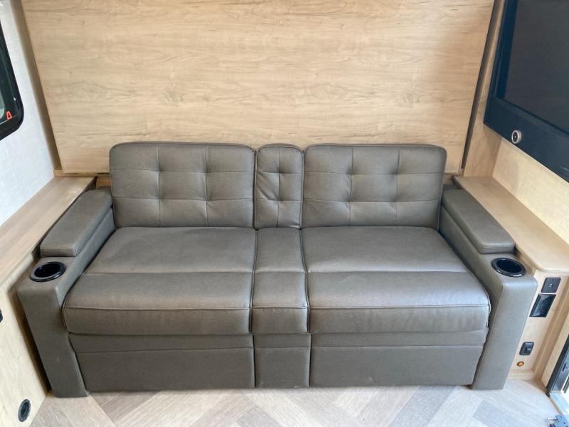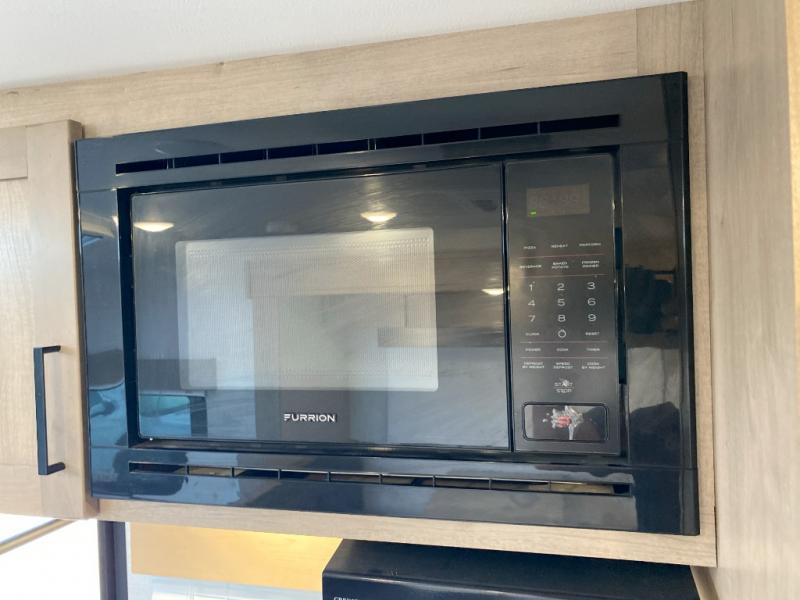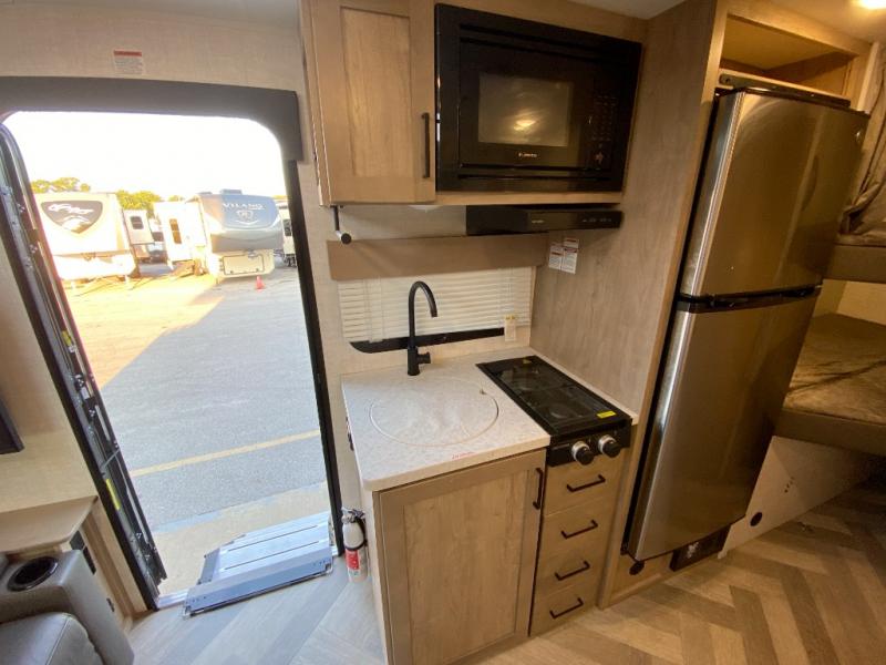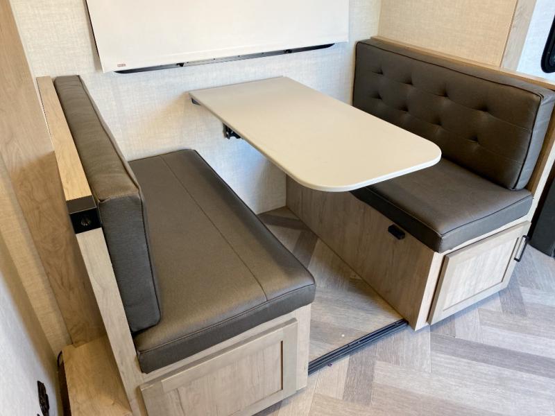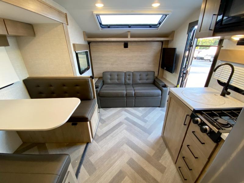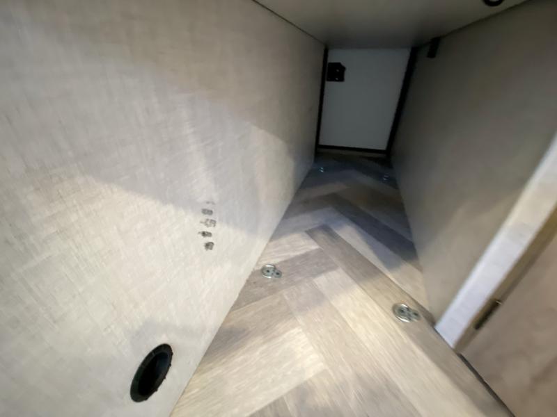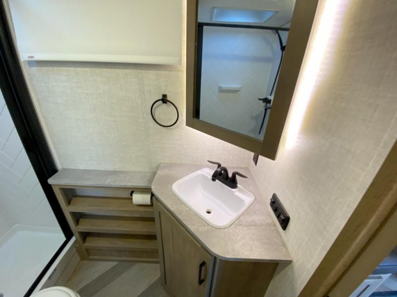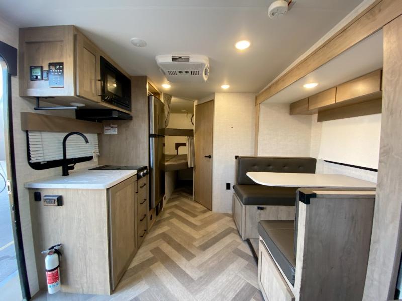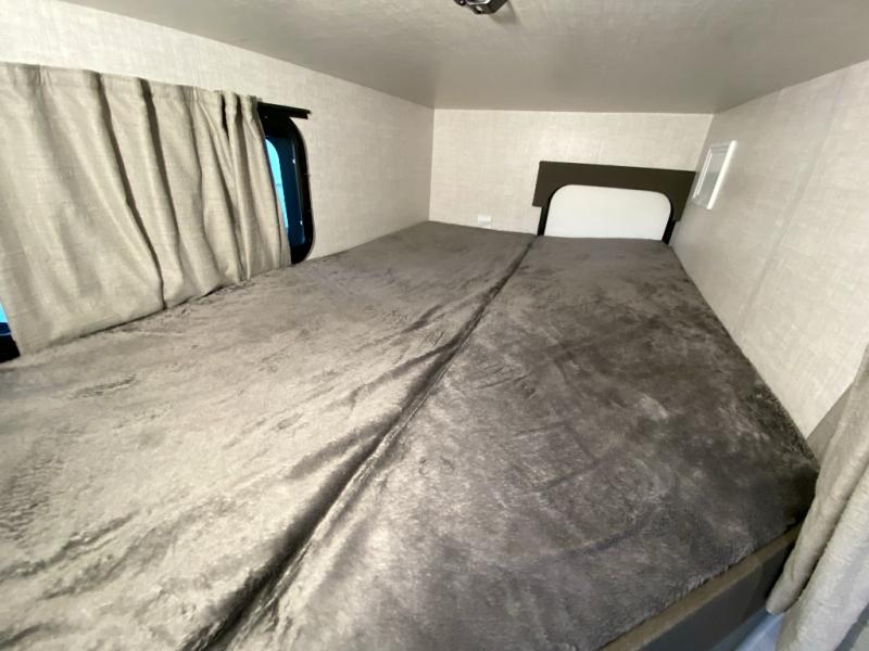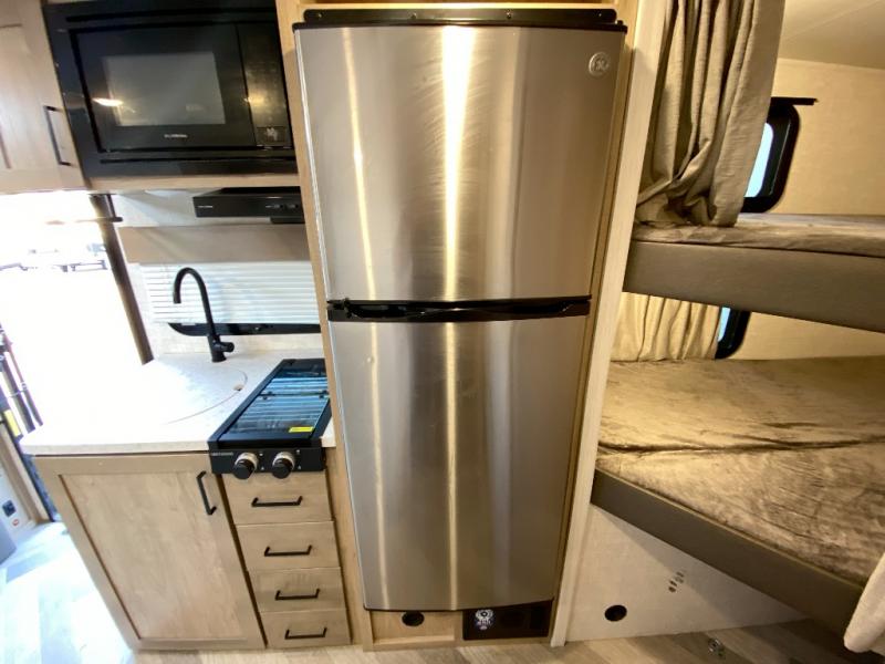 The whole gang can camp together comfortably in this travel trailer! The kids or guests can sleep on the double bunk beds with the lower bunk being able to fold for storage, and you can sleep on the front 60" x 80" Murphy bed with a "Stargazer" skylight above it to look at the beautiful stars as you drift off to sleep. The legless booth dinette slide also offers a comfortable place to sleep once converted. Everyone can get cleaned up in the rear corner bathroom with the 24" x 40" shower, and keep their bellies full with the 8 cu. ft. refrigerator and two burner cooktop. Plus, there is an outside kitchen with a 1.6 cu. ft. refrigerator and an optional griddle. The exterior kayak/bike storage door and exterior pass-through storage area lets you bring along the necessary gear to explore more!