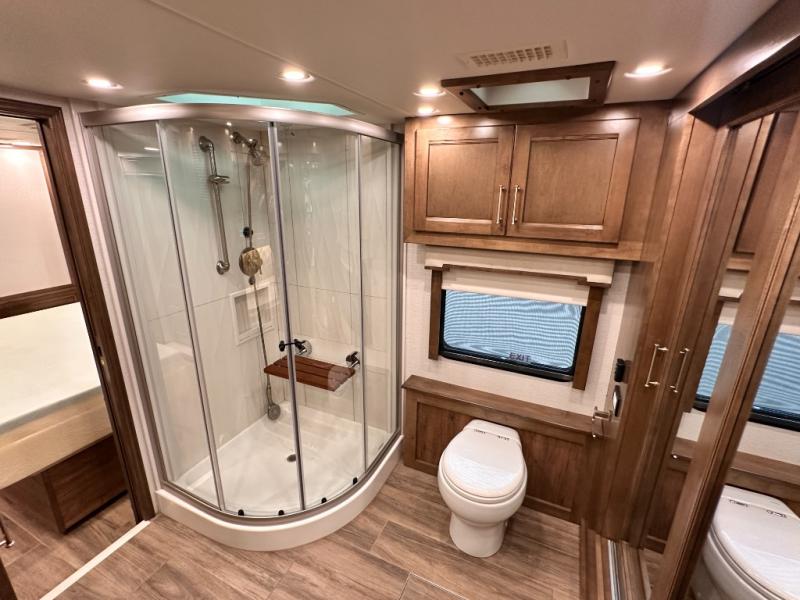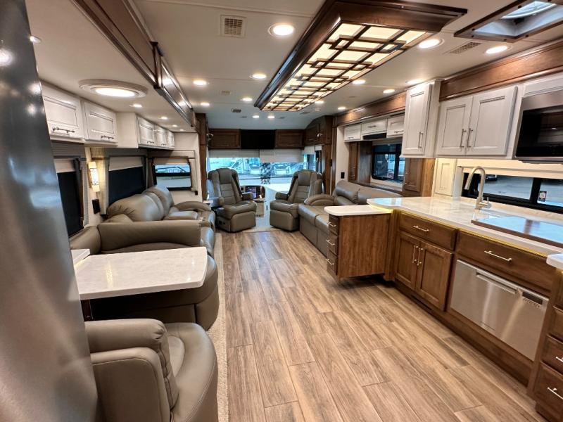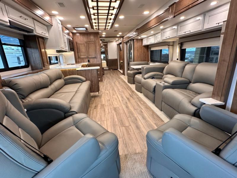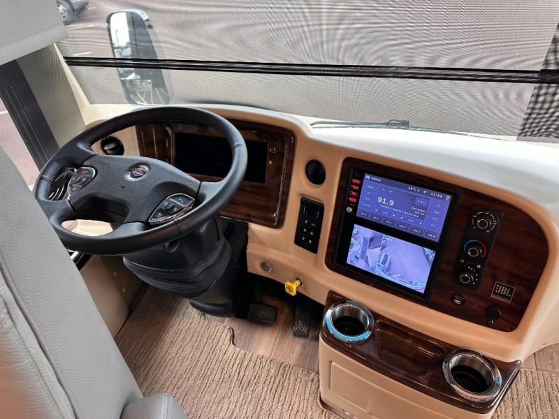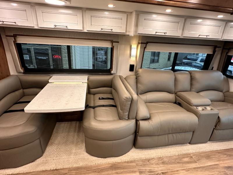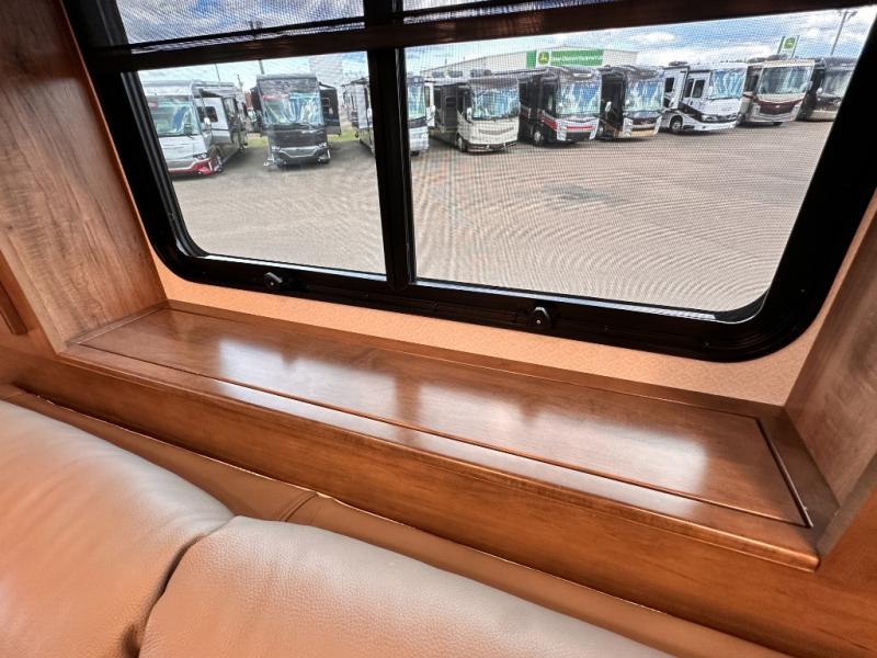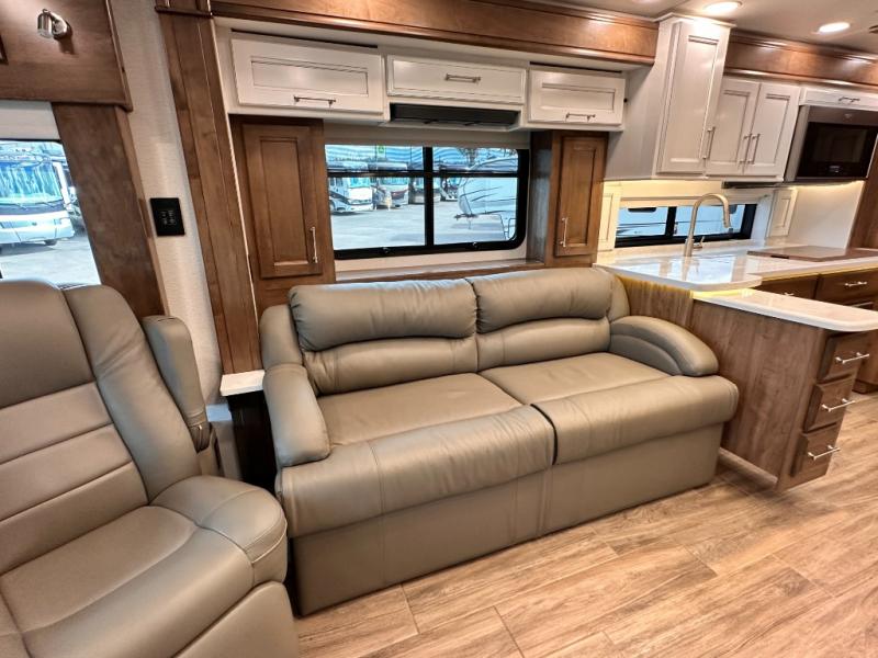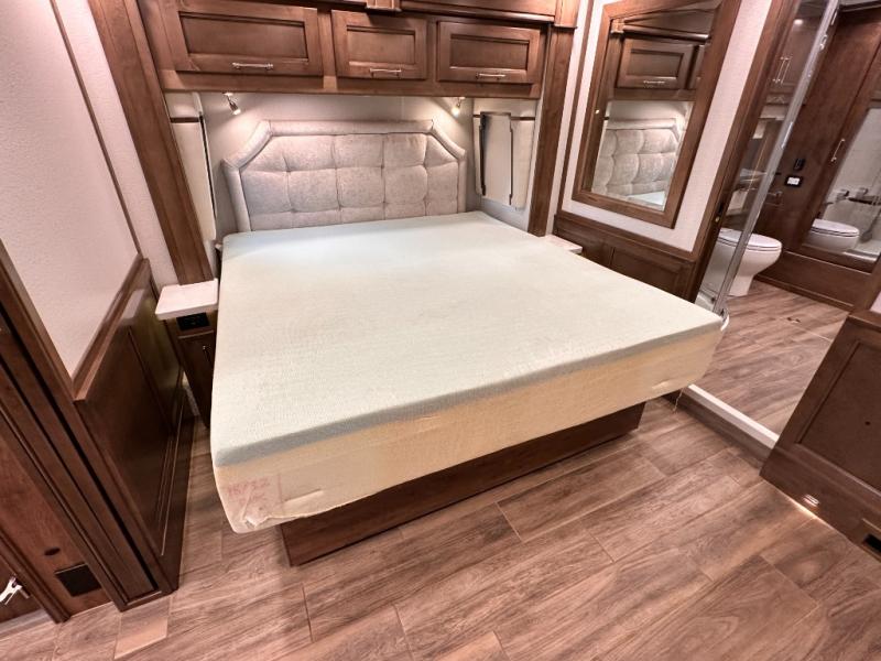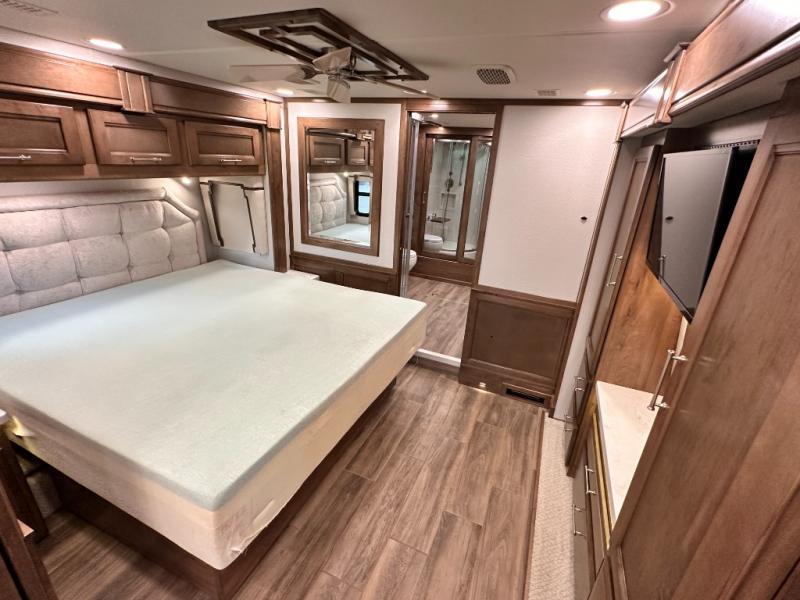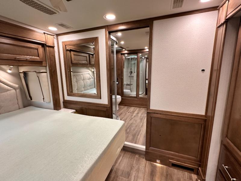The Aspire Class A diesel motorhome by Entegra Coach starts with a Spartan K2 raised-rail chassis and a Cummins L9 turbocharged 450 HP engine to bring power to your adventures. The cockpit is packed with features to make each trip enjoyable, like the Xite XSG4 infotainment system, the E-Z Steer adjustable power steering assist, and the JBL premium audio 5-speaker sound system to crank up the highway tunes. Each model includes Aqua-Hot heated basement storage, three 15,000 BTU A/C units, an Onan 10,000-watt diesel generator, and many more hassle-free utilities. You will fall in love with the Aspire interior that features premium leather Villa furniture, solar day shades and blackout night shades, a textured porcelain tile shower with a skylight and clear glass door, and a large cedar-lined wardrobe in the bedroom.