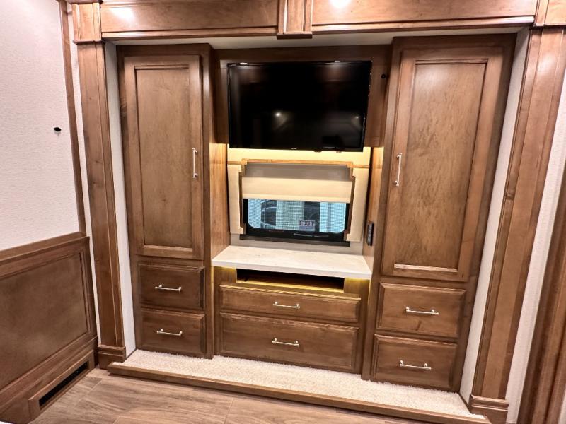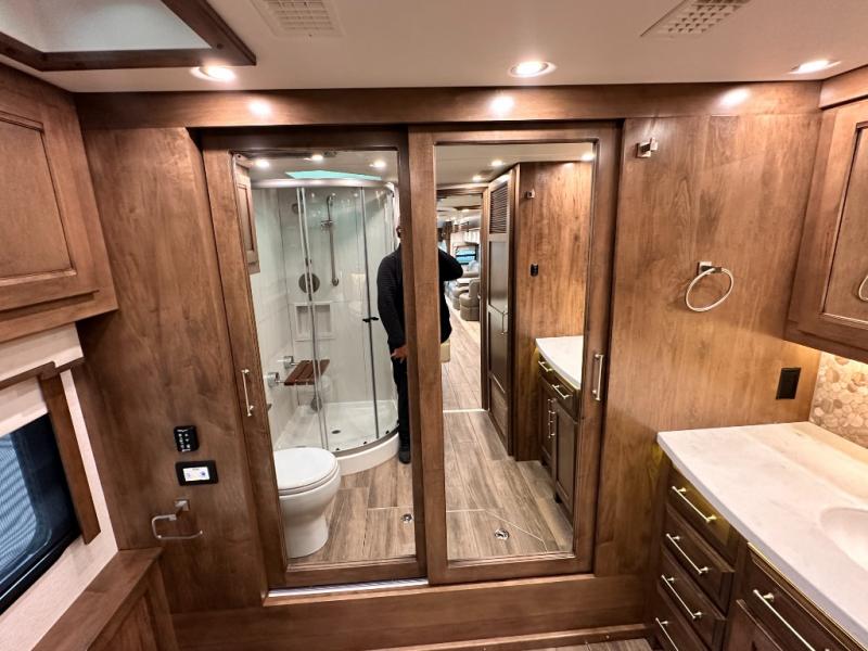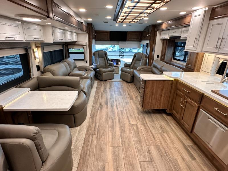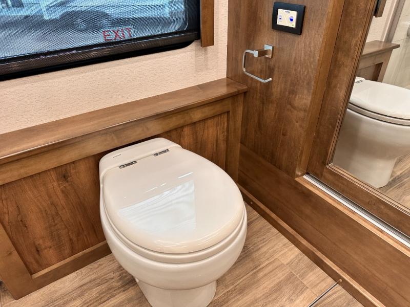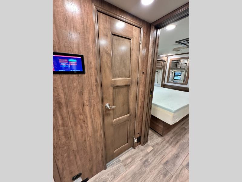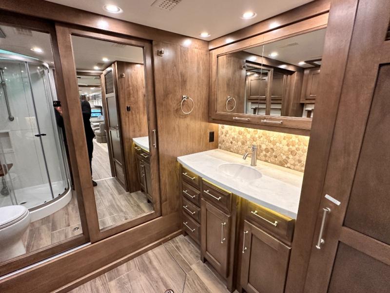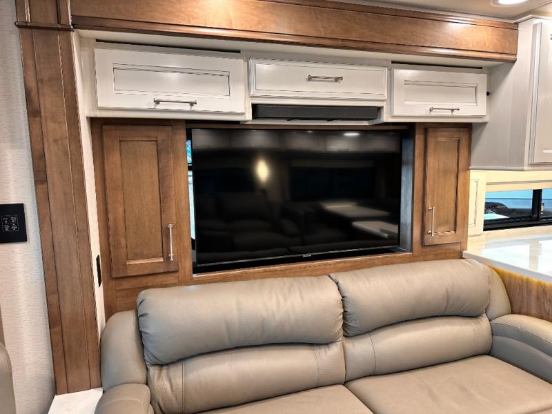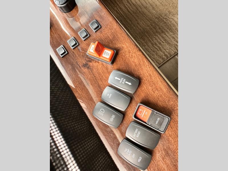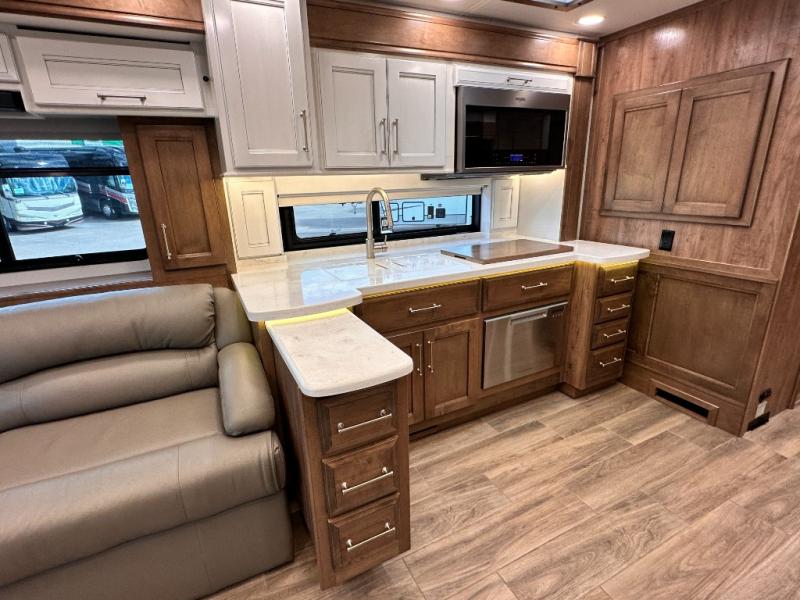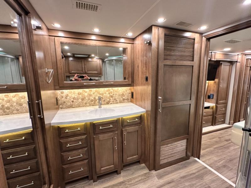 The Aspire Class A diesel motorhome by Entegra Coach starts with a Spartan K2 raised-rail chassis and a Cummins L9 turbocharged 450 HP engine to bring power to your adventures. The cockpit is packed with features to make each trip enjoyable, like the Xite XSG4 infotainment system, the E-Z Steer adjustable power steering assist, and the JBL premium audio 5-speaker sound system to crank up the highway tunes. Each model includes Aqua-Hot heated basement storage, three 15,000 BTU A/C units, an Onan 10,000-watt diesel generator, and many more hassle-free utilities. You will fall in love with the Aspire interior that features premium leather Villa furniture, solar day shades and blackout night shades, a textured porcelain tile shower with a skylight and clear glass door, and a large cedar-lined wardrobe in the bedroom.