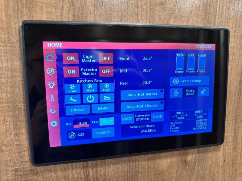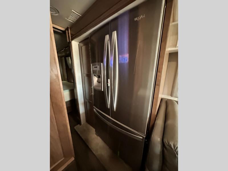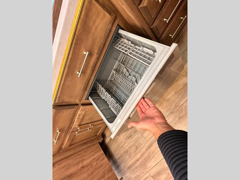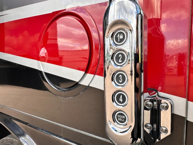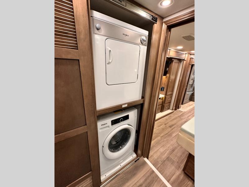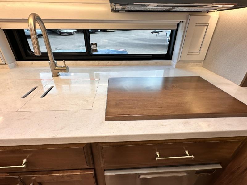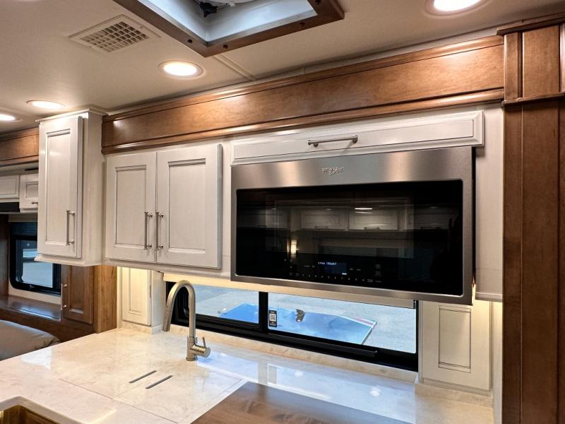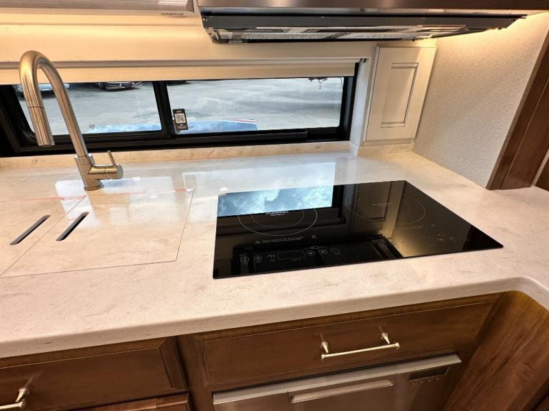 Four slides for tons of space, a full bath plus a half bath, and sleeping space for five make this coach a dream come true. Once you arrive at the campground, set up the power patio awnings while the kids ride their bikes. Everyone will enjoy the exterior 43" TV, plus there are three more TVs inside as well. Prepare lunch on the induction cooktop, or use the Whirlpool convection microwave. The kitchen also includes a Fisher and Paykel dishwasher, a deep drawer for a waste basket with an easy access trash chute, and a residential refrigerator with ice and water in the door. Mom and dad will sleep soundly on the slide out king bed, while the kids take the hide-a-bed sofa or the second sofa. Family vacations just got sweeter in this Aspire motorhome!