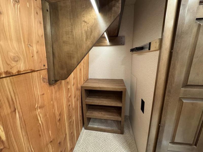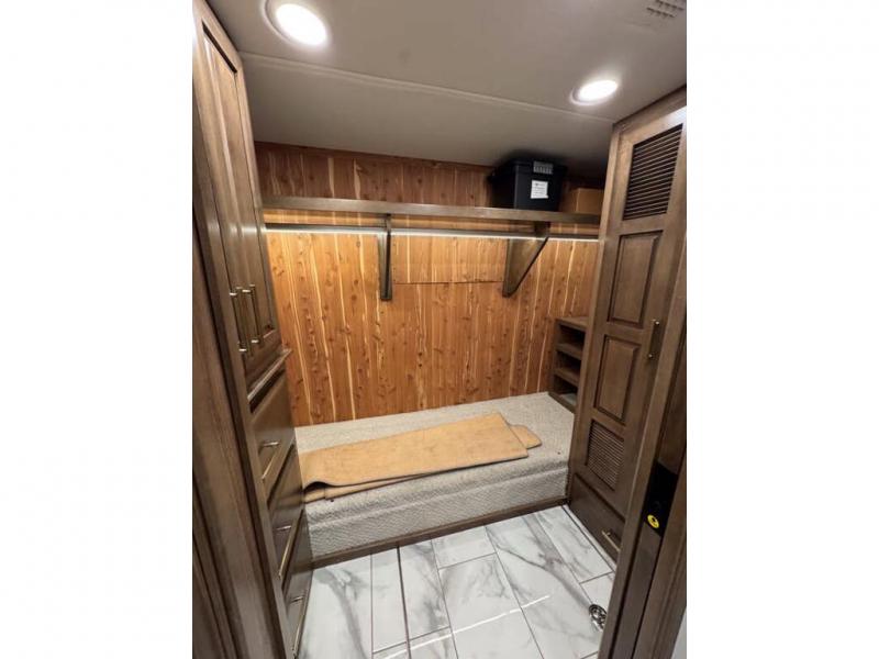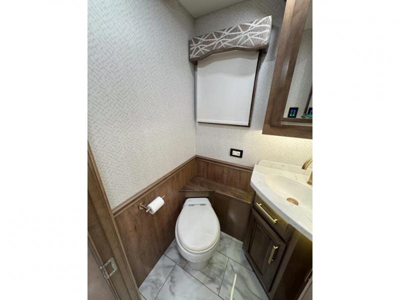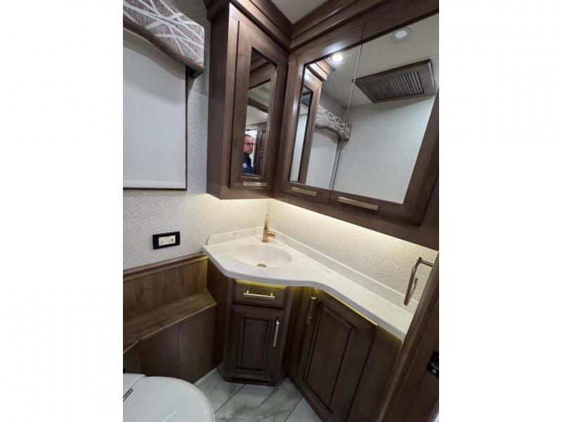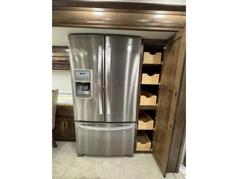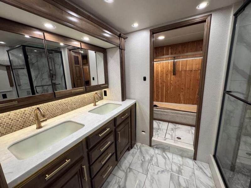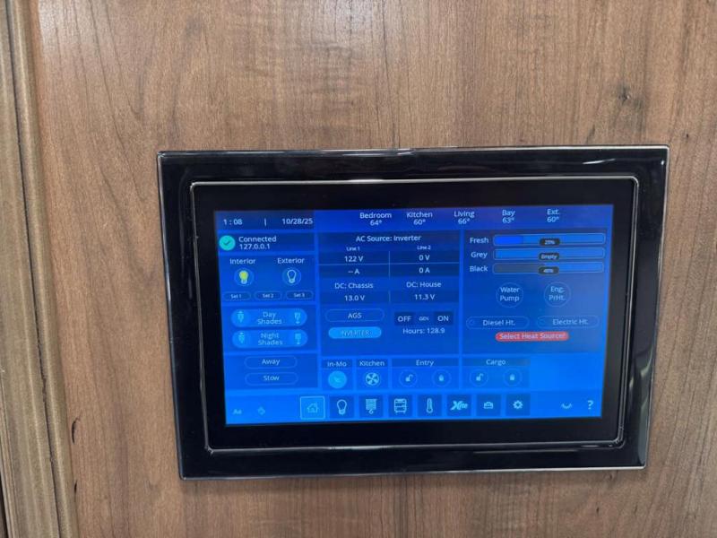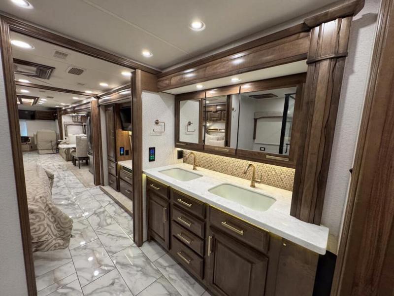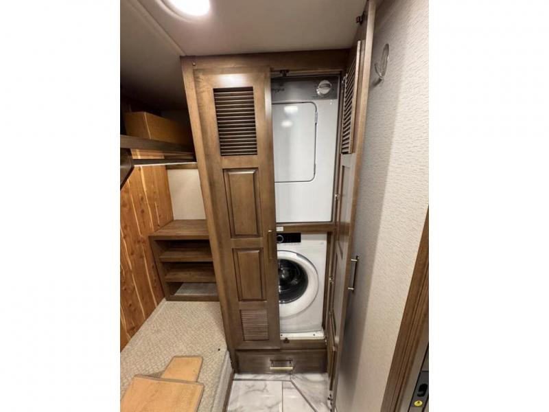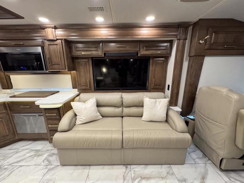 This motorhome with four slides is your ticket to luxurious camping or full-time RV living. Once you arrive at your destination, you may want to get cleaned up in the full bath. Here, you'll find dual bath sinks, porcelain tile shower walls, a skylight, and a Maxxair Deluxe power exhaust vent fan to keep everything fresh. There is also a large walk-in wardrobe with plenty of storage and a Whirlpool stacked washer and dryer if you need to get a load done. Head to the main living area to relax on the hide-a-bed sofa, the sofa with ottomans, or at the free-standing table with an expansion. The induction cooktop and Whirlpool convection microwave will allow you to cook up your best meals, and the Fisher and Paykel dishwasher will make clean up easy as 1-2-3!