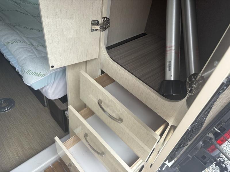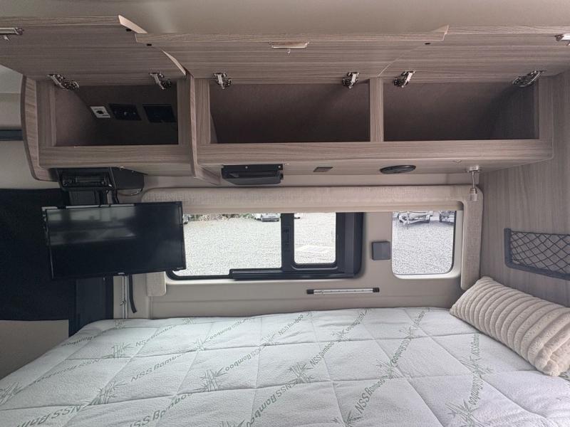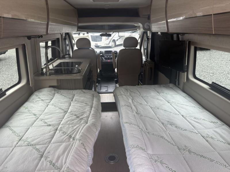 Your trek across country is made comfortable in this coach for two. You can swivel the captains seats around when you get to your destination, or head outdoors to sit under the 13' Thule armless awning with LED lights. The flip-out table indoors will provide a space for your coffee in the morning, while breakfast is being cooked in the convection microwave or on the two burner cooktop. A rear wet bath will allow you to stay clean throughout your trip, and you'll find plenty of storage space for your belongings. You'll love the versatile sleeping arrangements in this model; twin beds with adjustable headrests, and a Froli sleep system with a filler cushion to convert to a king-size bed. Don't pass up this coach!