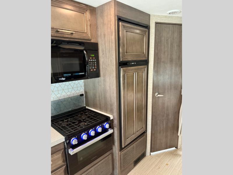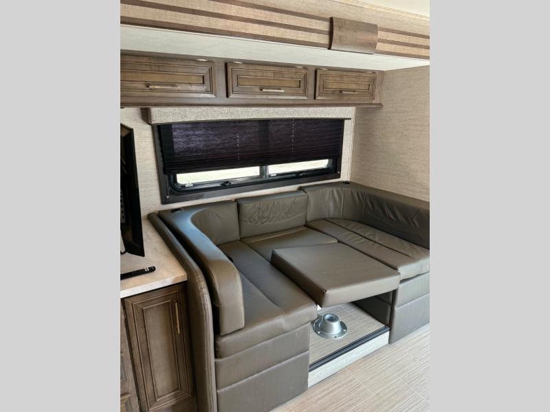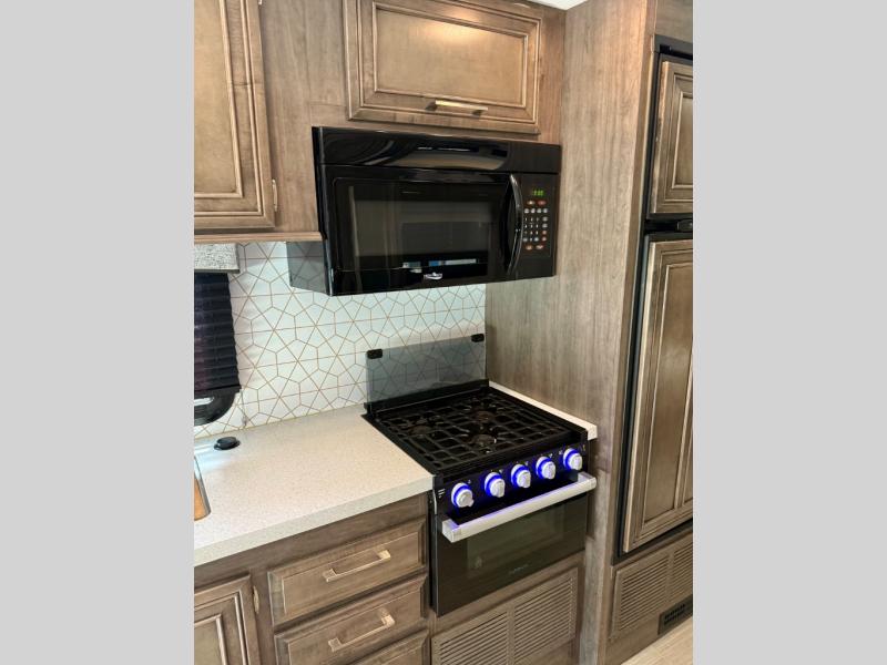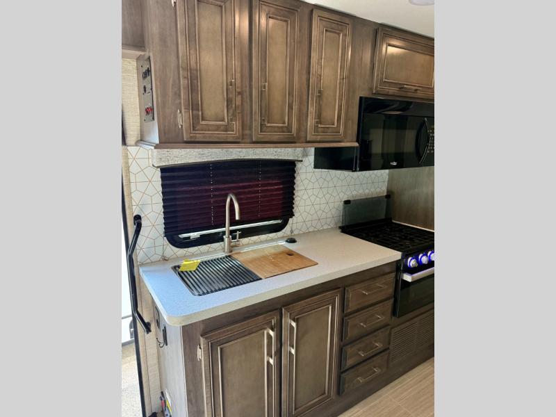 With any Odyssey Class C gas motorhome by Entegra Coach, the driver will appreciate the power from the 350 HP engine, the towing capacity from the 7,500 lb. hitch, the Tire Pressure Monitoring system, the navigation from the Sony infotainment center with Apple CarPlay and Android Auto, plus the backup and side-view cameras when parking and driving down the highway. The kitchen offers full amenities including a recessed stainless steel sink with a cutting board sink cover, LED-lite pressed countertops, a decorative backsplash, and a pop-up charging station with 110 outlet and USB plugs to keep your smart phones charged. Get ready for luxury in a Class C, choose your favorite today!