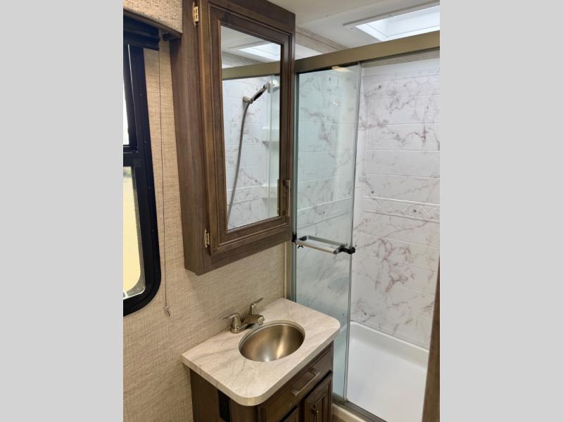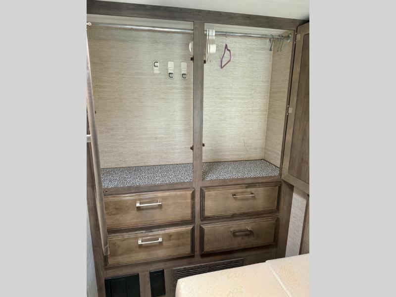 Looking to travel to see family and friends while stopping along the way to take in the scenery? Need comfortable accommodations for you and another plus extra sleeping space when you have overnight guests? This coach provides a full-wall slide for more interior floor space and includes a queen bed for a good nights sleep, a wardrobe for clothing, plus a U-shaped dinette and pantry. The dinette doubles as sleeping space, plus you have a cab-over bunk. The cook will have everything nearby to whip up meals including a residential-size microwave, and the full bathroom allows everyone to skip the public facilities along the way.