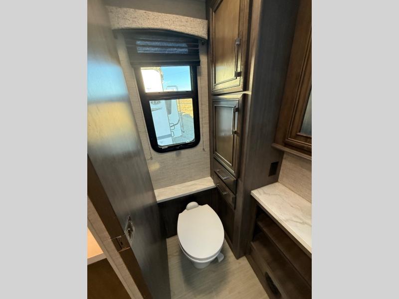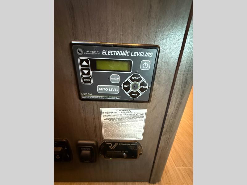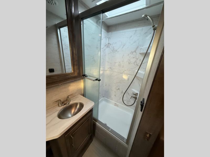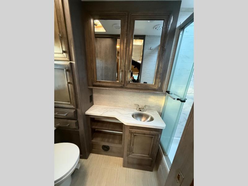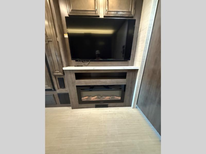 Enjoy a whole lot of comfort, fun and versatility in this coach from the queen Murphy bed and sofa combination allowing you to create a living area and a bedroom when you want, having a fireplace and an LED HD Smart Fire TV to watch inside, to the outside kitchen, exterior TV and 19' electric awning providing you an outdoor living space to enjoy nature and its beauty. The inside also provides a rear full bathroom including a space saving sliding door, linen storage, counter space for toiletries and a shower. You can dine at the U-shaped dinette or while sitting on the swivel captains chairs, and the cab-over bunk will be a perfect place for two to stay the night.