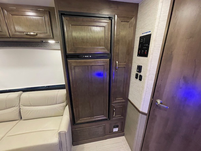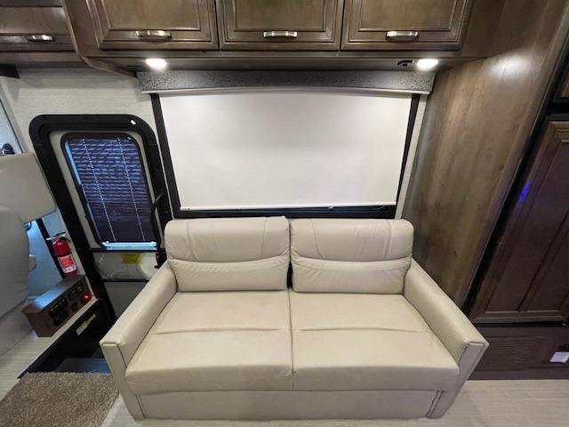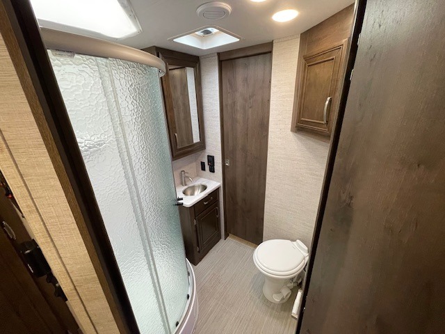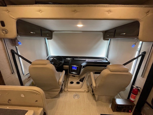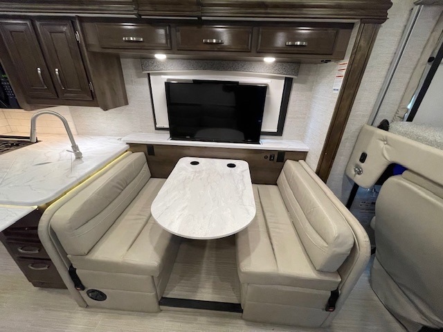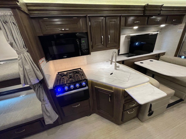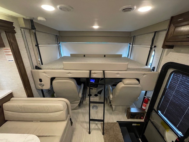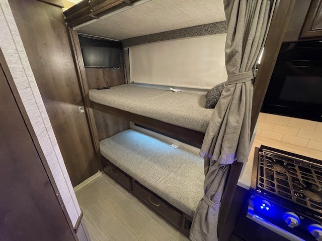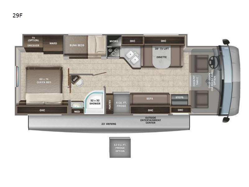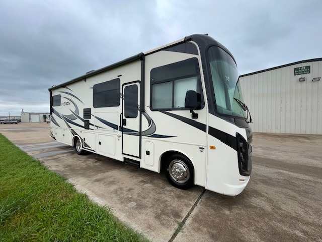 Enjoy a full weekend of excellent amenities in this Vision Class A gas motorhome! There is enough sleeping space for the whole crew with the bunk beds, RV queen bed, booth dinette, and sofa, and you can even add some more room for tired travelers by tacking on the optional bunk above the cab too. The dual-entry bathroom can be accessed from the main living area as well as the rear bedroom which adds more convenience. There is a Sony infotainment center with Apple CarPlay and Android Auto in the cockpit to help you as you drive, and you'll also find the backup and sideview cameras to be useful when you're parking. A 23' electric awning will protect you while you're outside watching the exterior LED TV, and you can change out the standard 8-cubic foot refrigerator for an optional 12-cubic foot refrigerator if you would prefer.