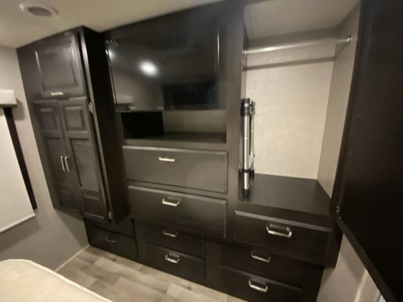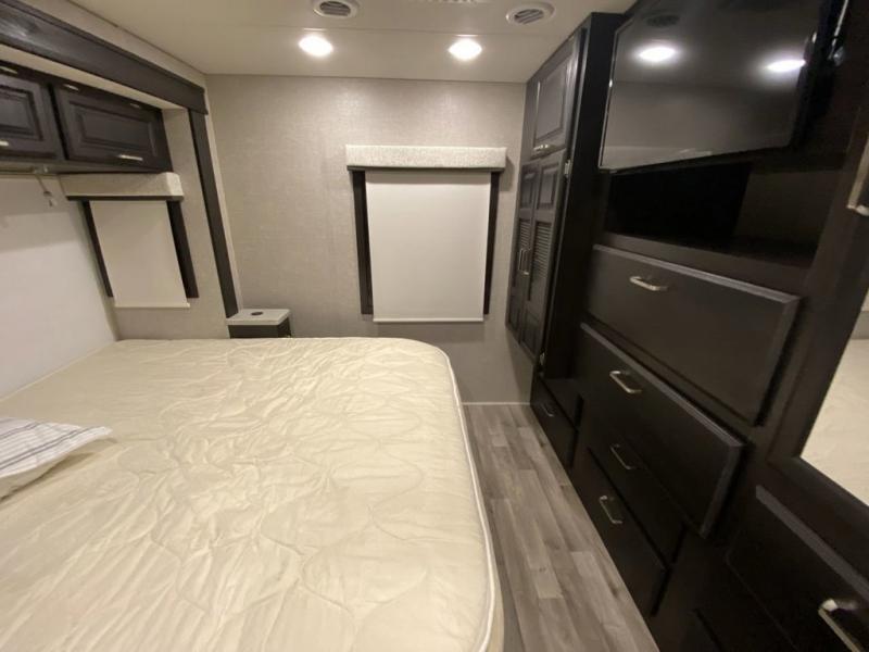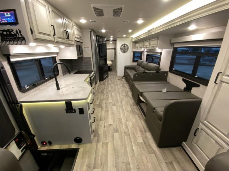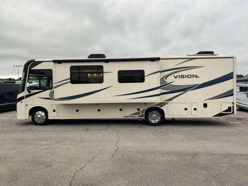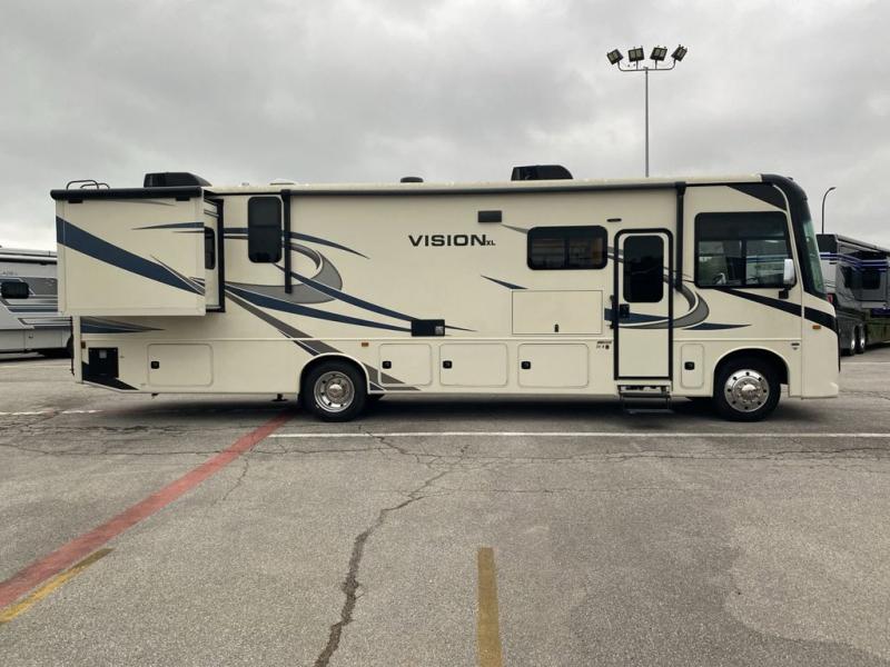 You'll have quite the adventure touring the country in this Vision XL Class A gas motorhome! Go out alone, or invite a few extra travelers to join you and crash on the expandable sofa or booth dinette. You can even add some more sleeping space for friends or kids by choosing the drop-down overhead bunk option. It will be a piece of cake to enjoy a piece of cake because the Furrion all-in-one cooktop and oven, the 21-cubic foot residential refrigerator, and the residential microwave will give you everything you need to prepare a batter and bake it. You can even keep some sugar and flour stored in the pantry. You'll also be able to stay entertained throughout each trip by using the 39" LED HD Smart Fire TV in the living area, the LED TV in the bedroom, and the exterior LED TV.