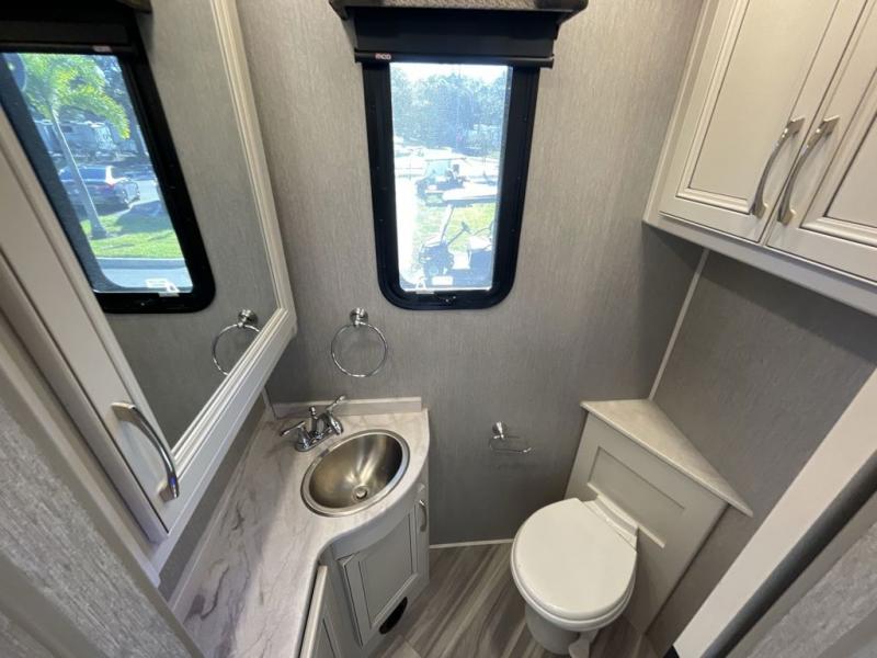 Looking for a spacious RV with a mid-coach entry, four distinct areas, and offers a way to work while on the road plus be able to host a dinner party for friends and family? This Bounder gives you all that and so much more like a stainless steel farmhouse sink, a solid surface top in the galley, and full extension drawer guides with latches, plus full amenities to make any meals including a convection microwave and residential refrigerator. The split bathroom is super convenient when trying to get ready in the mornings. One person can be washing their hands in the private sink and toilet room while another person can be using the second sink beside the neo-angled shower. Yet you can also close two sliding doors to make this one big bathroom for yourself. And the multi-purpose Adapt-table dinette allows you to work or eat breakfast for two, and you can easily swing the table out vertically to host four. The rear bedroom offers a slide out king bed, plus plenty of storage and an LED TV to watch before falling asleep. If you like to host overnight guests, the jack knife sofa is available, and you might like to add the optional Hide-A-Loft power drop-down overhead bunk so they have that choice as well.