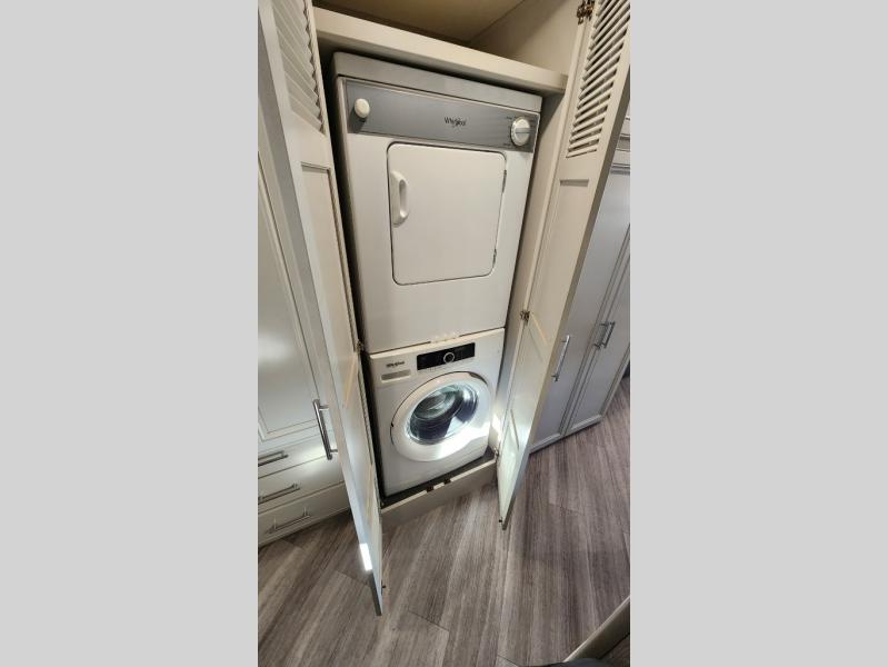 The Fleetwood Fortis Class A gas motorhome is a powerhouse of luxury and convenience, and it also is quite literally a powerhouse with its Ford 7.3L Triton V8 350HP engine with 468 LB/FT of torque. The construction includes a Dryseal edge coating for all ceilings, walls, and floor, and the Powerlock System 2 has interlocking walls to the roof for stability. Automatic hydraulic leveling jacks make the set-up process easier, and the cab has excellent features, like a Sony 9" stereo with AM/FM/Bluetooth, backup camera, reclining/swivel cab seats, driver/passenger center table, a front power roller shade, and an automotive-style dash with dual monitors and workstation. You will find vinyl tile flooring all throughout the interior, as well as full-extension drawer guides with latches, coordinating window treatments, and energy-efficient LED flush-mount ceiling lighting.