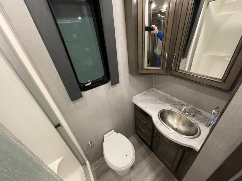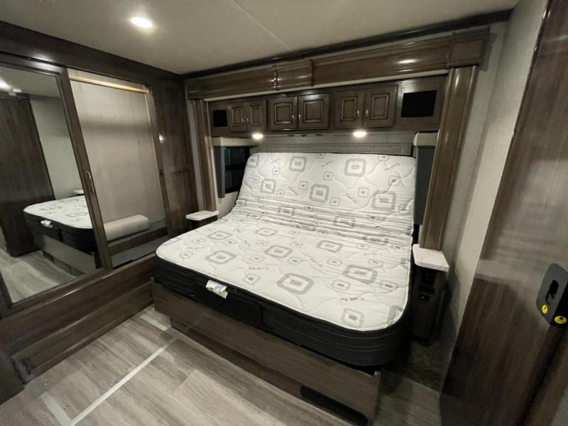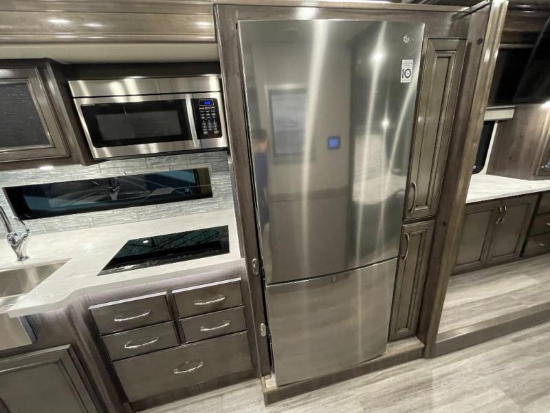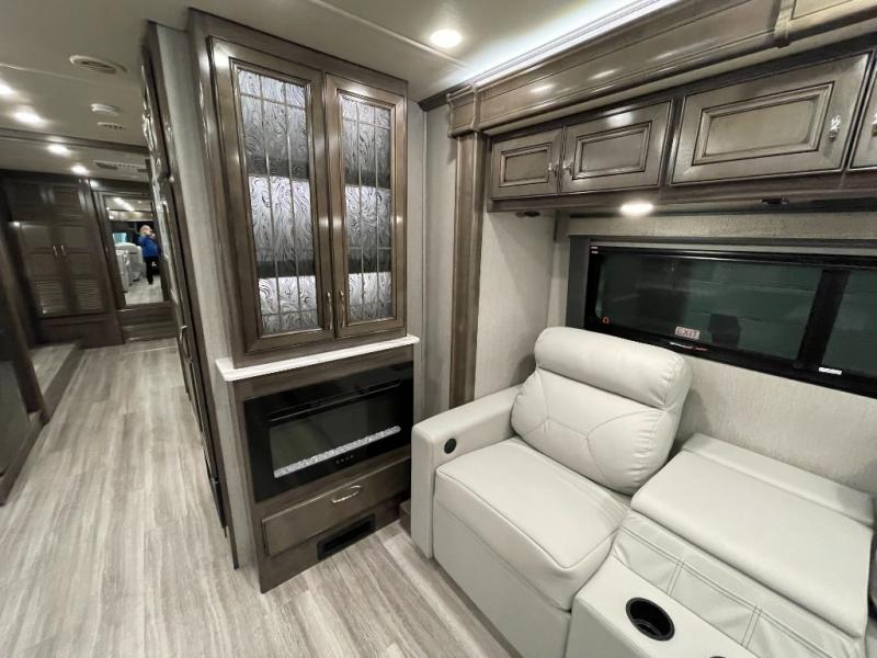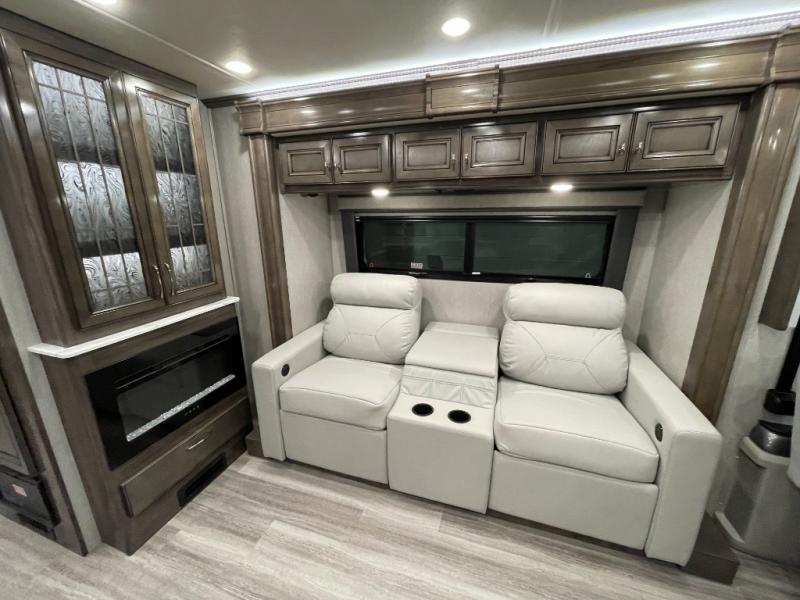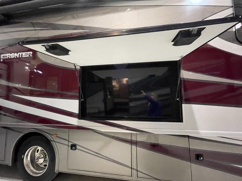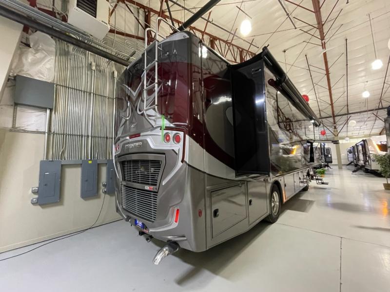 Looking for a couples coach or a family RV that offers everything you want plus more? Look no further! You can travel in style with the beautiful interior and exterior, and relax in comfort on the sofa sleeper with pull-out queen bed and the jackknife dinette as well as captain's chairs. Everyone can visit and watch the 50" pop-up LED TV and stay cozy from the fireplace while the cook makes a meal in the kitchen using the induction cooktop and convection microwave. No problem with beverage and leftover storage with a residential refrigerator, and your snacks will fit nicely in the pantry. The full bathroom offers a seated shower and pocket door. The kids or your guests can sleep on the furniture once setup for bedtime, and you will have your own privacy in the rear bedroom with a Encore Series king bed, as well as plenty of storage in the full-length wardrobe, and dresser. There are several options to choose from to customize your Frontier such as adding a stackable washer and dryer, a Hide-A-Loft drop down queen bed with 32" LED TV, a central vacuum system, and/or the Connectivity package, plus more!