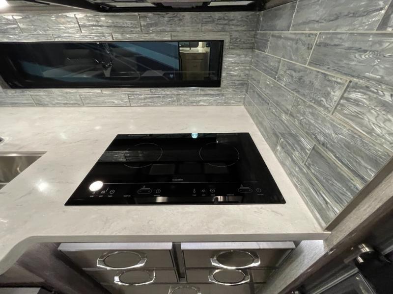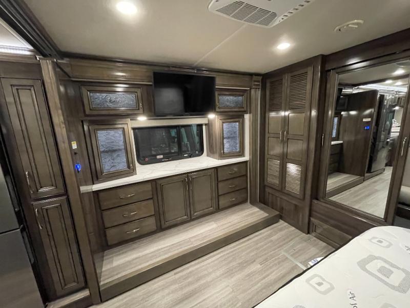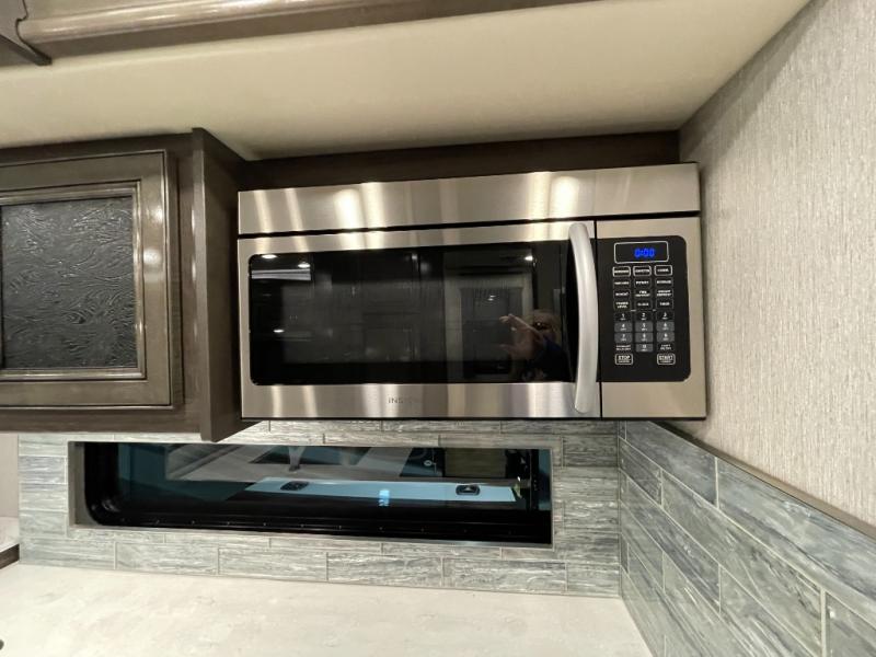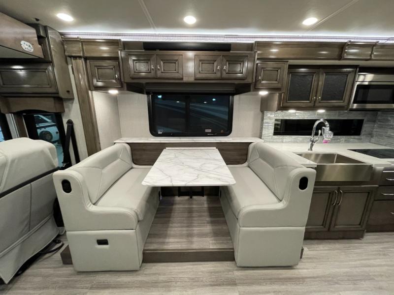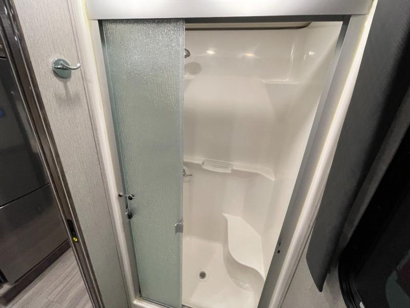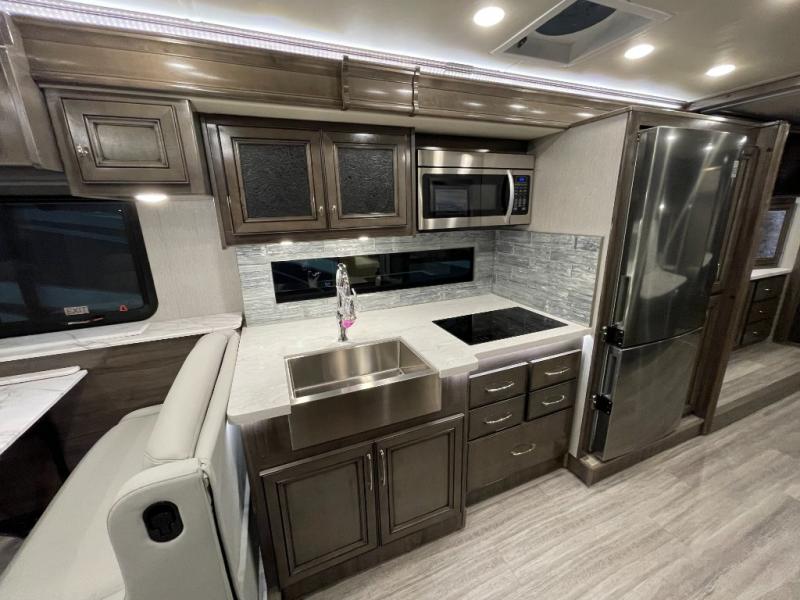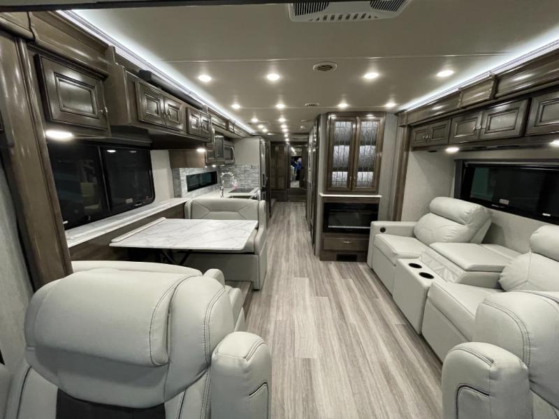Looking for a couples coach or a family RV that offers everything you want plus more? Look no further! You can travel in style with the beautiful interior and exterior, and relax in comfort on the sofa sleeper with pull-out queen bed and the jackknife dinette as well as captain's chairs. Everyone can visit and watch the 50" pop-up LED TV and stay cozy from the fireplace while the cook makes a meal in the kitchen using the induction cooktop and convection microwave. No problem with beverage and leftover storage with a residential refrigerator, and your snacks will fit nicely in the pantry. The full bathroom offers a seated shower and pocket door. The kids or your guests can sleep on the furniture once setup for bedtime, and you will have your own privacy in the rear bedroom with a Encore Series king bed, as well as plenty of storage in the full-length wardrobe, and dresser. There are several options to choose from to customize your Frontier such as adding a stackable washer and dryer, a Hide-A-Loft drop down queen bed with 32" LED TV, a central vacuum system, and/or the Connectivity package, plus more!