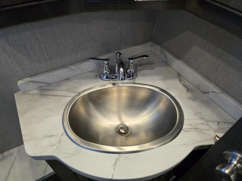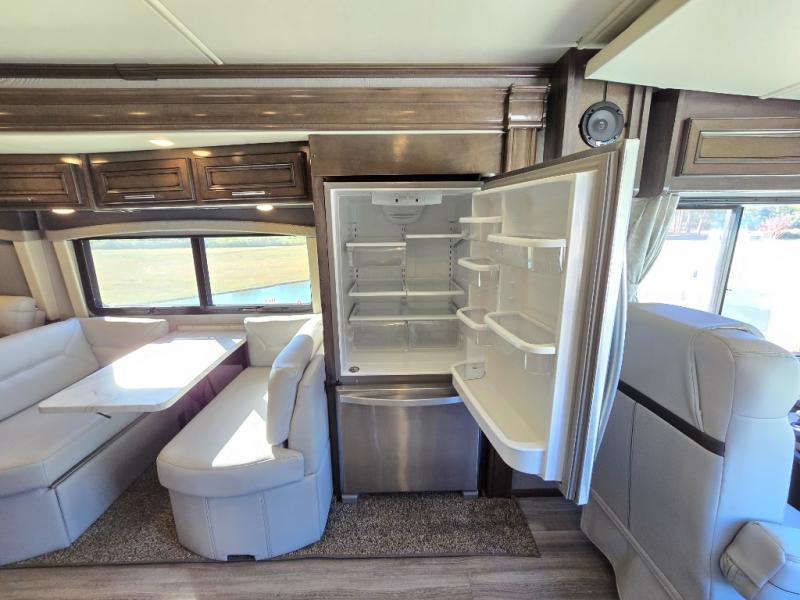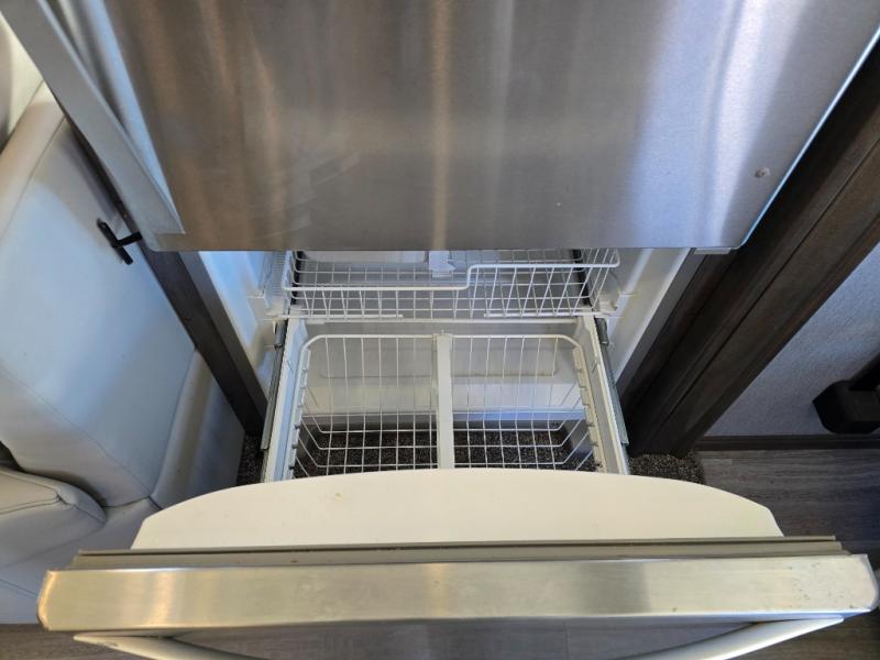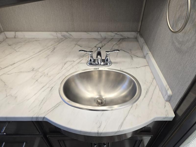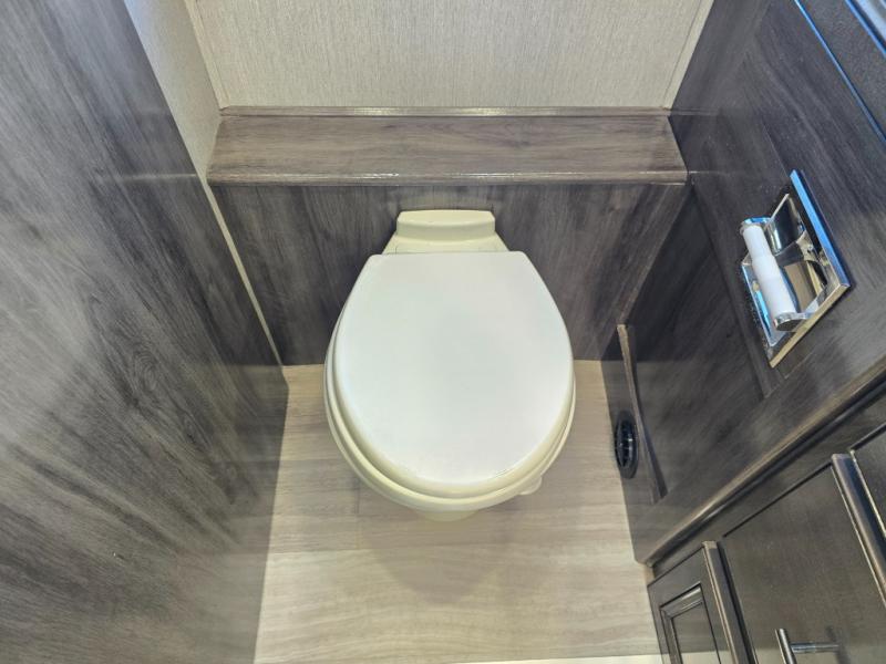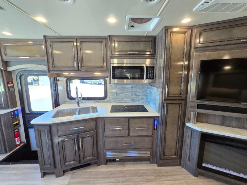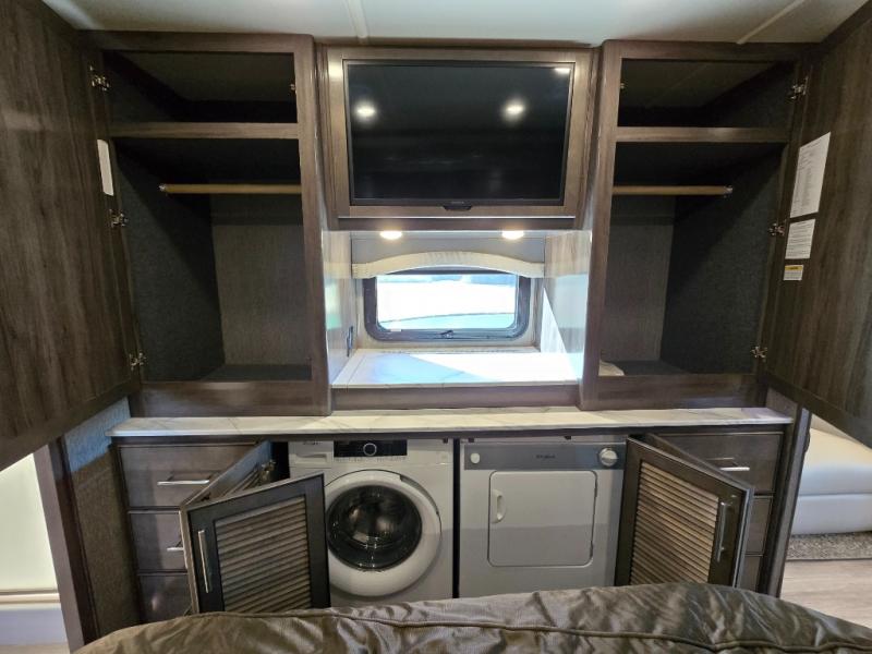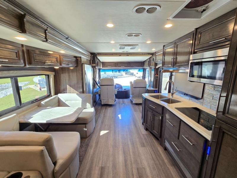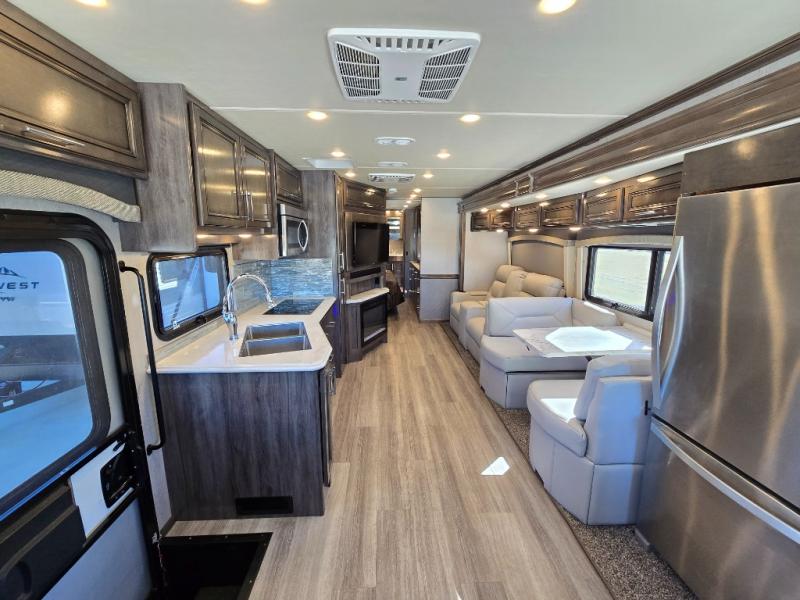 Looking for a spacious living and kitchen area in your next coach? This Pace Arrow provides that with the large slide that offers a sofa with a jackknife sleeper for overnight guests and a booth dinette, plus a residential refrigerator for lots of food storage. And the captain's chairs with pedestal table offer more seating when you have friends over to visit. The cook will love the galley kitchen with a convection microwave and induction cooktop, plus a pantry and a counter extension for more prep space. The handy half bath is mid-coach, and the master suite offers a 60" x 80" bed, wardrobes with a dresser, a 32" LED TV, and is a step away from the full bathroom. The exterior includes extra towing for your off-road toy trailer or a cargo rack for totes or even a vehicle, plus storage for outdoor chairs and such, a steel constructed entry step box, an electric awning with lighting and motion sensor retract, a Winegard 360-degree air antenna plus the coach is solar and satellite ready.