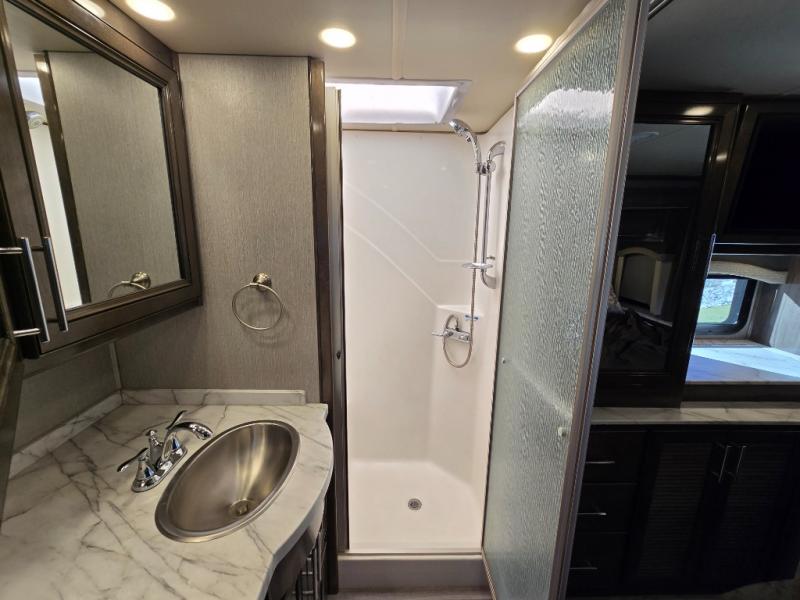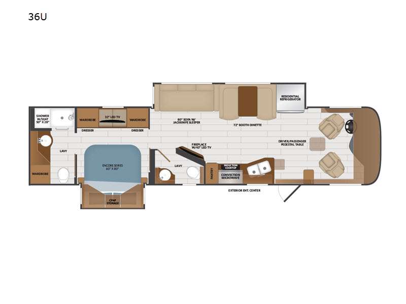 With any Pace Arrow Class A diesel motorhome, the exterior provides the Freedom Sport Foundation, a powerlock system, interlocking floors, walls and roof, auto leveling jacks for easy setup, a full-pass through storage with lighting for easy access day or night, and dual, ducted 15,000 BTU roof ACs with chill grill and rear heat pump for maximum comfort. Enjoy safer, smoother stops with the BrakeSync supplemental braking system, the ability to tow a commuter vehicle, a trailer with an off-road toy or a luggage cargo rack with the 10,000 lb. rated tow hitch, and the chassis integrated air supply for your tow vehicle brake system. The interior offers an electronic information center, composite tile Tarkett flooring, full kitchen and bath amenities, plus so much more!