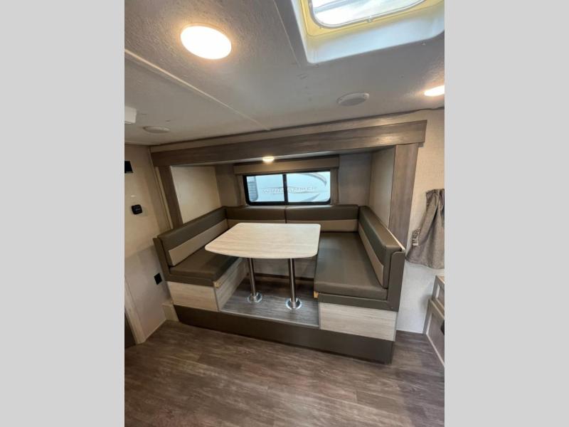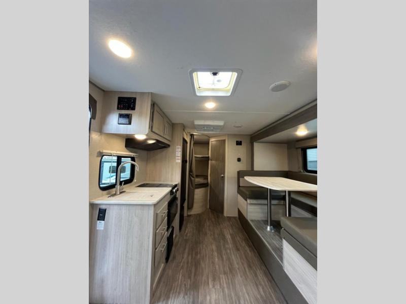 Your small family will have a fun time camping in this travel trailer! The front Murphy bed provides versatility with a sofa to sit on during the day and a 60" x 74" bed to sleep on at night. The U-shaped dinette slide creates more walking around space, a comfortable place to eat, and even an extra sleeping space for a guest or two depending on their sizes. The double over double 46" x 74" bunk beds are also a comfortable place to rest, and they are conveniently next to the rear corner bathroom. If you wish to cook out in the great outdoors then add the optional camper kitchen which comes with a cabinet, a refrigerator, and a pull out griddle!