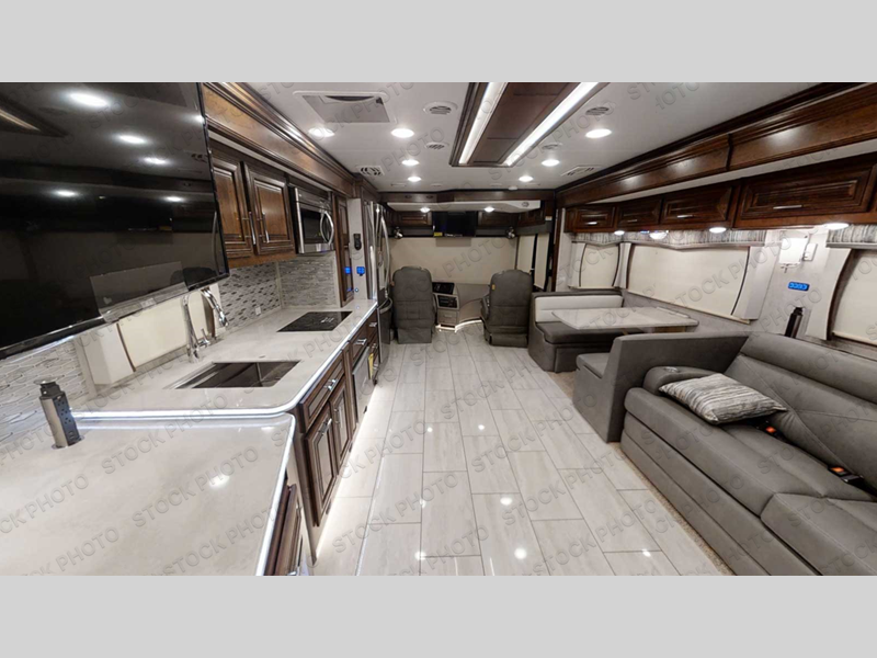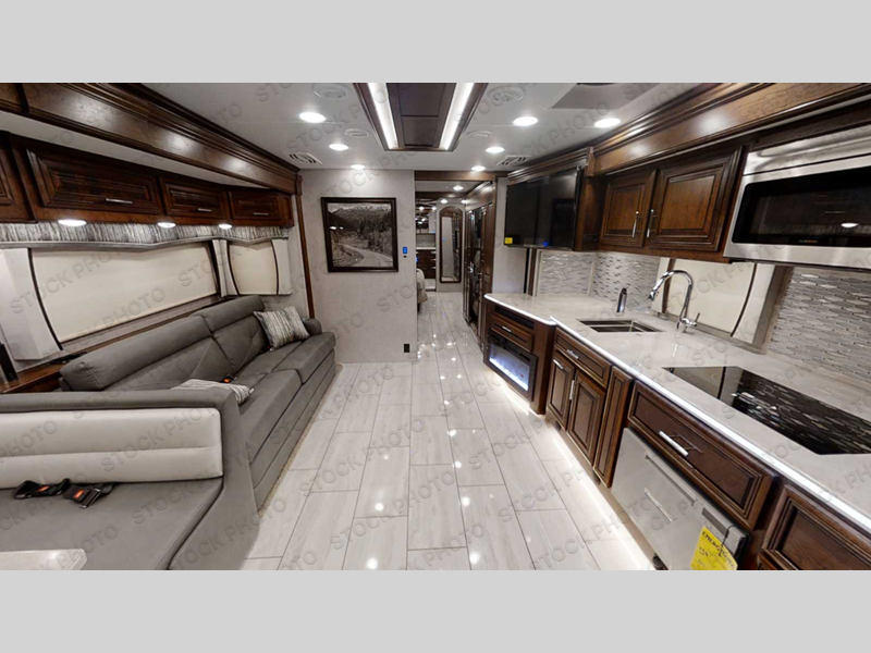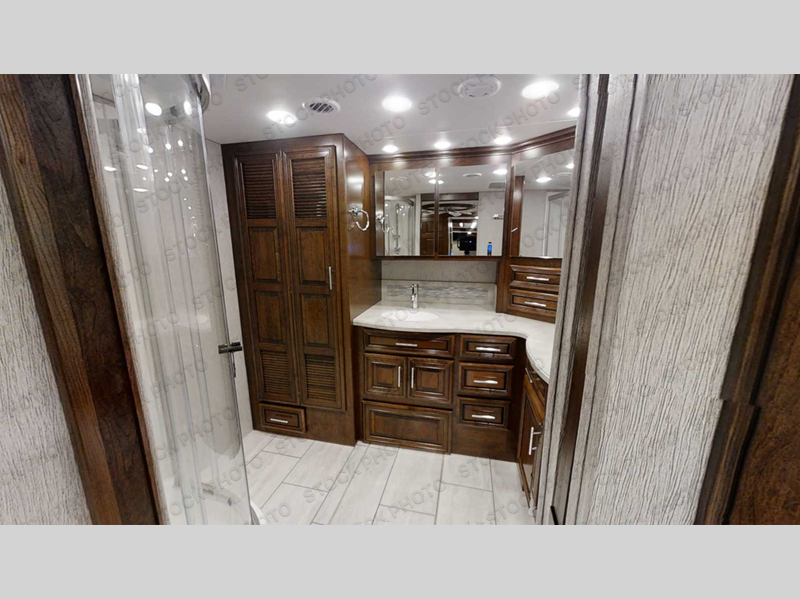 It will be easy for everyone to get ready in this motorhome with two full bathrooms! The full rear bathroom has a dual sink vanity for two to get ready at once, a linen closet with drawers, a radius shower, and an area prepped to add the optional washer and dryer for clean clothes on an extended vacation. The master suite has access to the rear bathroom, a king bed slide with a ceiling fan above it, and a dresser base with full wardrobe and 32" LED TV for your entertainment. Across from the second bathroom is a full closet that can become a set of 30" x 73" bunk beds with two 22" LED TV's with HDMI jacks. Prepare your best meals with the two burner electric induction cooktop and even the 30" over the range convection microwave then enjoy them at the booth dinette or you can switch it out for the optional free standing dinette. The Villa Ultrafab hide-a-bed sofa offers a comfortable place to relax while you watch your favorite movie on the 43" LED TV and enjoy the fireplace!