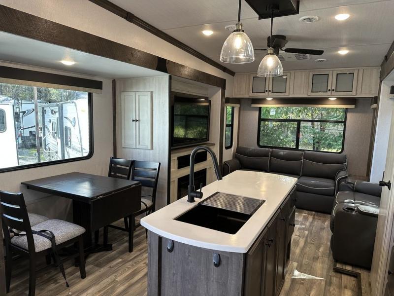 You will be exceptionally excited to see this Cardinal Limited fifth wheel pull into your driveway! There is a very spacious living area thanks to a set of large opposing slides, and you'll also have great relaxation with the hide-a-bed sofa and theater seating. To make this area more comfortable, switch on the fireplace, and use the entertainment center when you want to watch a show. You will love the bathroom because it has a dual-sink vanity which will help your morning routine run more smoothly, and the kitchen has two walk-in pantries to help you store double the goodies. You'll also have a free-standing table with chairs to sit down and eat a delicious meal with the rest of your group.
