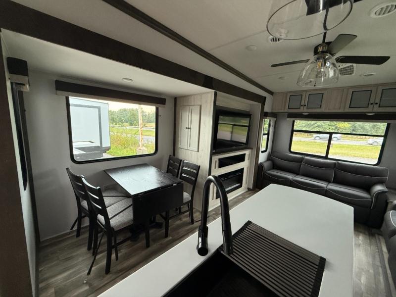 You will be exceptionally excited to see this Cardinal Limited fifth wheel pull into your driveway! There is a very spacious living area thanks to a set of large opposing slides, and you'll also have great relaxation with the hide-a-bed sofa and theater seating. To make this area more comfortable, switch on the fireplace, and use the entertainment center when you want to watch a show. You will love the bathroom because it has a dual-sink vanity which will help your morning routine run more smoothly, and the kitchen has two walk-in pantries to help you store double the goodies. You'll also have a free-standing table with chairs to sit down and eat a delicious meal with the rest of your group.