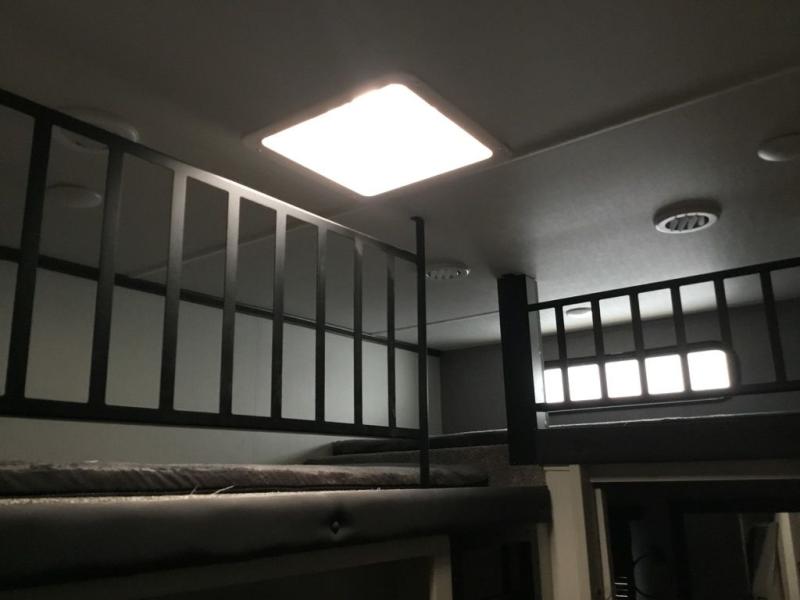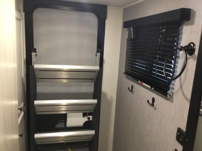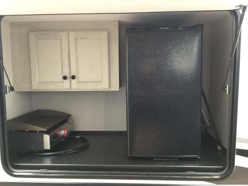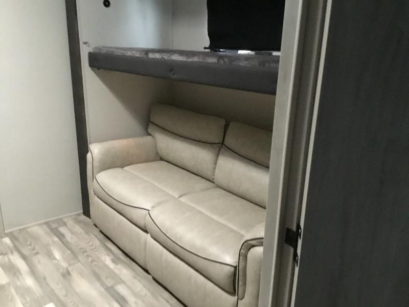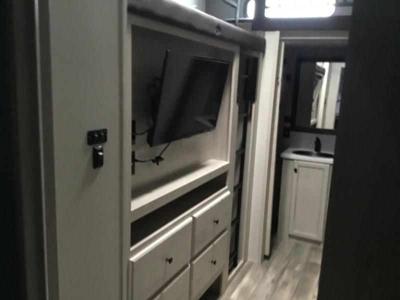 This Cardinal Limited fifth wheel is just about unbelievable! First, it has two full bathrooms, and one of those bathrooms contains the second exterior entry door, so everyone can have quick access when playing outdoors. Second, there is a bunkhouse suite that has great convenience with its tri-fold sofa, flip-down bunk, slide out, loft with ladder, and its own full bathroom. Third, you not only have an interior kitchen complete with all of the appliances you already have in your own home, but you also have an exterior kitchen that you can use when the weather is nice. And last, you as the owner will have the best sleep on the king-size bed up in the front private bedroom. This is also where you will find a true walk-in closet, a bench, a dresser with three large drawers, and two reading lights with individual controls.