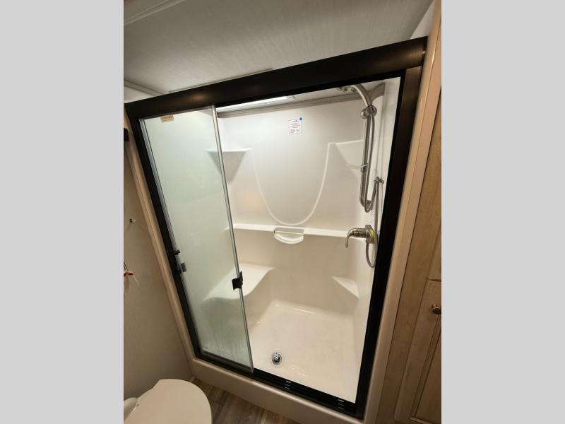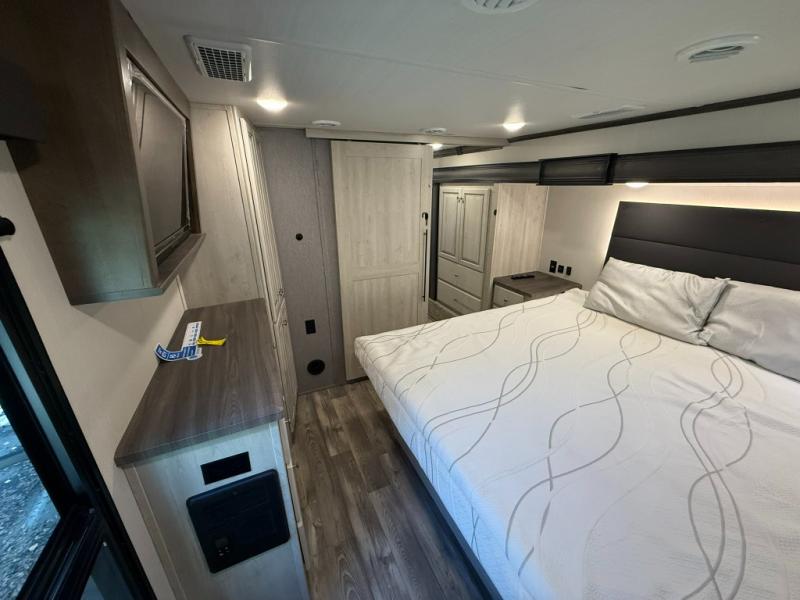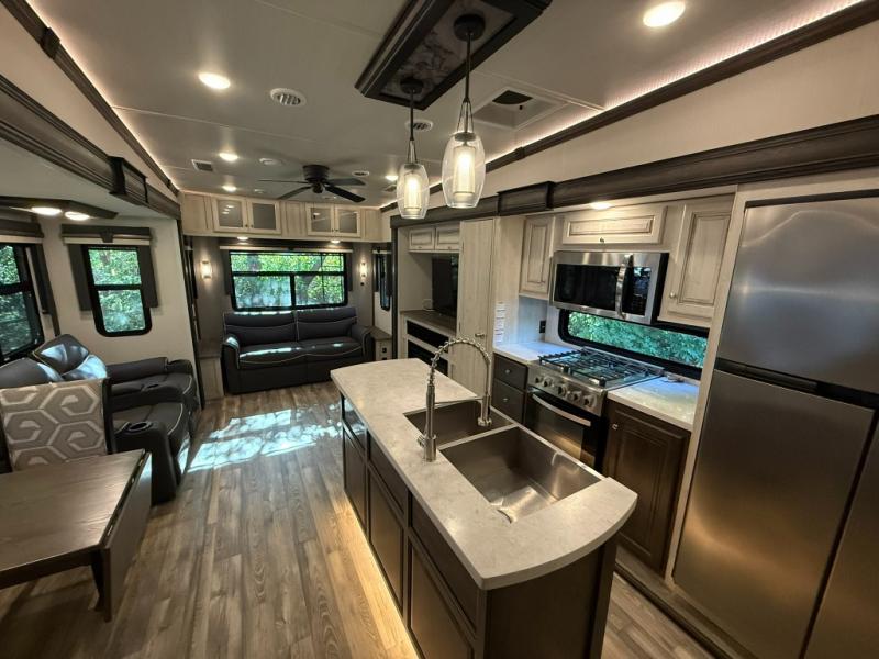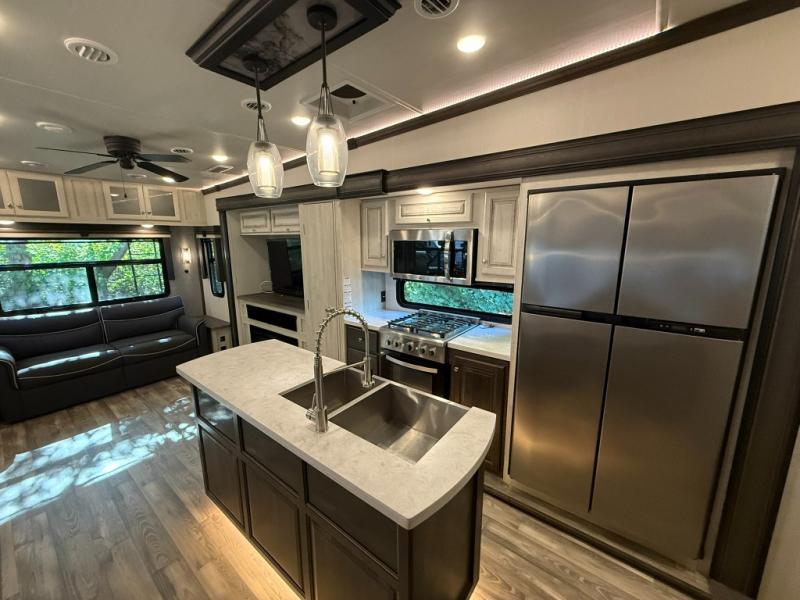 Experience a luxurious camping trip in this fifth wheel! The front private bedroom has a king bed slide to lay your head on at night, a dresser, and a front wardrobe with a dresser to keep your clothes looking their best. Freshen up each morning in the full bathroom with the shower, a linen closet for your towels, and a sink with two mirrors for two to get ready at once. As you step down into the kitchen, to the left you will notice a butler pantry and closet that is prepped to add an optional washer and dryer, plus there is a walk-in pantry and a kitchen island to make meal prepping easier. The rear living area is the perfect place to relax at night on either the hide-a-bed sofa or the theater seating across from the entertainment center with a fireplace. The two power awnings will protect you rain or shine!