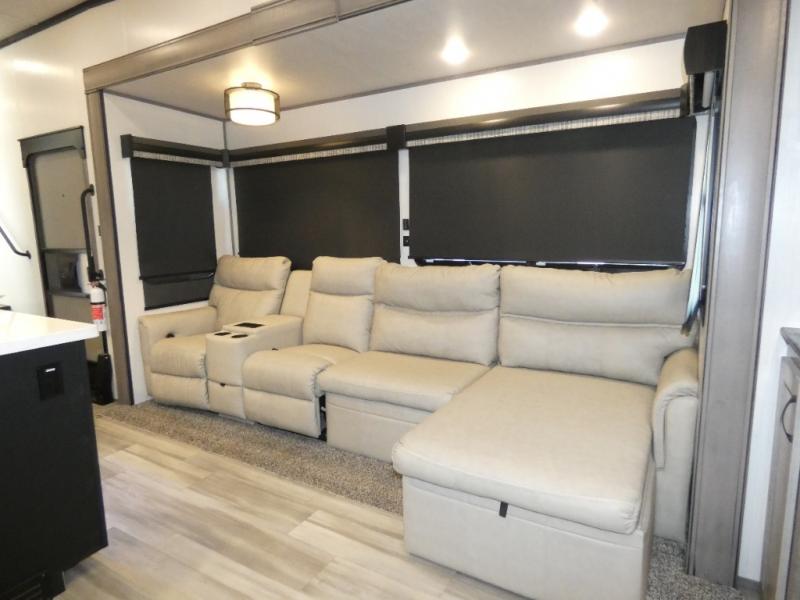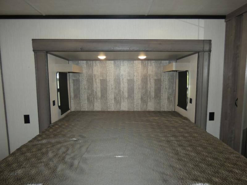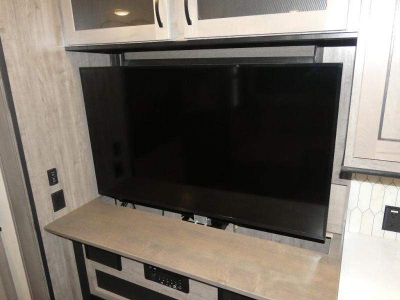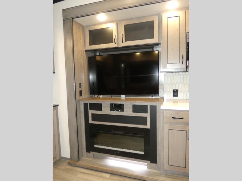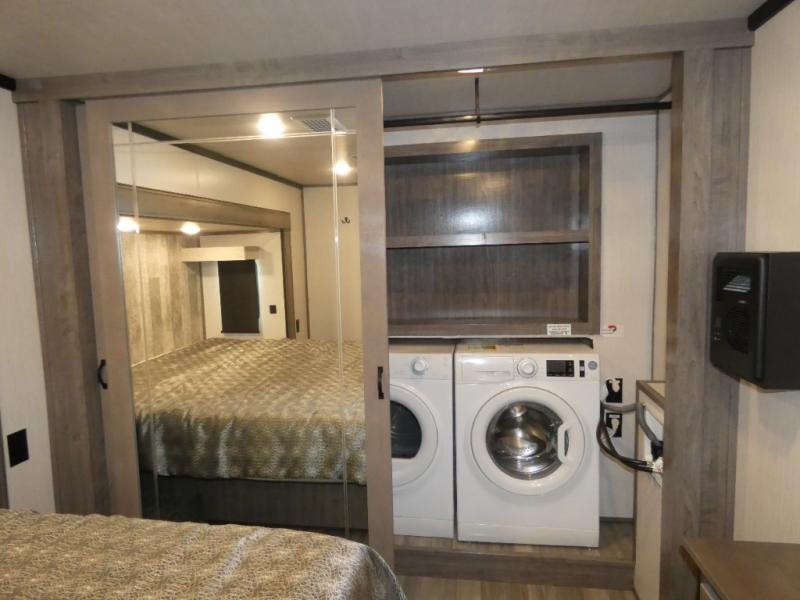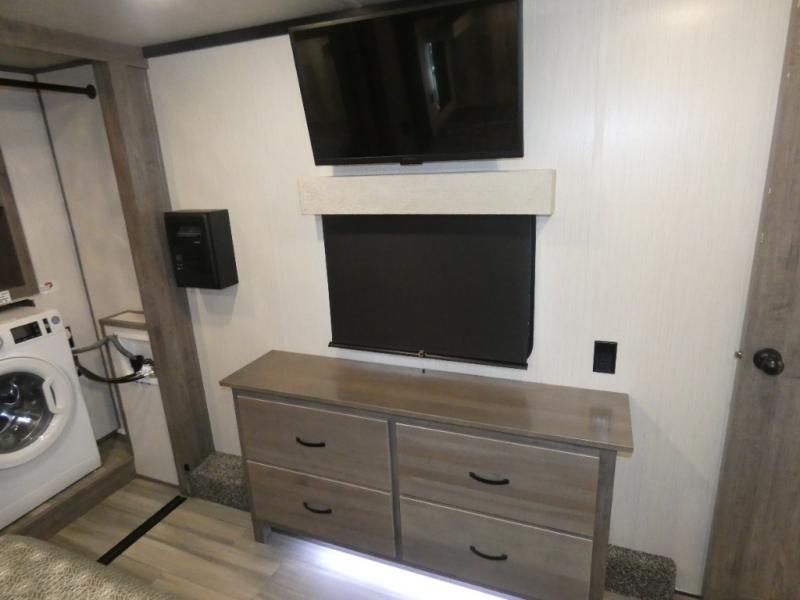 This fifth wheel will be the talk of the campground with a high bar top area in the rear living area! At night, relax on one of the two recliners or the chaise sofa while you watch your favorite movie on the 50" flat screen TV and enjoy the fireplace at the entertainment center. The kitchen island will make your meal prepping easier. The full bathroom has a 48" x 30" shower with a seat to freshen up in and a linen closet to keep your towels close. The front private bedroom has a front wardrobe with storage shelves and an area with washer and dryer, plus a king bed slide for more walking around space and a comfortable place to lay your head at night!