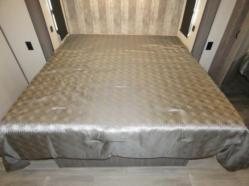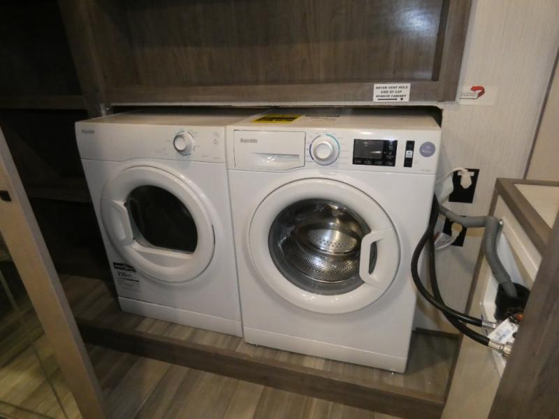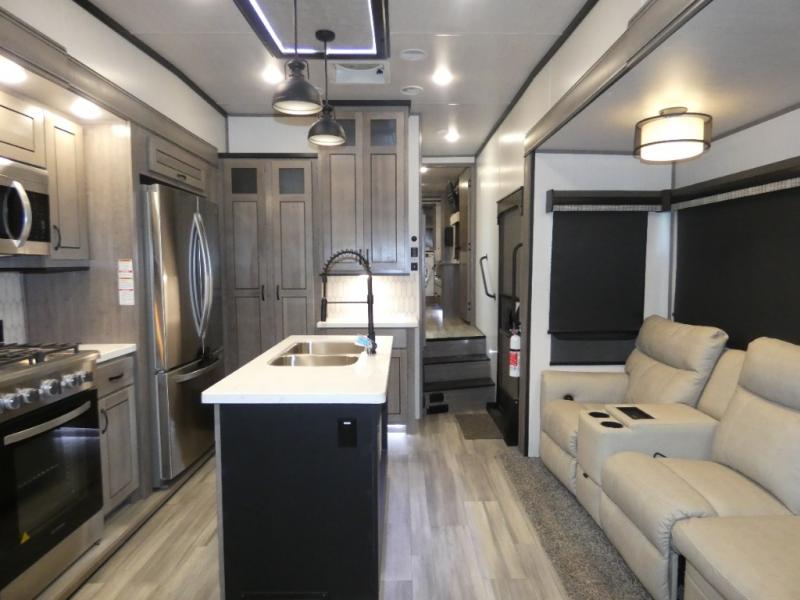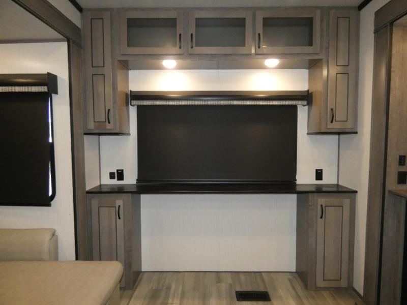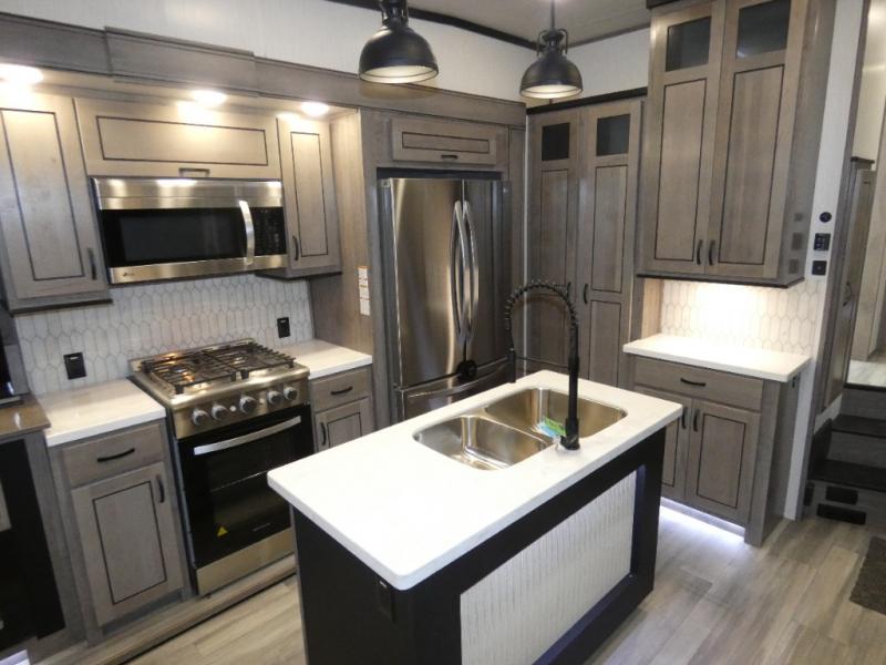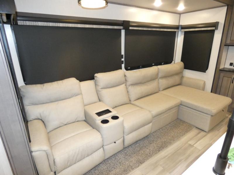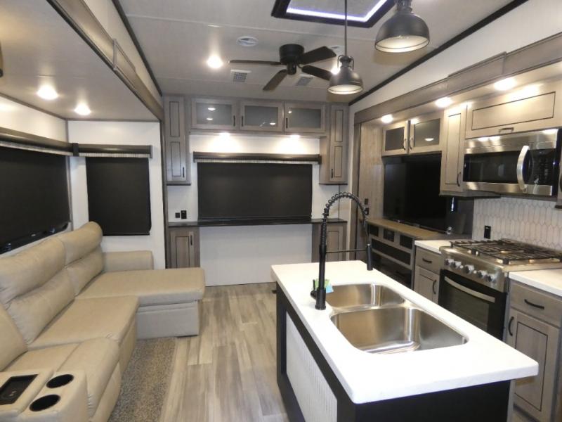 This fifth wheel will be the talk of the campground with a high bar top area in the rear living area! At night, relax on one of the two recliners or the chaise sofa while you watch your favorite movie on the 50" flat screen TV and enjoy the fireplace at the entertainment center. The kitchen island will make your meal prepping easier. The full bathroom has a 48" x 30" shower with a seat to freshen up in and a linen closet to keep your towels close. The front private bedroom has a front wardrobe with storage shelves and an area with washer and dryer, plus a king bed slide for more walking around space and a comfortable place to lay your head at night!