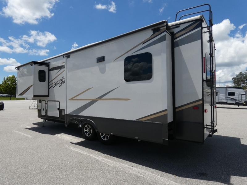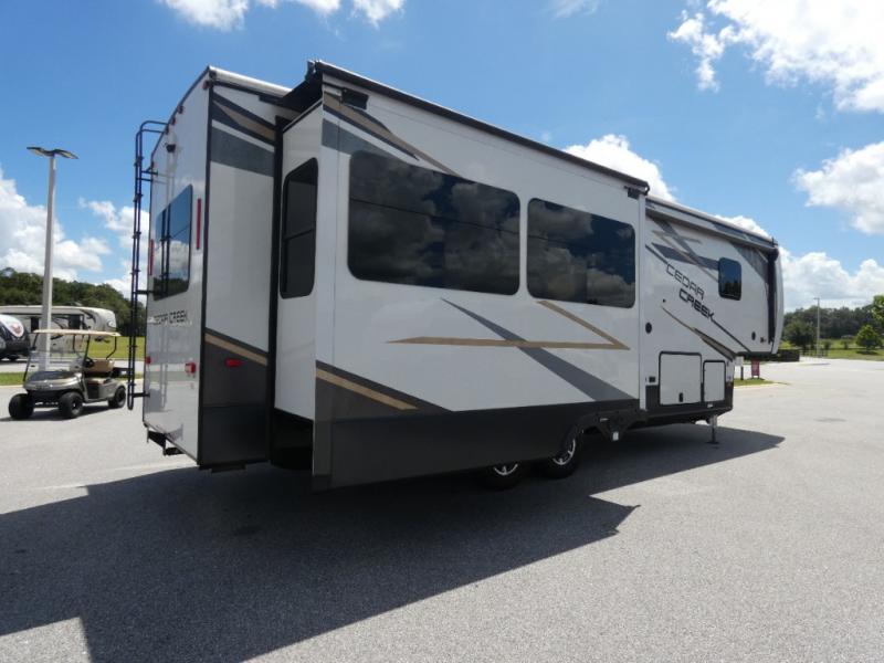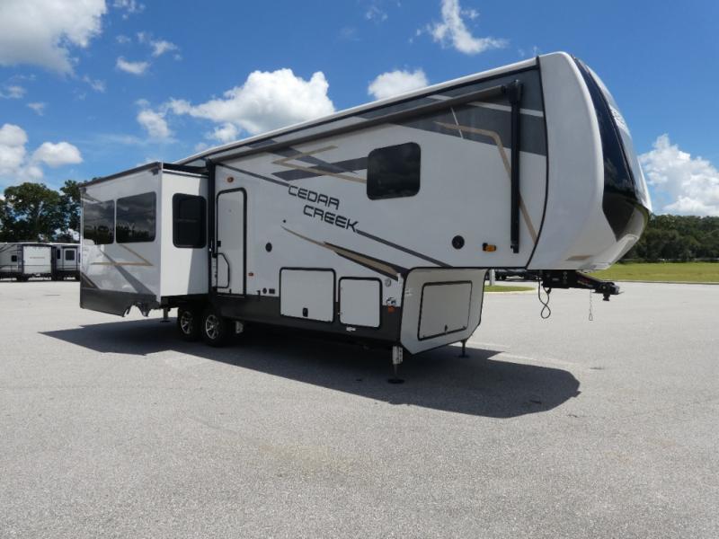 You will have peace of mind camping with any one of these Forest River Cedar Creek fifth wheels or fifth wheel toy haulers! Their aluminum superstructure, high gloss gelcoat exterior, and Dexter heavy duty axles with E-Z lube hubs will outlast all of your adventures. The Silaprene bonded sidewalls resist UV, heat, cold, oils, and highway chemicals with a bond that grows stronger with age while resisting delamination too. With the Vegatouch panel and Firefly dimmer switches, you can have total control of your unit in the palm of your hand. The exterior full docking station has multi-function tank levers, black tank flush, 12V battery disconnect, and an outside shower to keep the dirt where it belongs. The congoleum flooring throughout not only makes you feel right at home, but is also easy to clean. Come find the right model for you today!