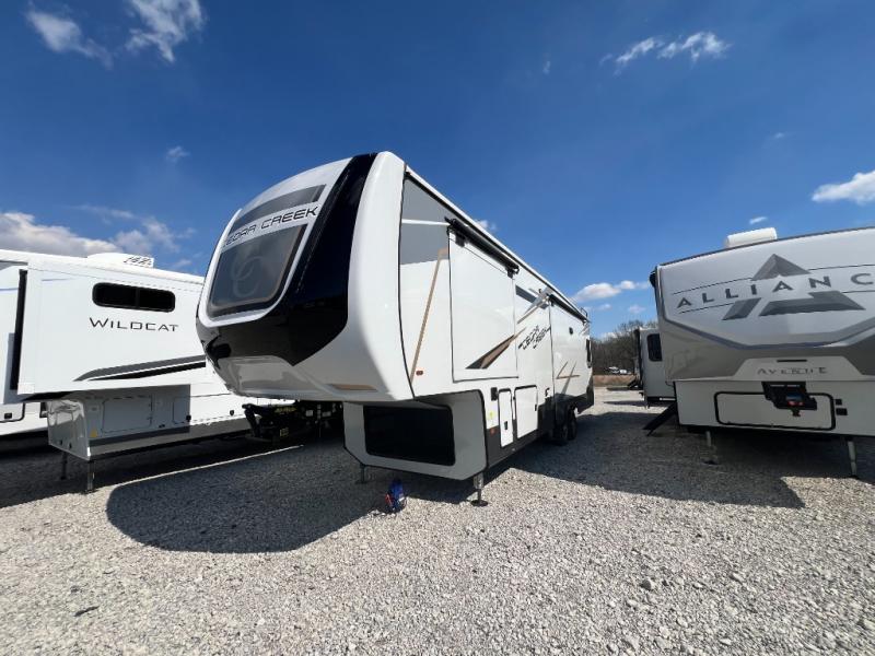 You will have peace of mind camping with any one of these Forest River Cedar Creek fifth wheels or fifth wheel toy haulers! Their aluminum superstructure, high gloss gelcoat exterior, and Dexter heavy duty axles with E-Z lube hubs will outlast all of your adventures. The Silaprene bonded sidewalls resist UV, heat, cold, oils, and highway chemicals with a bond that grows stronger with age while resisting delamination too. With the Vegatouch panel and Firefly dimmer switches, you can have total control of your unit in the palm of your hand. The exterior full docking station has multi-function tank levers, black tank flush, 12V battery disconnect, and an outside shower to keep the dirt where it belongs. The congoleum flooring throughout not only makes you feel right at home, but is also easy to clean. Come find the right model for you today!