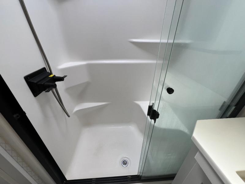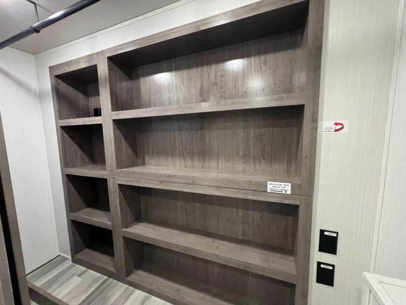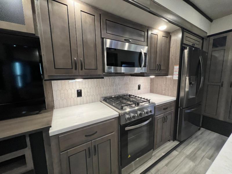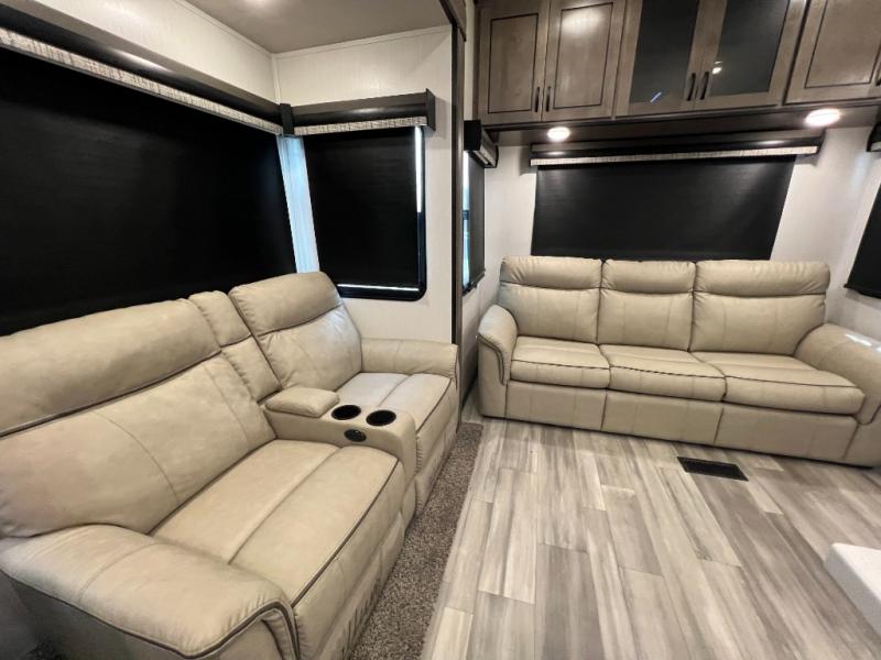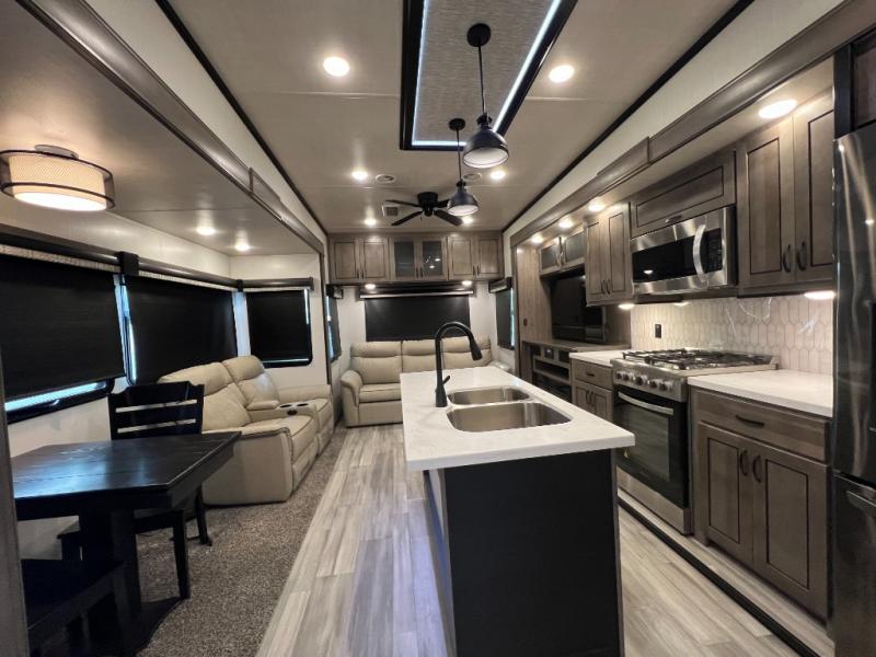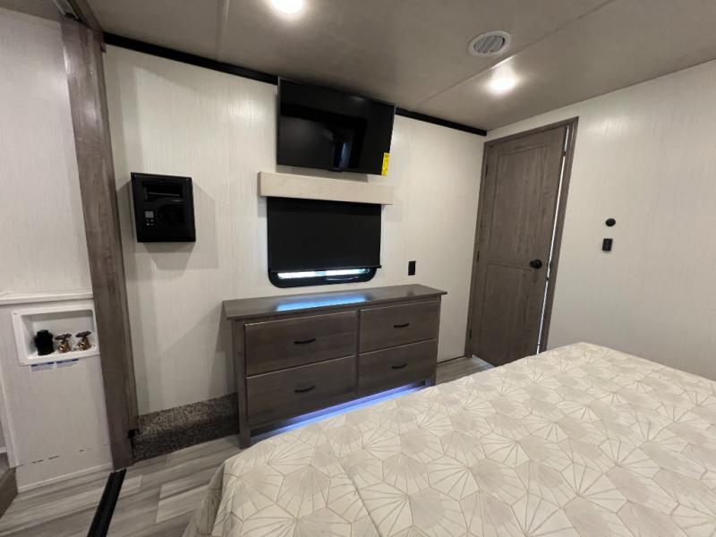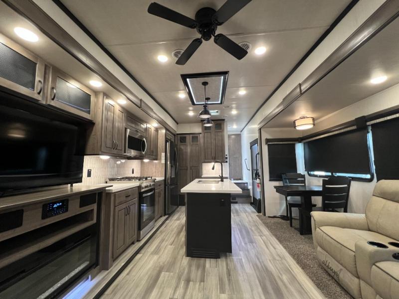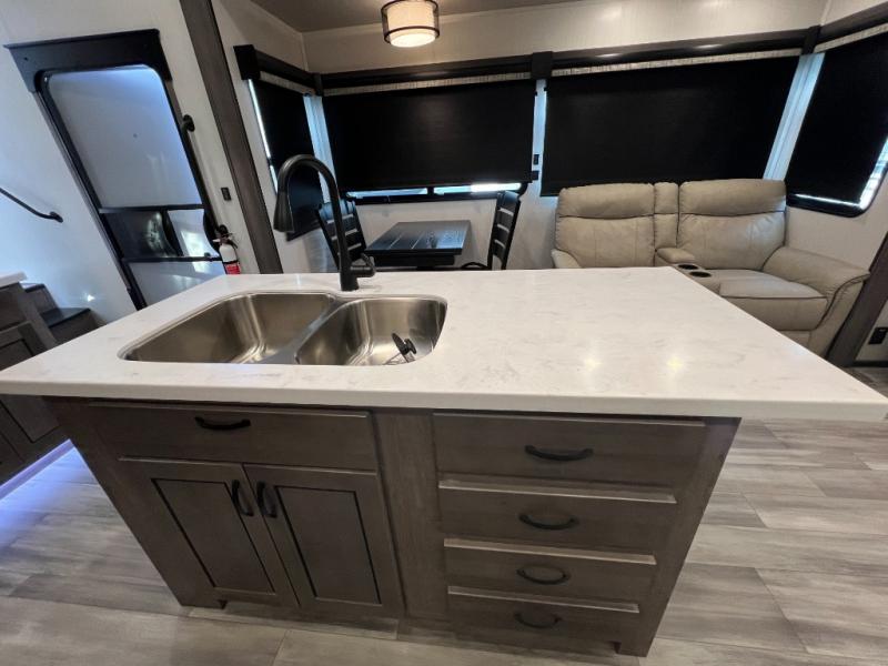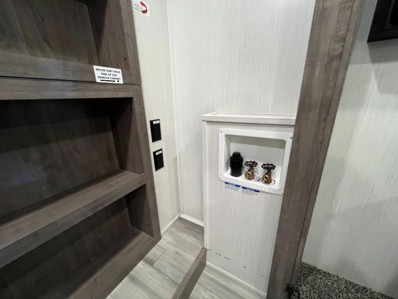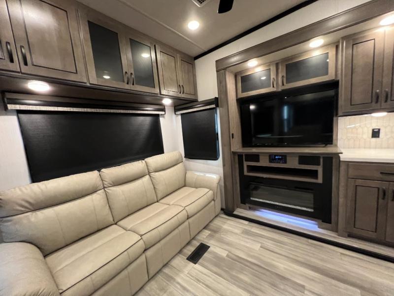 Pack your bags and hitch up this fifth wheel for a fun camping trip! When mother nature rains on your parade, relax in the rear living area on either the hide-a-bed sofa or power theater seating with USB charging across from the entertainment center with a fireplace and 50" flat screen TV. The chef can prepare their best meals with the kitchen island and if you want an easier clean up time then add the optional dishwasher to the island. You could even add the optional pull-out kitchen for breakfast outdoors. The full bathroom has a 48" x 30" shower with a seat to wash the sand out of your hair after a fun day at the beach. The king bed slide in the front private bedroom welcomes you to enjoy a good night's rest and the front wardrobe has storage shelves and an area prepped to add an optional washer and dryer for you to have clean clothes throughout your entire trip!