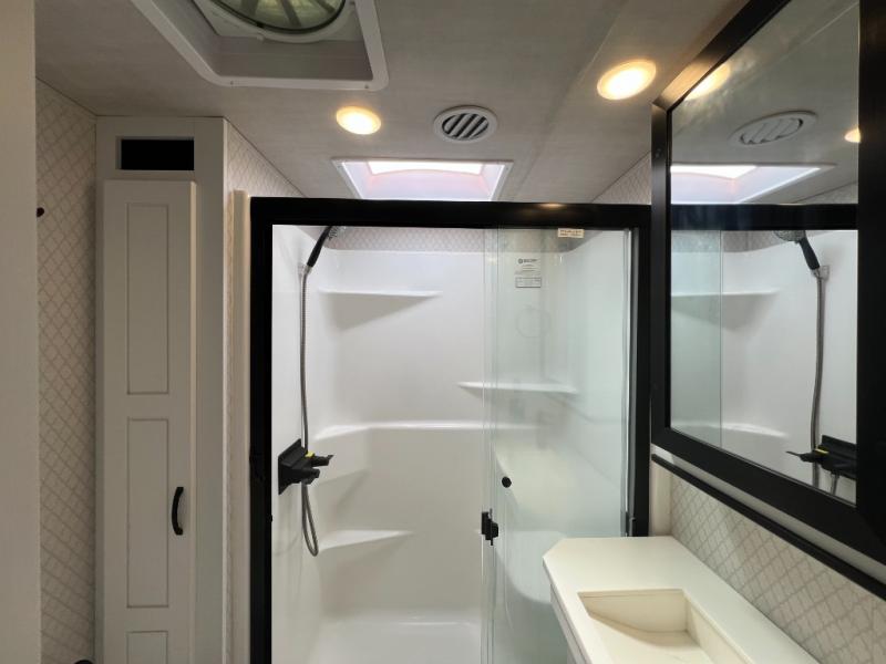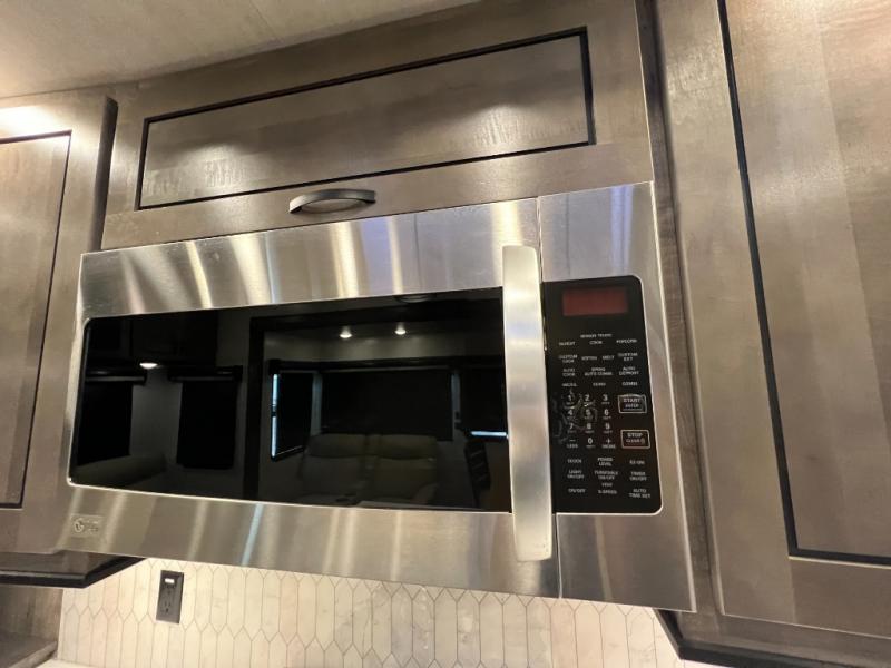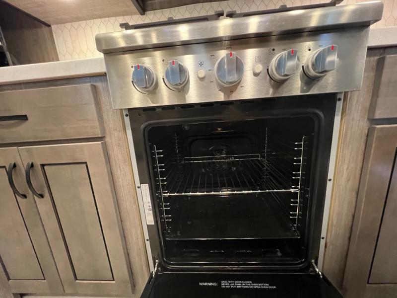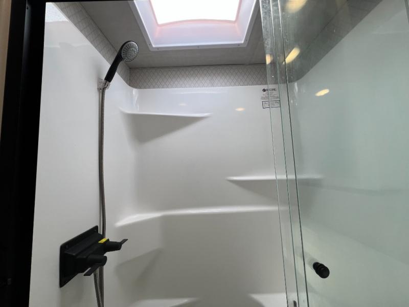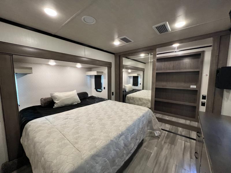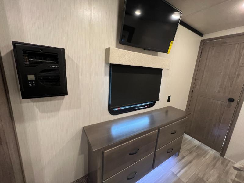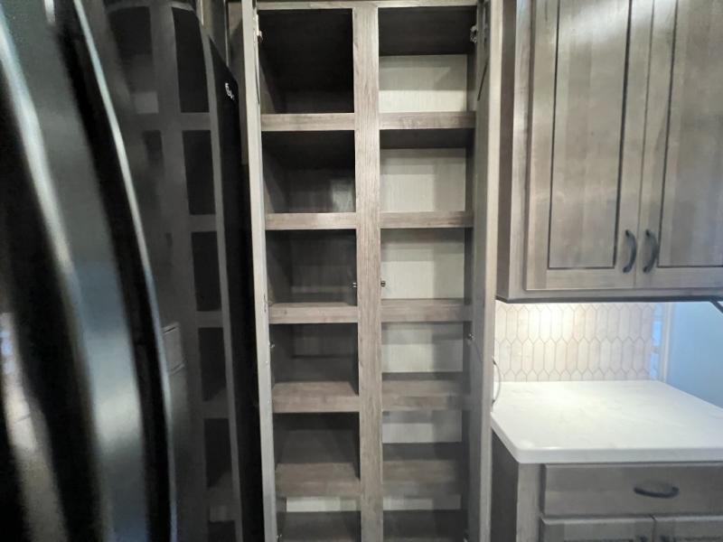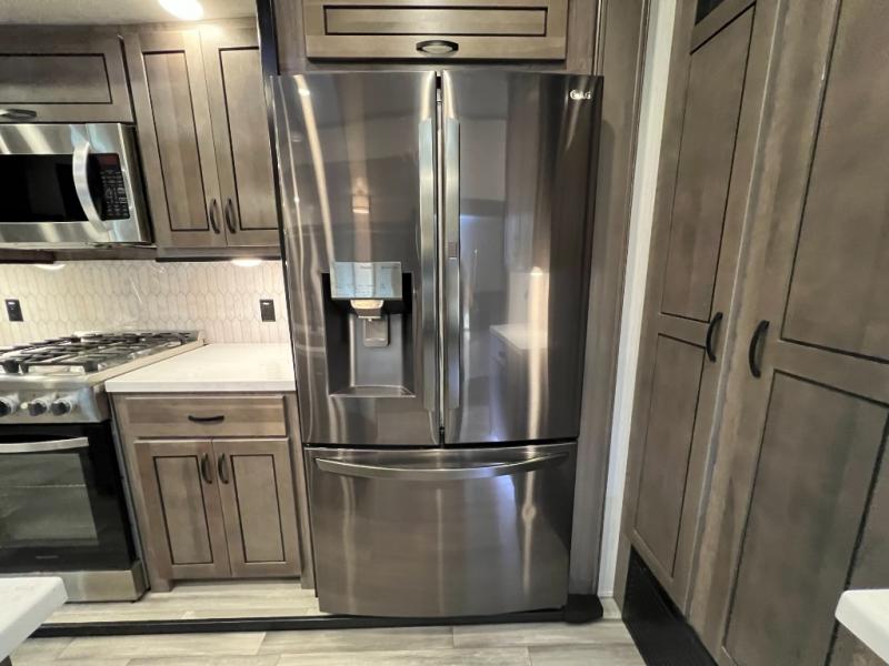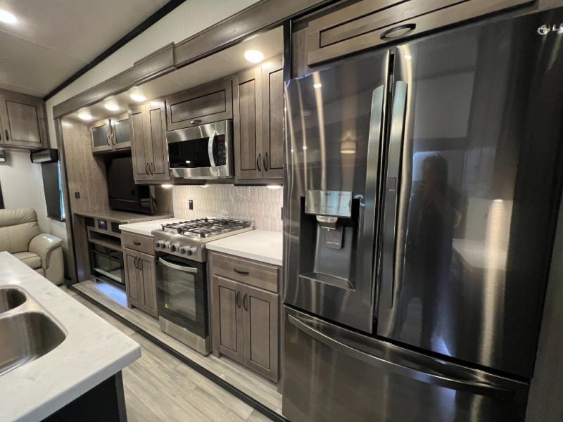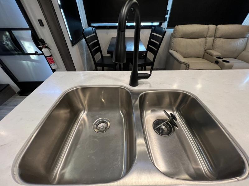 Pack your bags and hitch up this fifth wheel for a fun camping trip! When mother nature rains on your parade, relax in the rear living area on either the hide-a-bed sofa or power theater seating with USB charging across from the entertainment center with a fireplace and 50" flat screen TV. The chef can prepare their best meals with the kitchen island and if you want an easier clean up time then add the optional dishwasher to the island. You could even add the optional pull-out kitchen for breakfast outdoors. The full bathroom has a 48" x 30" shower with a seat to wash the sand out of your hair after a fun day at the beach. The king bed slide in the front private bedroom welcomes you to enjoy a good night's rest and the front wardrobe has storage shelves and an area prepped to add an optional washer and dryer for you to have clean clothes throughout your entire trip!