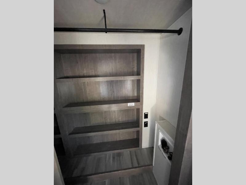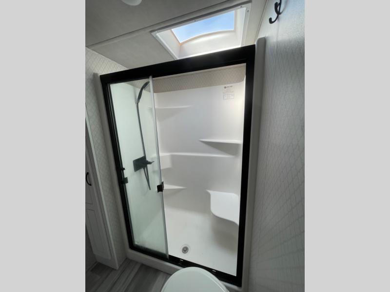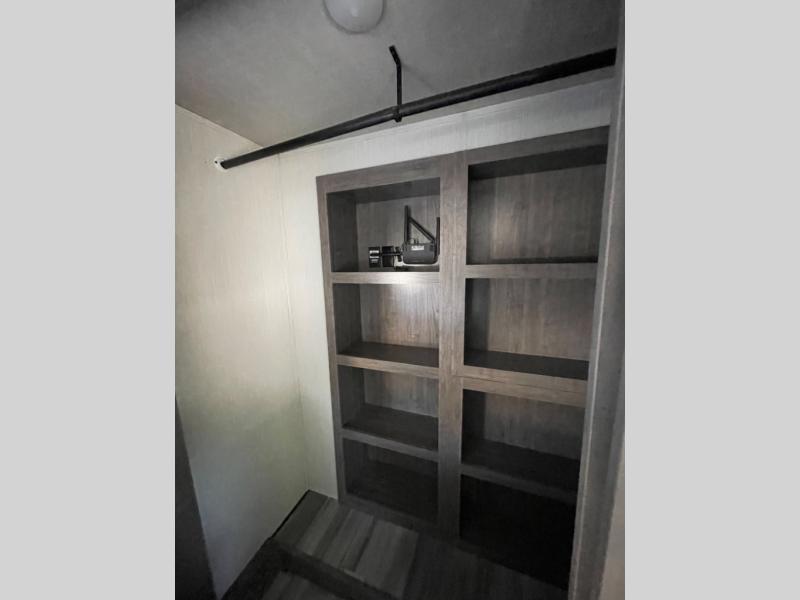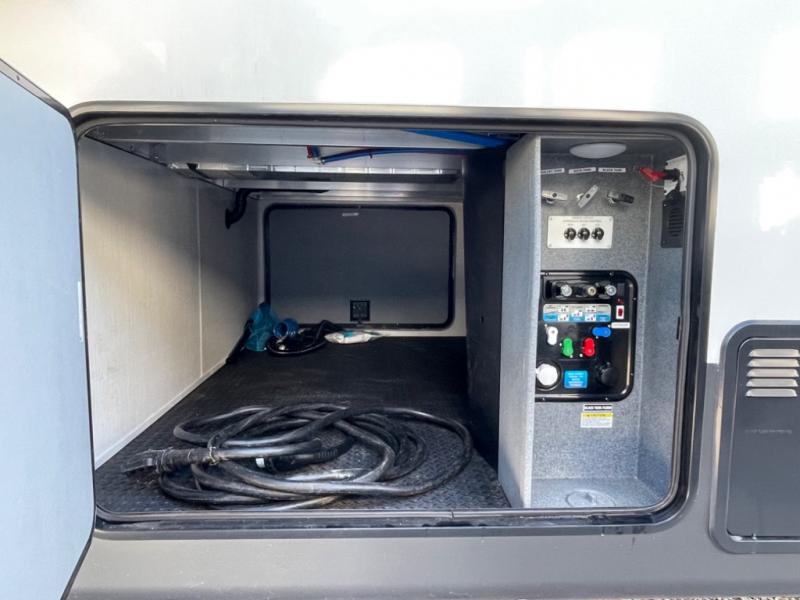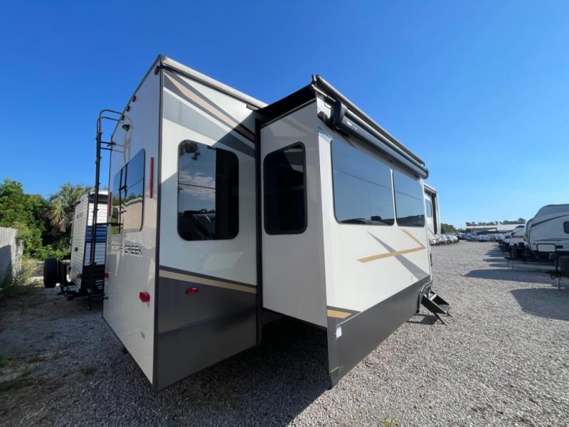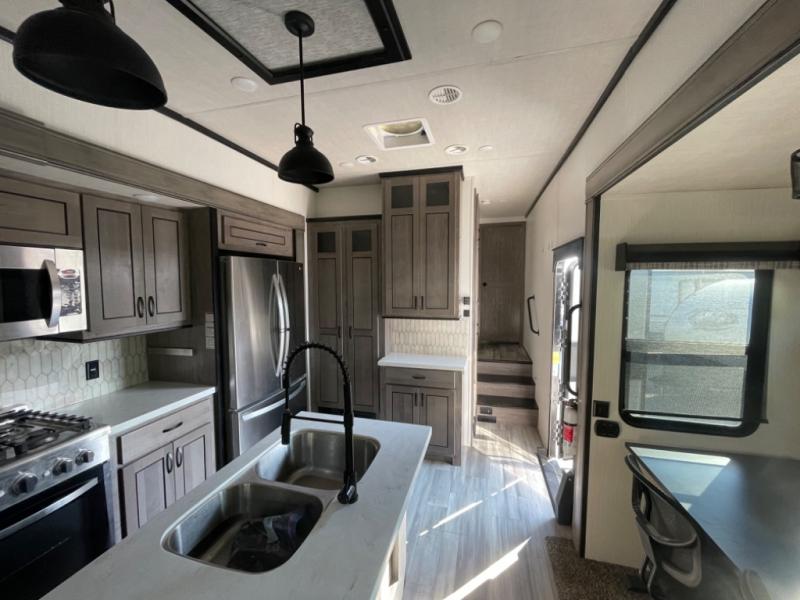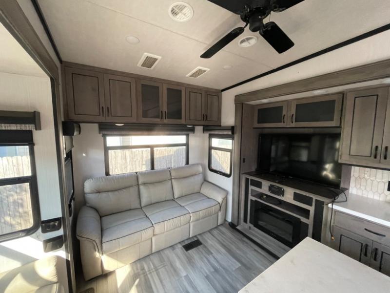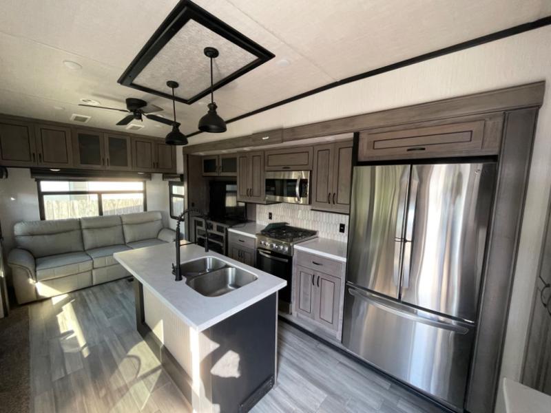 Enjoy a relaxing camping trip with this fifth wheel! The rear living area has a hide-a-bed sofa and power theater seating with USB charging across from an entertainment center with a fireplace and 50" flat screen TV to watch your favorite movies. The chef can prepare their best meals with the kitchen island and if you want an easier clean up time then add the optional dishwasher to the island. You could even add the optional pull-out kitchen for breakfast outdoors. The full bathroom has a 48" x 30" shower with a seat to wash the sand out of your hair after a fun day at the beach and a dual sink vanity for two to get ready at once. The king bed slide in the front private bedroom welcomes you to enjoy a good night's rest and the front wardrobe has storage shelves and an area prepped to add an optional washer and dryer for you to have clean clothes throughout your entire trip!