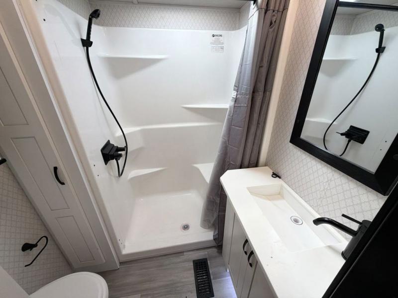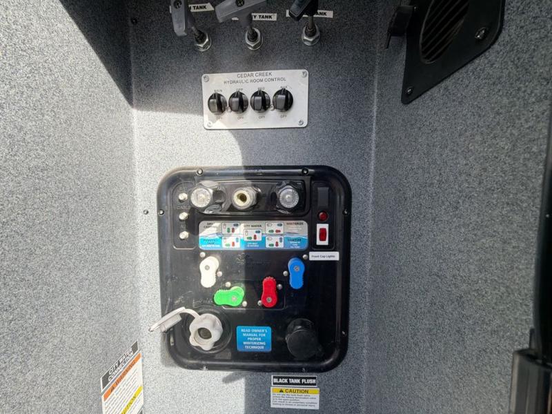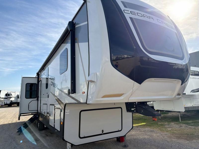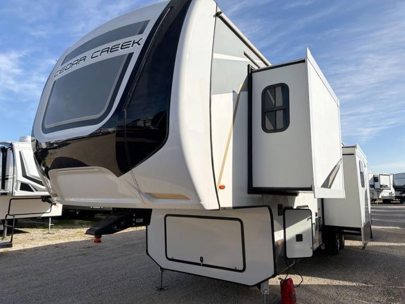 You will have peace of mind camping with any one of these Forest River Cedar Creek fifth wheels or fifth wheel toy haulers! Their aluminum superstructure, high gloss gelcoat exterior, and Dexter heavy duty axles with E-Z lube hubs will outlast all of your adventures. The Silaprene bonded sidewalls resist UV, heat, cold, oils, and highway chemicals with a bond that grows stronger with age while resisting delamination too. With the Vegatouch panel and Firefly dimmer switches, you can have total control of your unit in the palm of your hand. The exterior full docking station has multi-function tank levers, black tank flush, 12V battery disconnect, and an outside shower to keep the dirt where it belongs. The congoleum flooring throughout not only makes you feel right at home, but is also easy to clean. Come find the right model for you today!