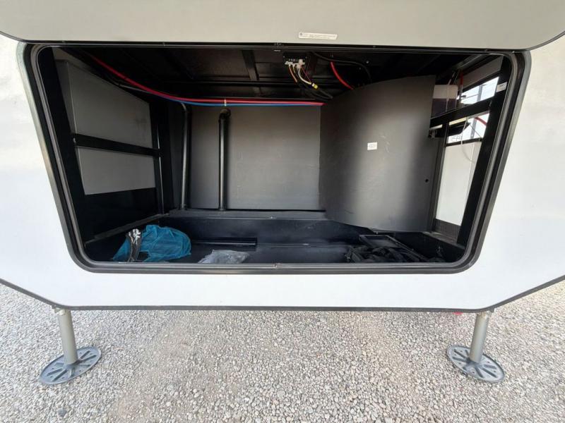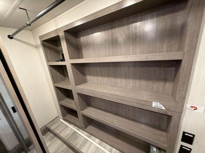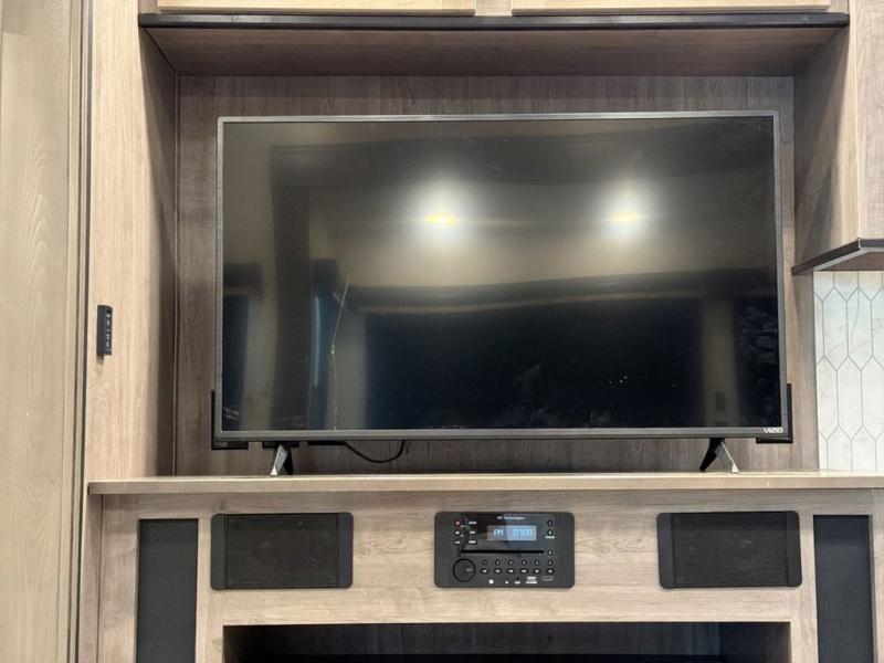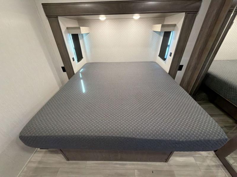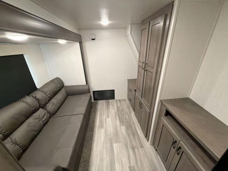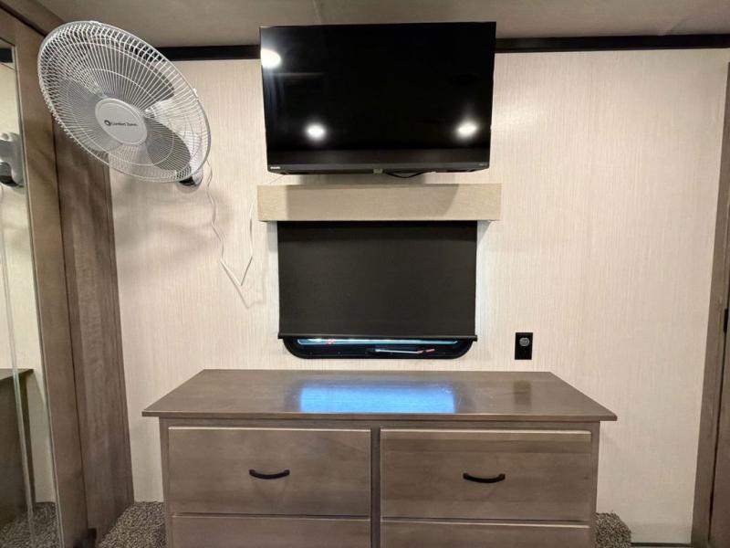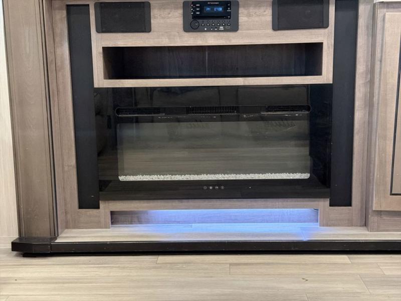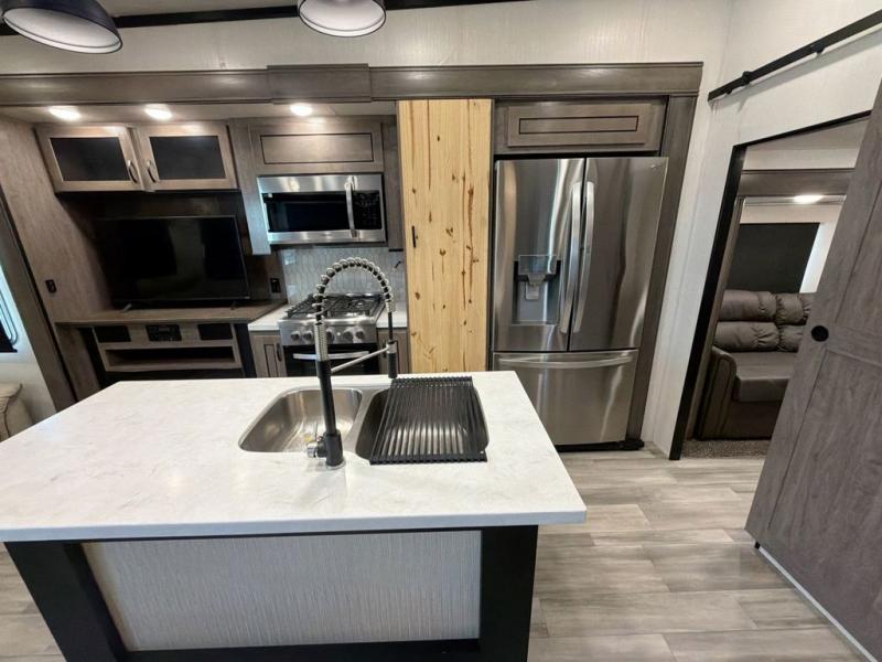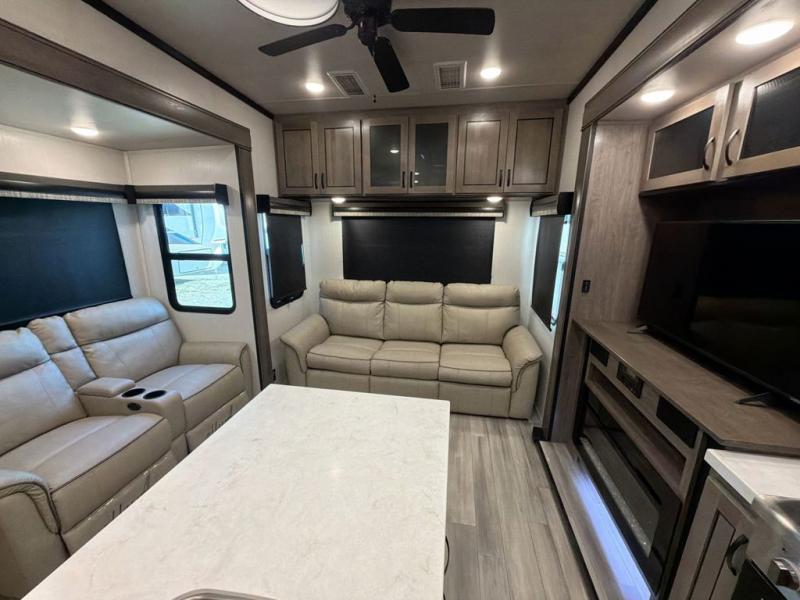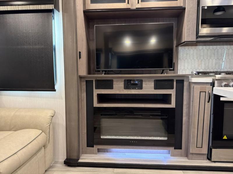 With two bedrooms in this fifth wheel, the whole family can camp together! The front private bedroom has a king bed slide to lay your head at night, a dresser with a TV, and a front wardrobe with storage shelves to keep your clothes looking nice. The second bedroom has a 91" x 64- 3/4" loft above a tri-fold sofa slide that is across from an area for a TV and wardrobe, and you could even switch out the sofa for an optional 73" desk to get some work done while you are away. Everyone can freshen up in the full bathroom with a shower with a seat and their bellies full with a kitchen island and 20 cu. ft. stainless steel refrigerator with ice maker. And for easy clean up add the optional dishwasher to the kitchen island. You can even cook your meals while breathing in some fresh air with the exterior camp kitchen. After a fun day outdoors, head to the rear living area and relax on either the hide-a-bed sofa or the power theater seating across from the fireplace and 50" flat screen TV!