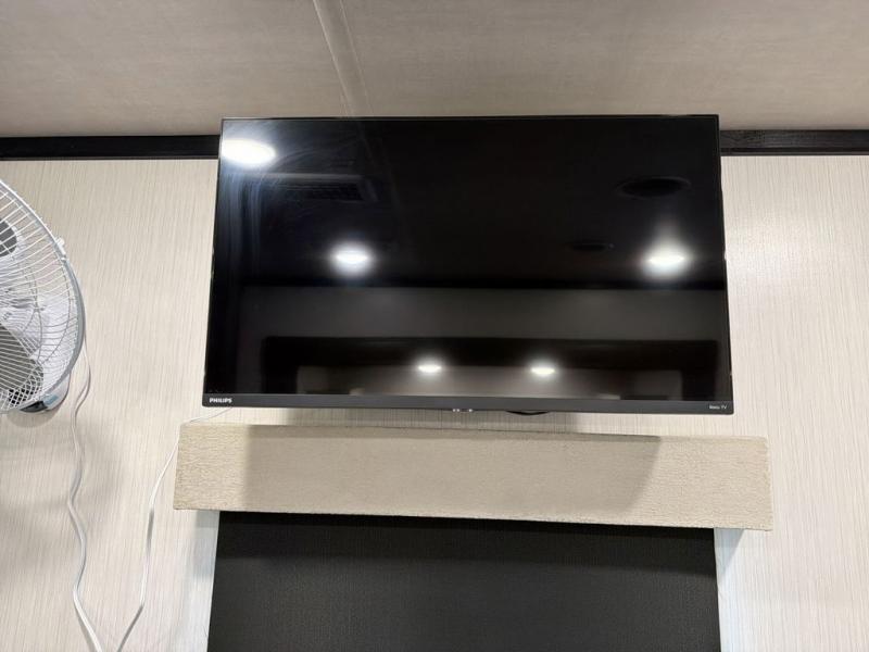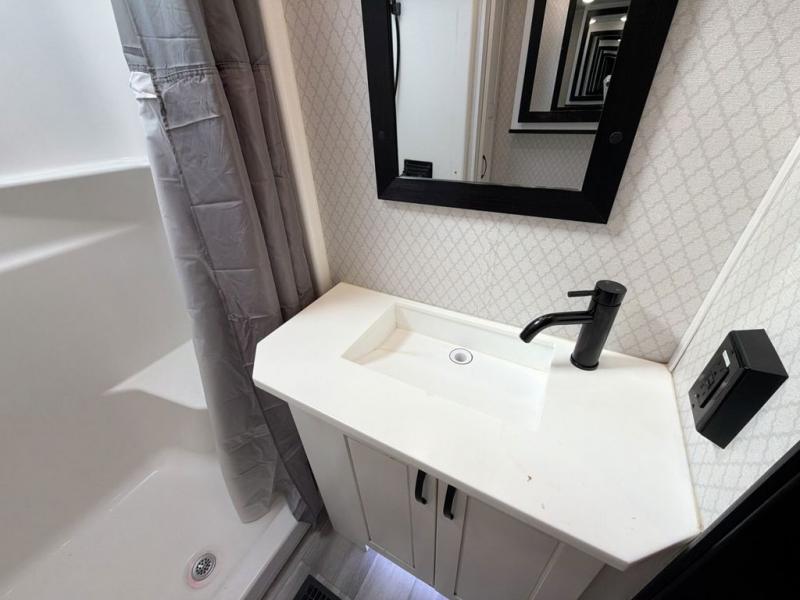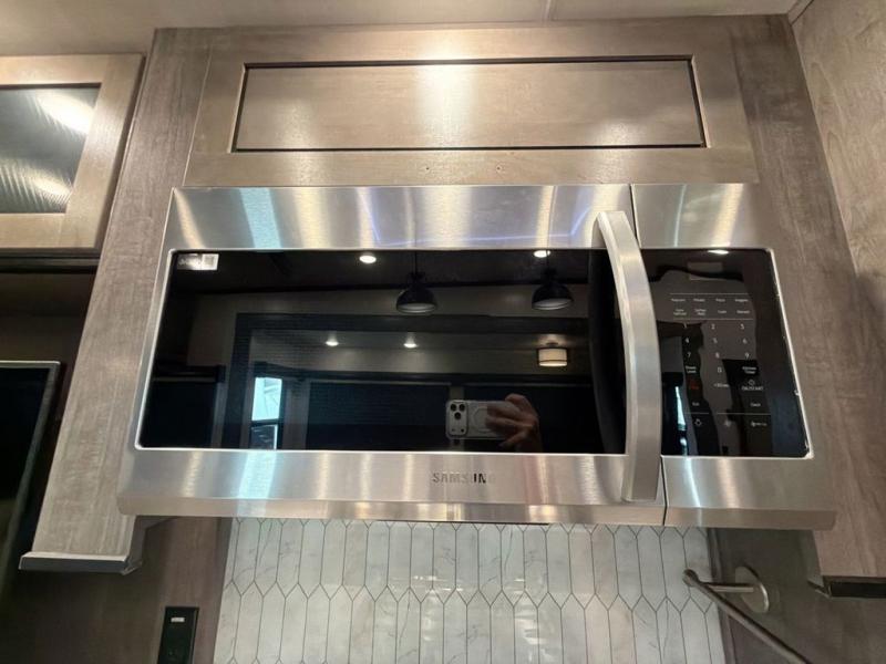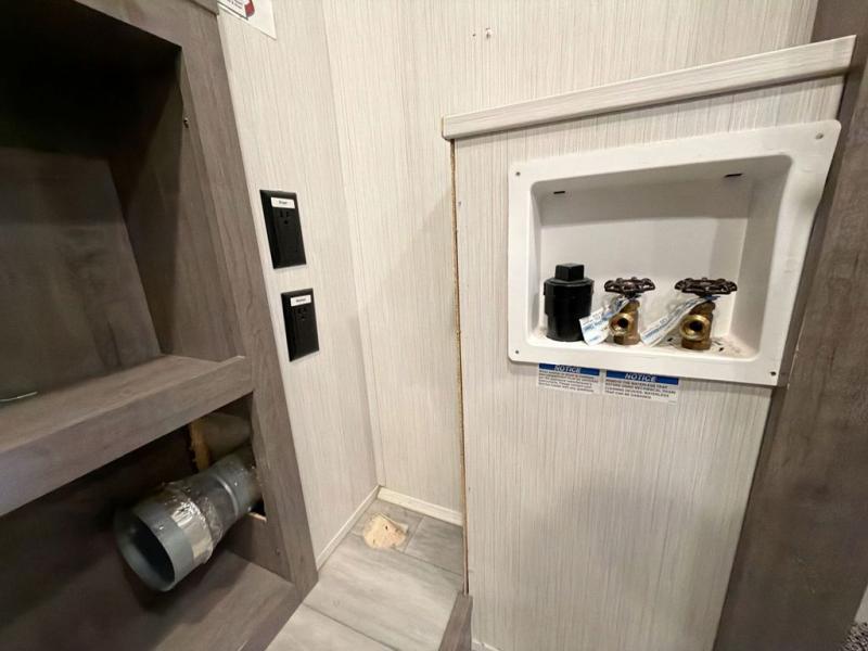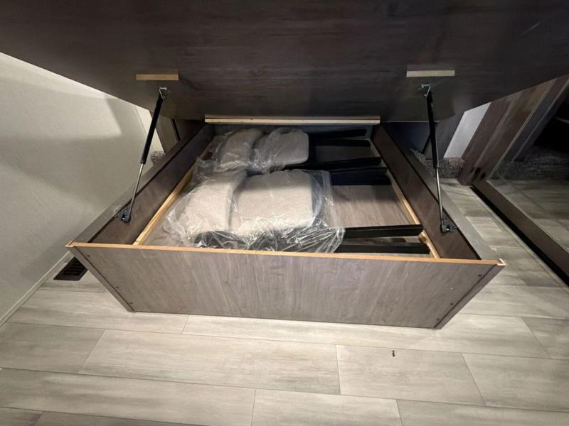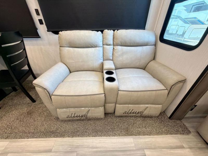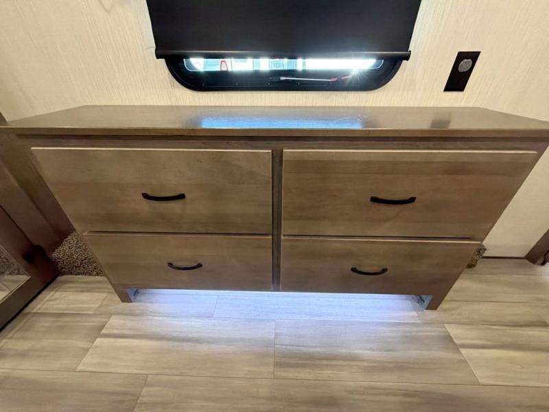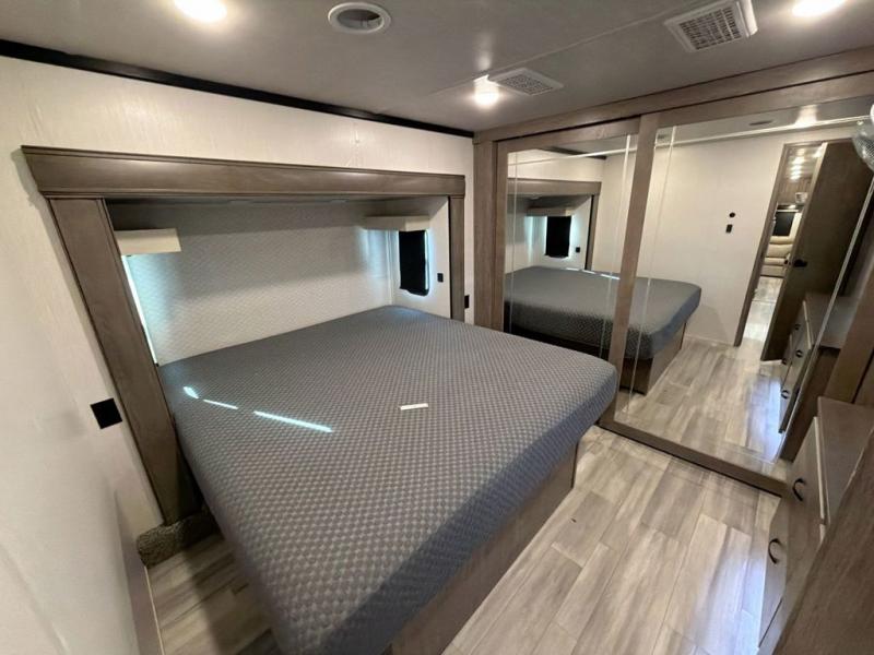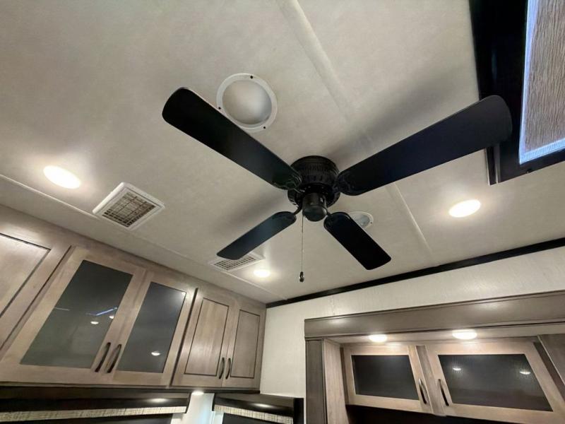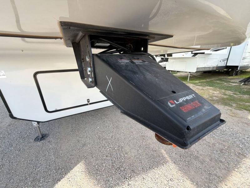 With two bedrooms in this fifth wheel, the whole family can camp together! The front private bedroom has a king bed slide to lay your head at night, a dresser with a TV, and a front wardrobe with storage shelves to keep your clothes looking nice. The second bedroom has a 91" x 64- 3/4" loft above a tri-fold sofa slide that is across from an area for a TV and wardrobe, and you could even switch out the sofa for an optional 73" desk to get some work done while you are away. Everyone can freshen up in the full bathroom with a shower with a seat and their bellies full with a kitchen island and 20 cu. ft. stainless steel refrigerator with ice maker. And for easy clean up add the optional dishwasher to the kitchen island. You can even cook your meals while breathing in some fresh air with the exterior camp kitchen. After a fun day outdoors, head to the rear living area and relax on either the hide-a-bed sofa or the power theater seating across from the fireplace and 50" flat screen TV!