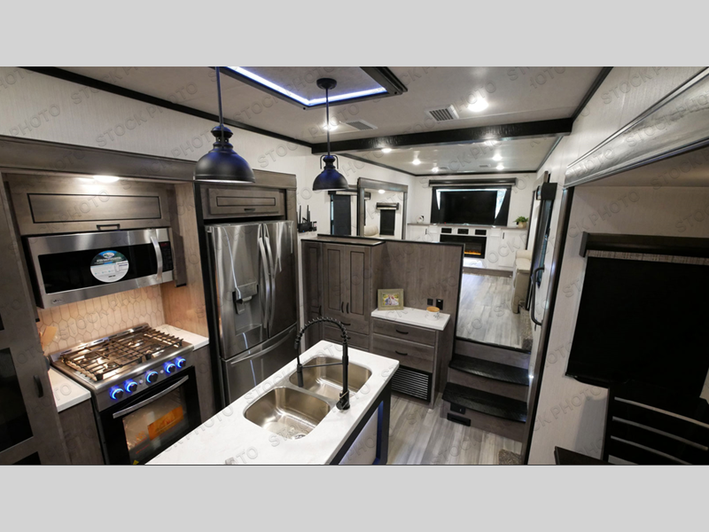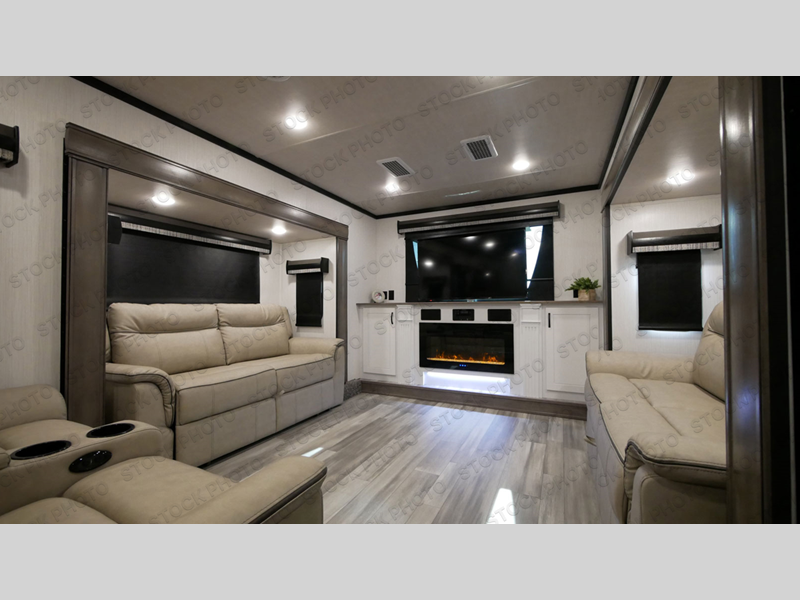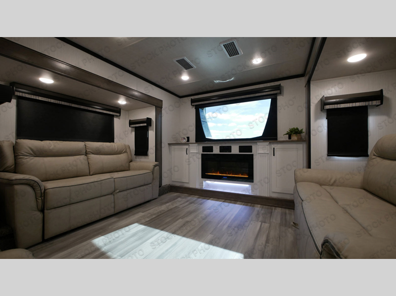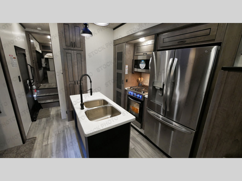 You can bring your favorite off-road toys with you to the campground in this fifth wheel toy hauler! Enjoy a good night's rest on the queen bed above the 63" x 110" below floor garage area, and your guests can sleep on one of the opposing tri-fold sofa slides in the front living area. The living area also has power theater seating across from an entertainment center with a fireplace and 50" hidden telescope flat screen TV to watch your favorite movies at night. Everyone can stay clean with the full bathroom that has a shower with a seat and an area prepped to add an optional washer and dryer. The chef can prepare their best meals with the kitchen island and free standing 24" gas range or at the outside kitchen with an entertainment center to watch the big game while you grill up some juicy burgers!