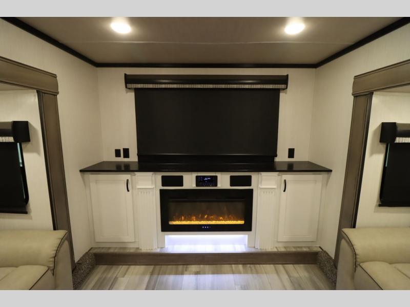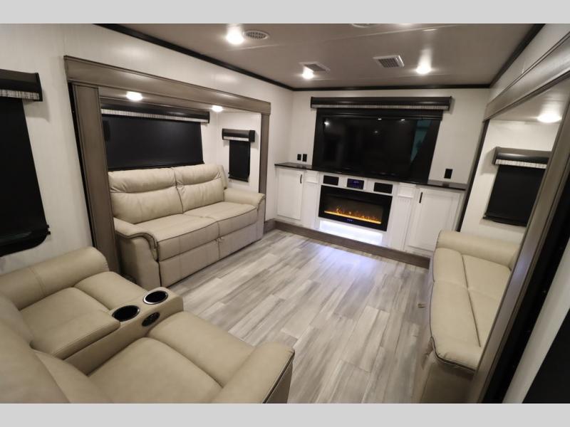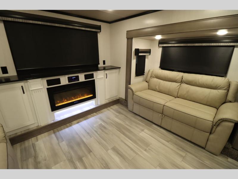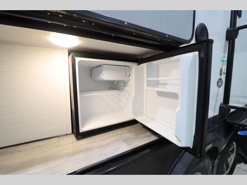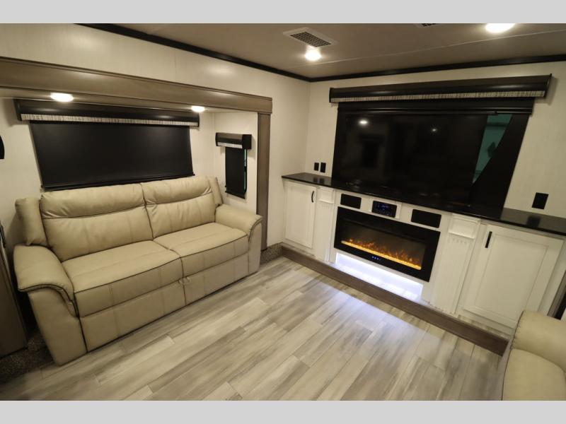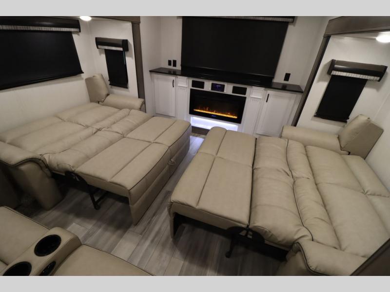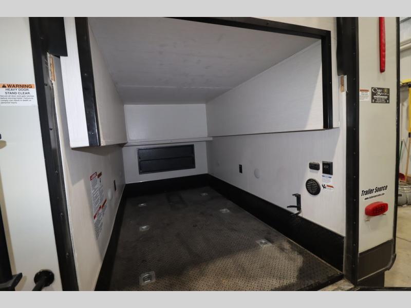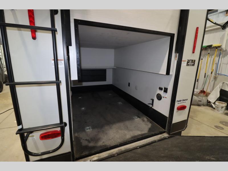 You can bring your favorite off-road toys with you to the campground in this fifth wheel toy hauler! Enjoy a good night's rest on the queen bed above the 63" x 110" below floor garage area, and your guests can sleep on one of the opposing tri-fold sofa slides in the front living area. The living area also has power theater seating across from an entertainment center with a fireplace and 50" hidden telescope flat screen TV to watch your favorite movies at night. Everyone can stay clean with the full bathroom that has a shower with a seat and an area prepped to add an optional washer and dryer. The chef can prepare their best meals with the kitchen island and free standing 24" gas range or at the outside kitchen with an entertainment center to watch the big game while you grill up some juicy burgers!