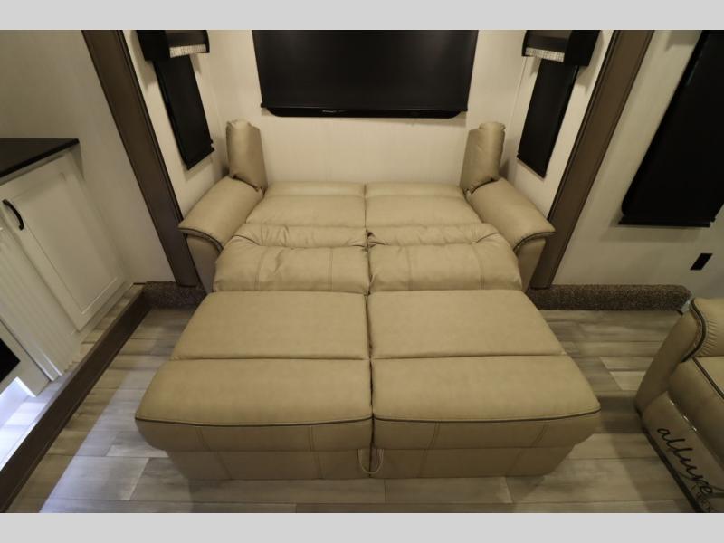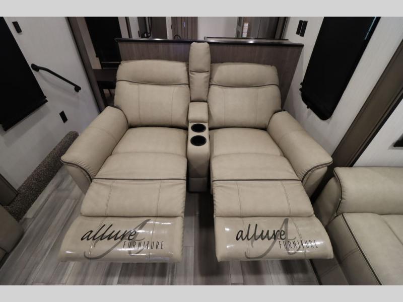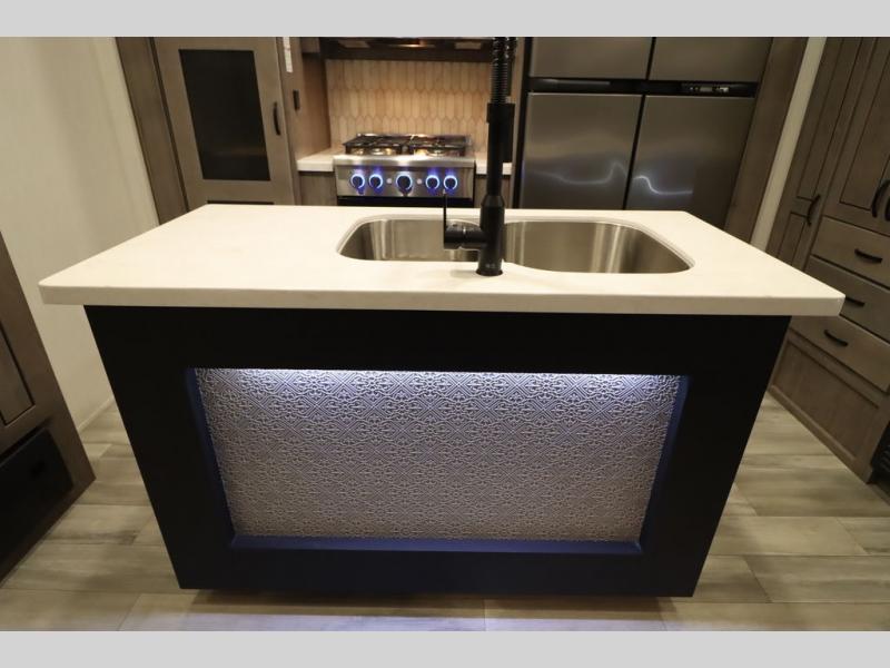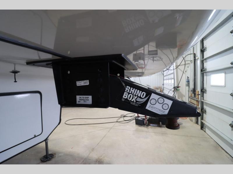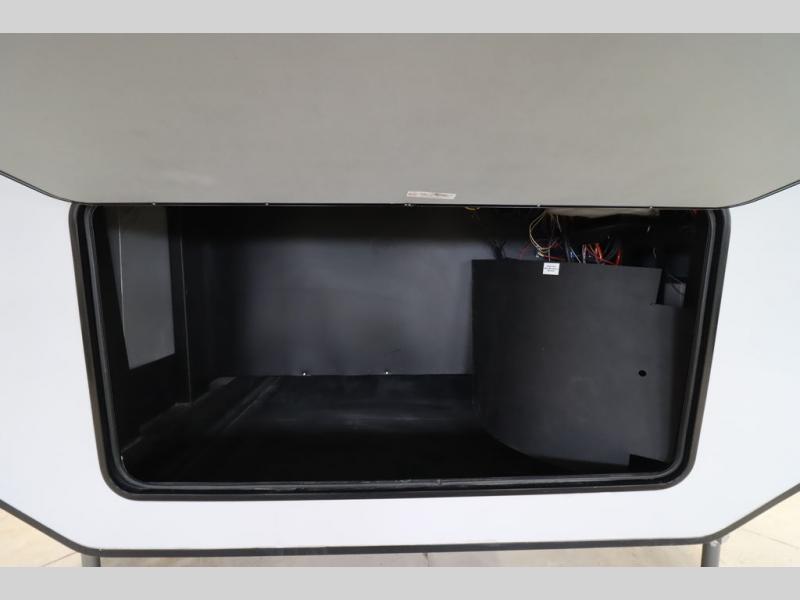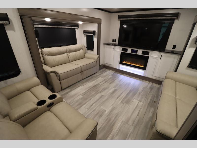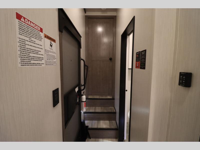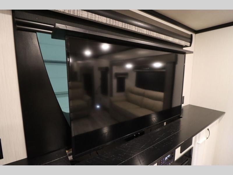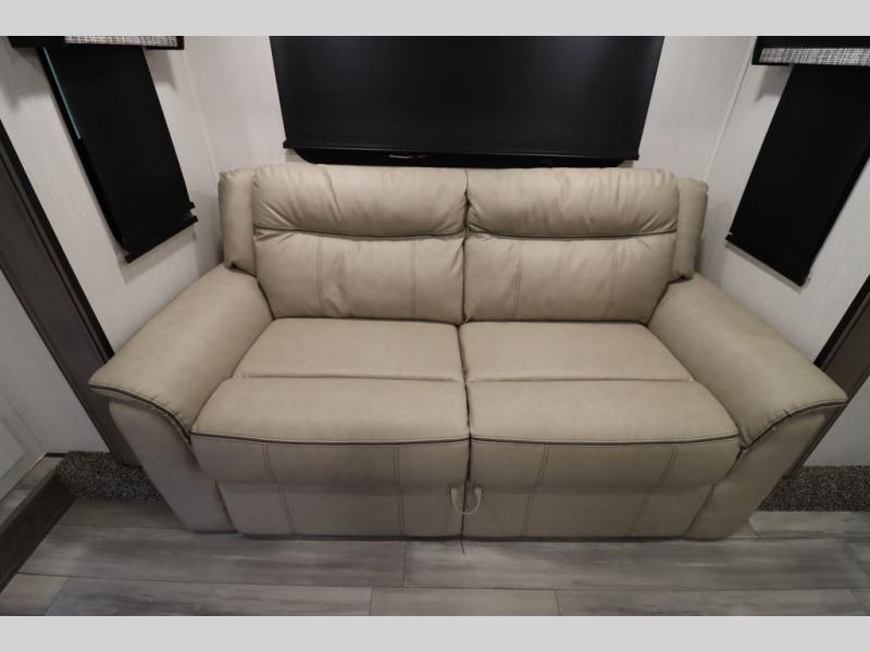 You can bring your favorite off-road toys with you to the campground in this fifth wheel toy hauler! Enjoy a good night's rest on the queen bed above the 63" x 110" below floor garage area, and your guests can sleep on one of the opposing tri-fold sofa slides in the front living area. The living area also has power theater seating across from an entertainment center with a fireplace and 50" hidden telescope flat screen TV to watch your favorite movies at night. Everyone can stay clean with the full bathroom that has a shower with a seat and an area prepped to add an optional washer and dryer. The chef can prepare their best meals with the kitchen island and free standing 24" gas range or at the outside kitchen with an entertainment center to watch the big game while you grill up some juicy burgers!