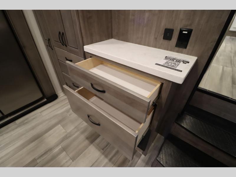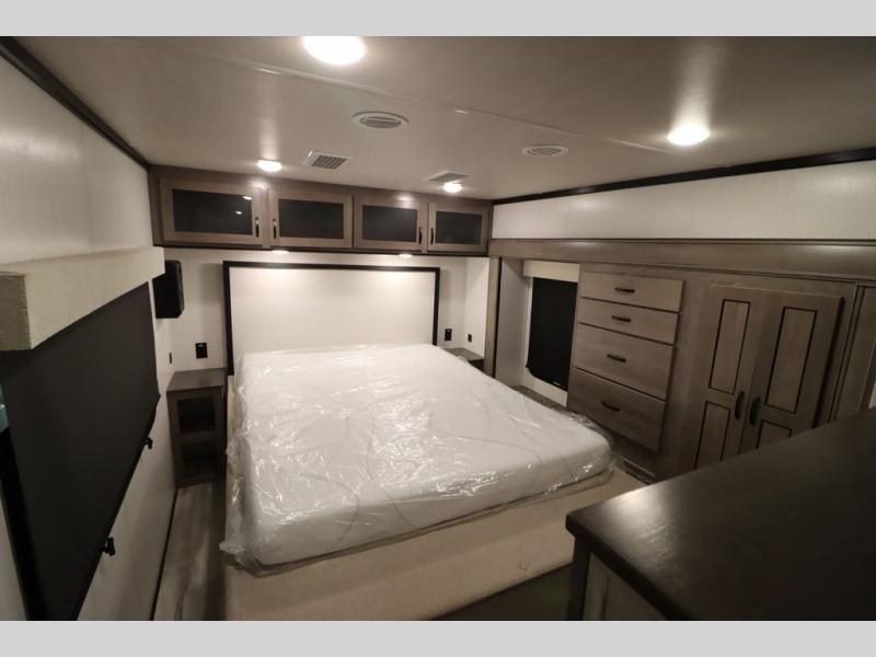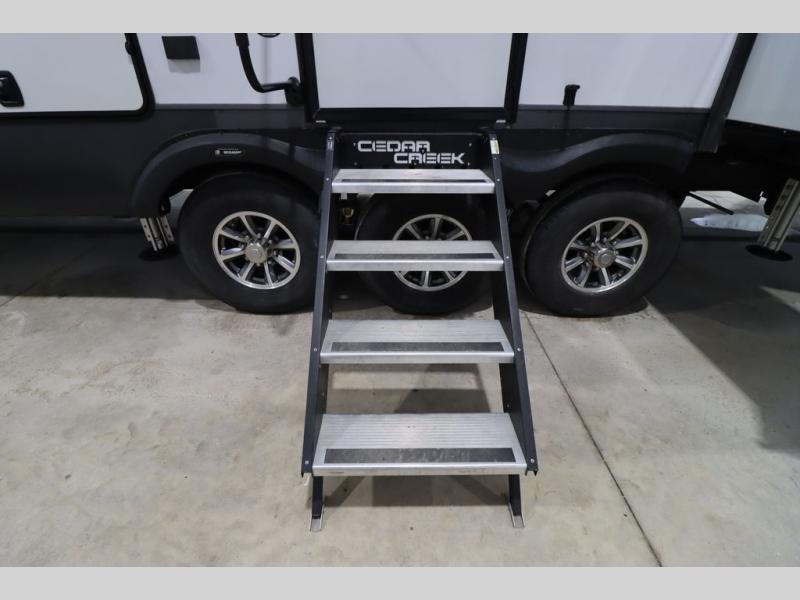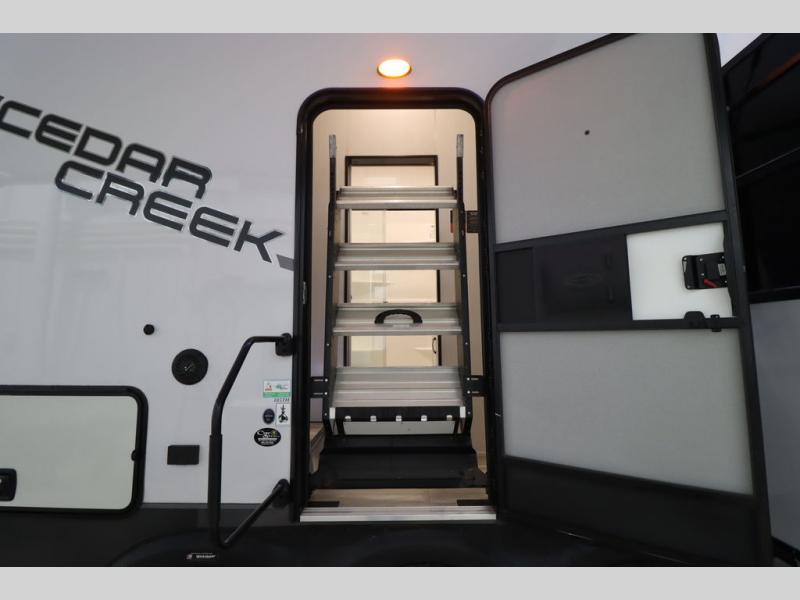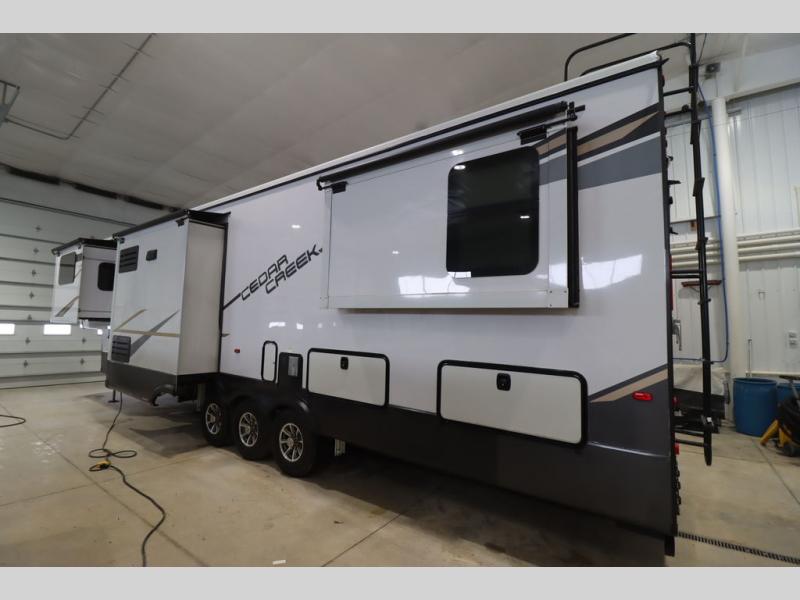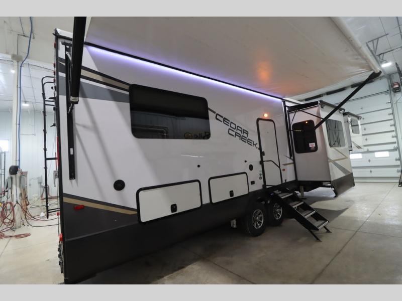 You will have peace of mind camping with any one of these Forest River Cedar Creek fifth wheels or fifth wheel toy haulers! Their aluminum superstructure, high gloss gelcoat exterior, and Dexter heavy duty axles with E-Z lube hubs will outlast all of your adventures. The Silaprene bonded sidewalls resist UV, heat, cold, oils, and highway chemicals with a bond that grows stronger with age while resisting delamination too. With the Vegatouch panel and Firefly dimmer switches, you can have total control of your unit in the palm of your hand. The exterior full docking station has multi-function tank levers, black tank flush, 12V battery disconnect, and an outside shower to keep the dirt where it belongs. The congoleum flooring throughout not only makes you feel right at home, but is also easy to clean. Come find the right model for you today!