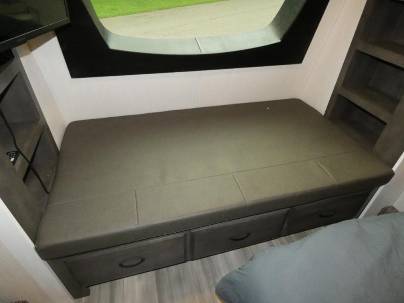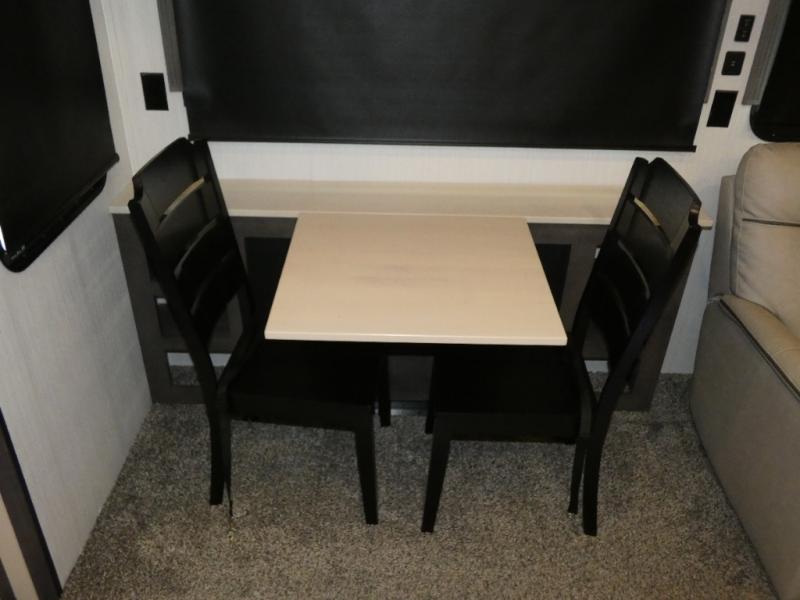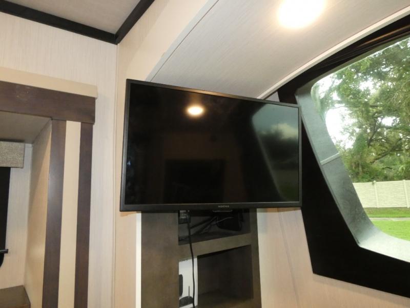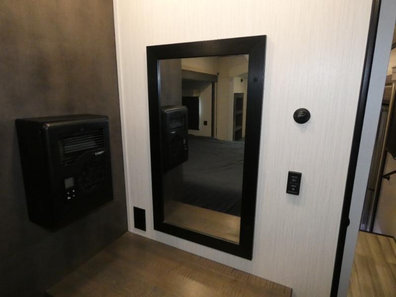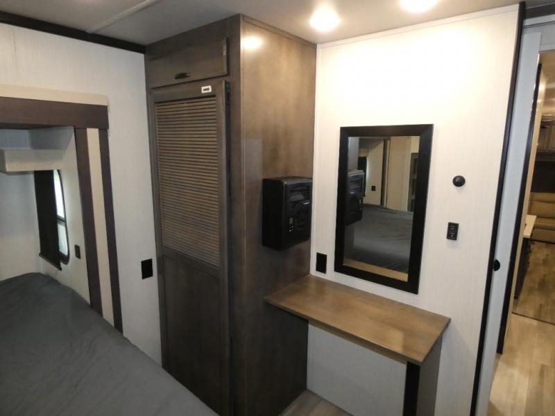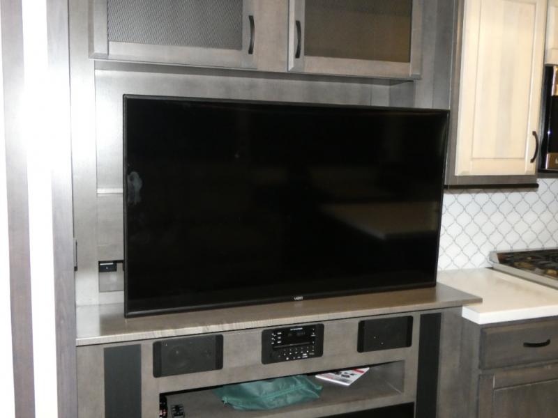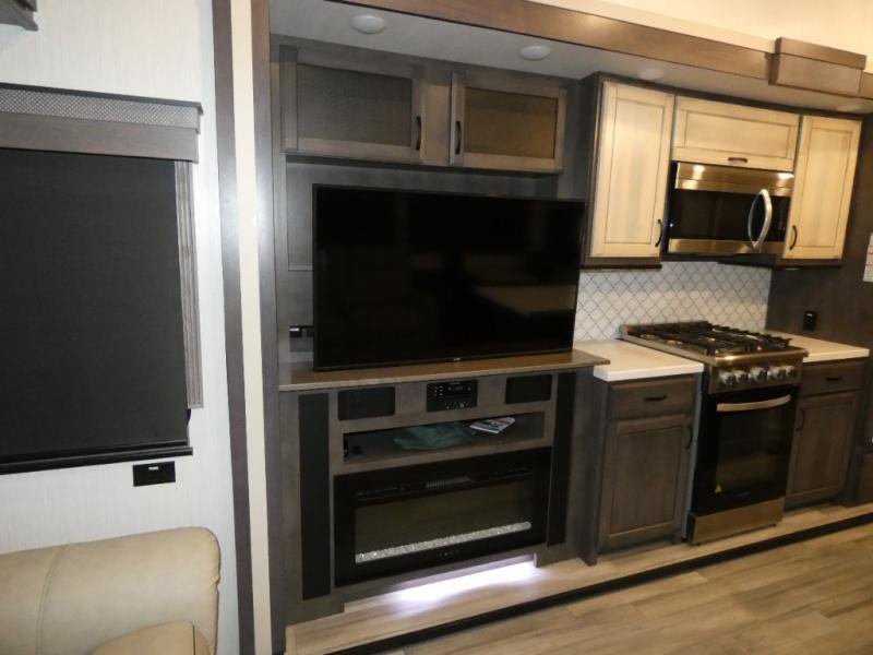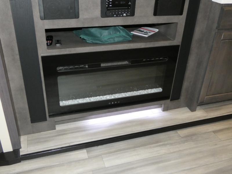 This Cedar Creek Champagne Edition fifth wheel is absolutely glamorous! It features a front private bedroom with a king bed slide, a bench with storage, a closet with preparations for an optional washer/dryer, a vanity, a 32" TV, and an opposing slide with a wardrobe and step-down dresser. What convenience! The full bathroom also has a convenient feature with the dual-sink vanity. This allows two people to brush their teeth at the same time, and the 48" shower has plenty of room to get cleaned up like you would at home. The main living area has power theater seats, a hide-a-bed sofa, and a pull-out dinette, and these are all great places to sit down at the end of a long day and to enjoy the fireplace and 55" 4K TV.
