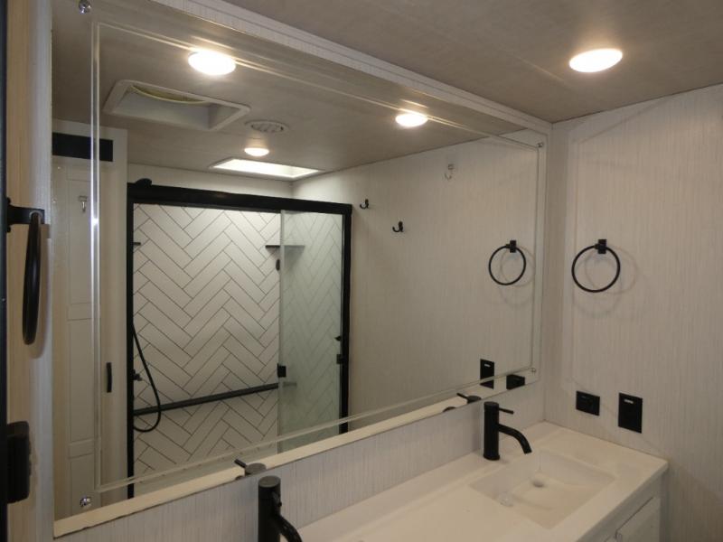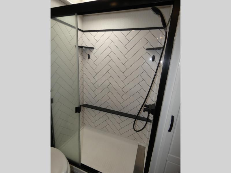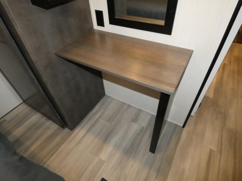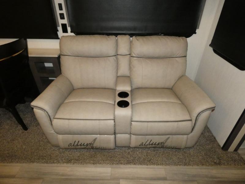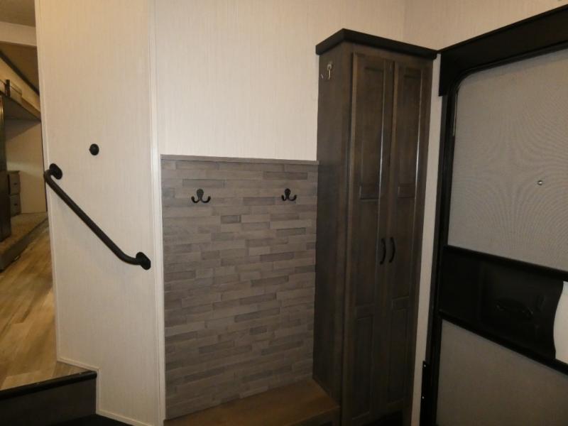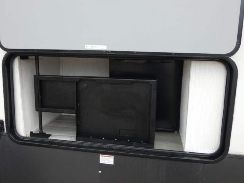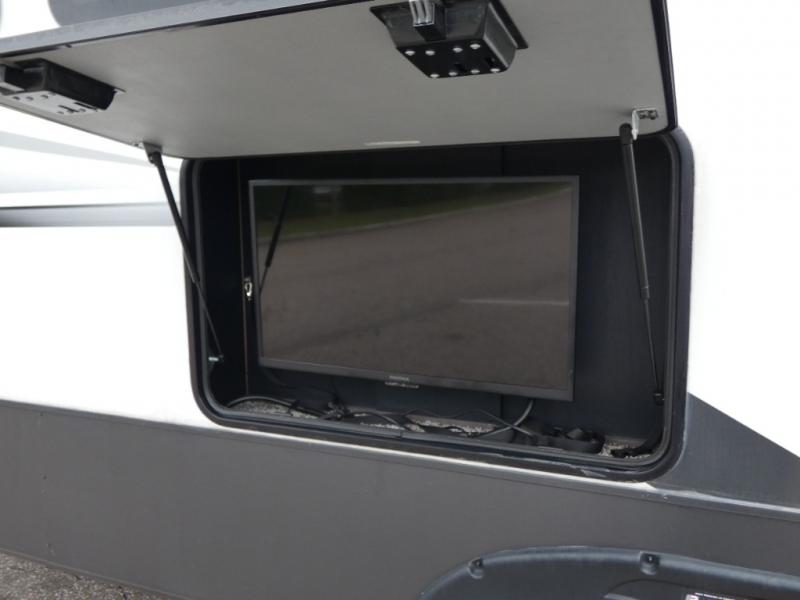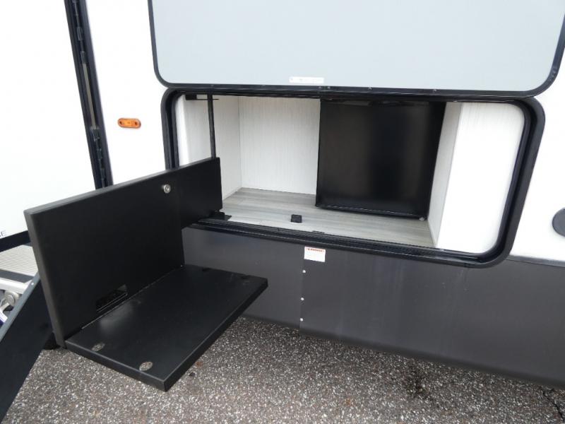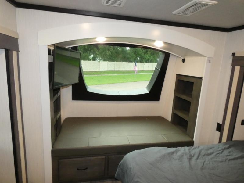 This Cedar Creek Champagne Edition fifth wheel is absolutely glamorous! It features a front private bedroom with a king bed slide, a bench with storage, a closet with preparations for an optional washer/dryer, a vanity, a 32" TV, and an opposing slide with a wardrobe and step-down dresser. What convenience! The full bathroom also has a convenient feature with the dual-sink vanity. This allows two people to brush their teeth at the same time, and the 48" shower has plenty of room to get cleaned up like you would at home. The main living area has power theater seats, a hide-a-bed sofa, and a pull-out dinette, and these are all great places to sit down at the end of a long day and to enjoy the fireplace and 55" 4K TV.