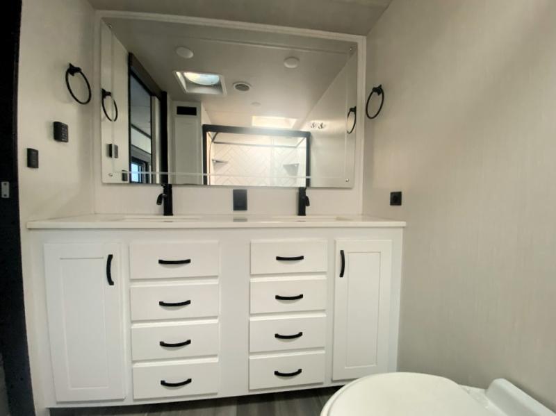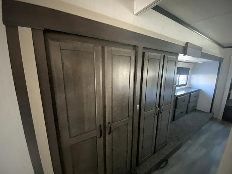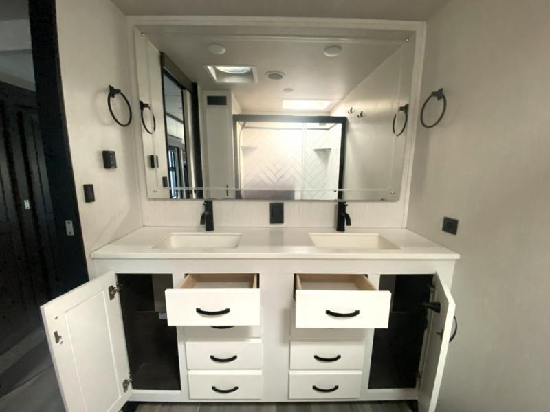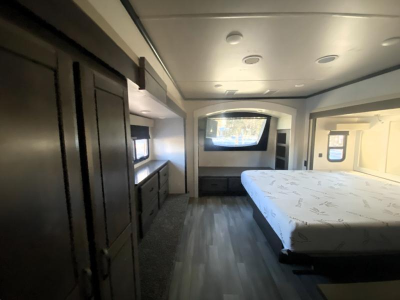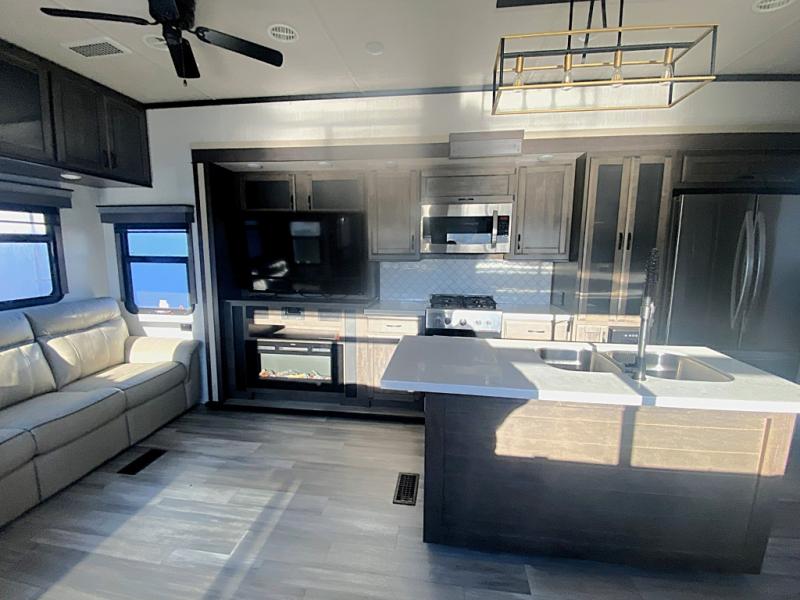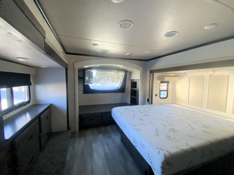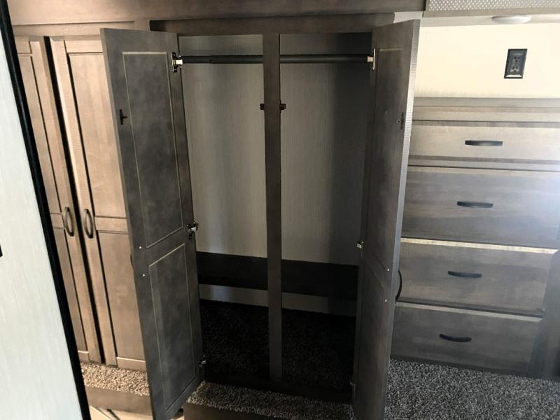This Cedar Creek Champagne Edition fifth wheel is absolutely glamorous! It features a front private bedroom with a king bed slide, a bench with storage, a closet with preparations for an optional washer/dryer, a vanity, a 32" TV, and an opposing slide with a wardrobe and step-down dresser. What convenience! The full bathroom also has a convenient feature with the dual-sink vanity. This allows two people to brush their teeth at the same time, and the 48" shower has plenty of room to get cleaned up like you would at home. The main living area has power theater seats, a hide-a-bed sofa, and a pull-out dinette, and these are all great places to sit down at the end of a long day and to enjoy the fireplace and 55" 4K TV.