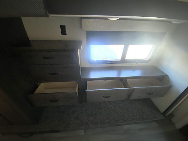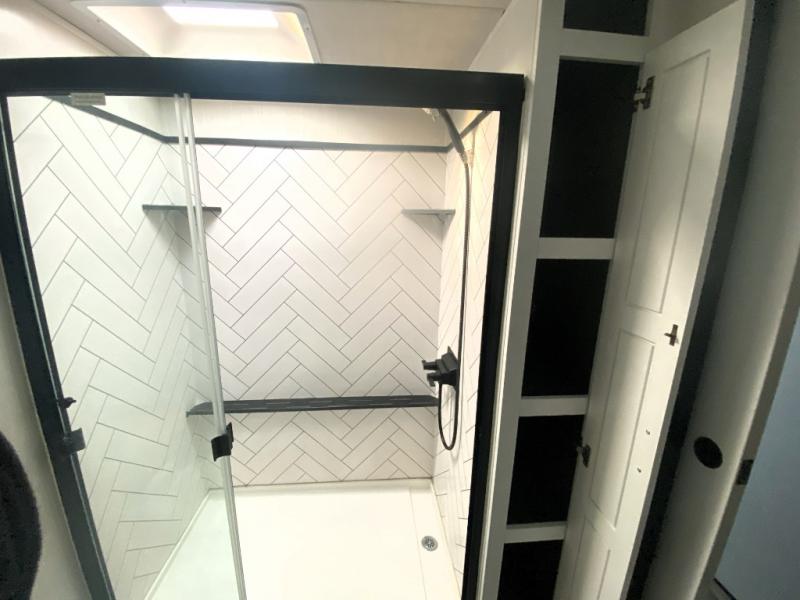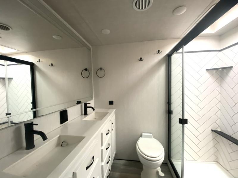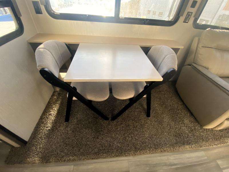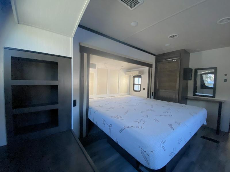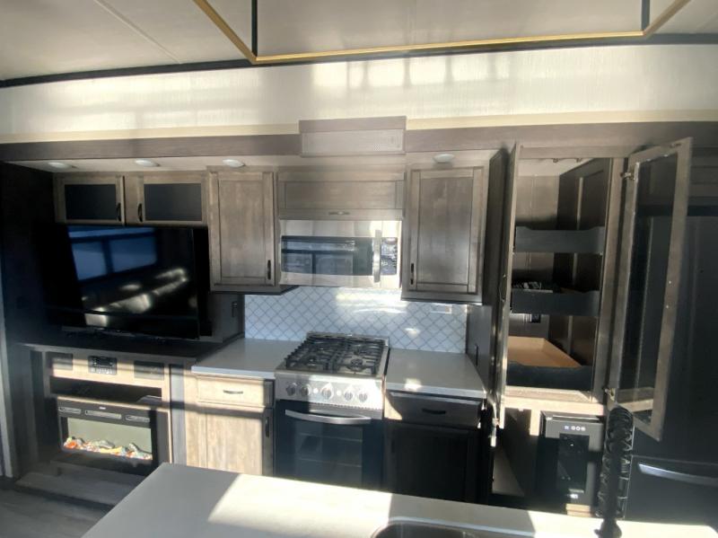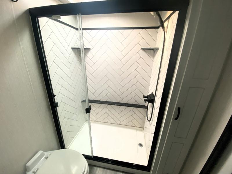 This Cedar Creek Champagne Edition fifth wheel is absolutely glamorous! It features a front private bedroom with a king bed slide, a bench with storage, a closet with preparations for an optional washer/dryer, a vanity, a 32" TV, and an opposing slide with a wardrobe and step-down dresser. What convenience! The full bathroom also has a convenient feature with the dual-sink vanity. This allows two people to brush their teeth at the same time, and the 48" shower has plenty of room to get cleaned up like you would at home. The main living area has power theater seats, a hide-a-bed sofa, and a pull-out dinette, and these are all great places to sit down at the end of a long day and to enjoy the fireplace and 55" 4K TV.