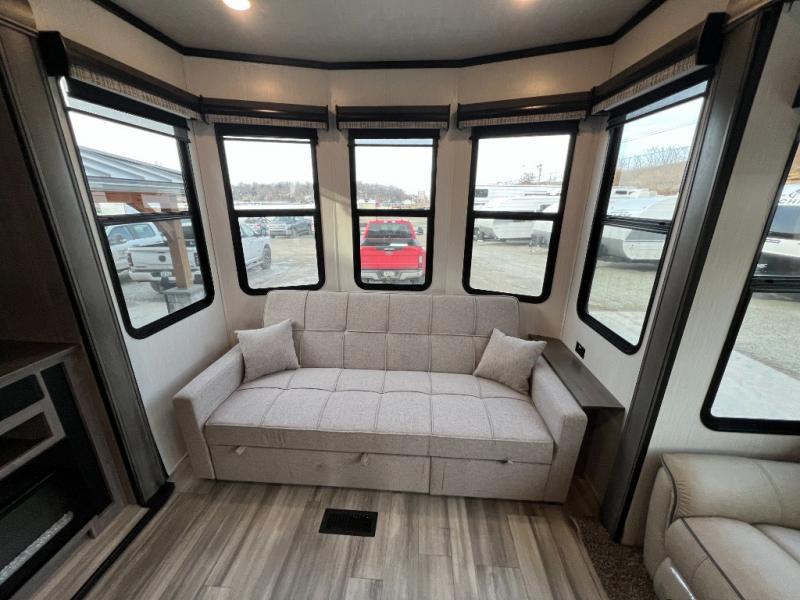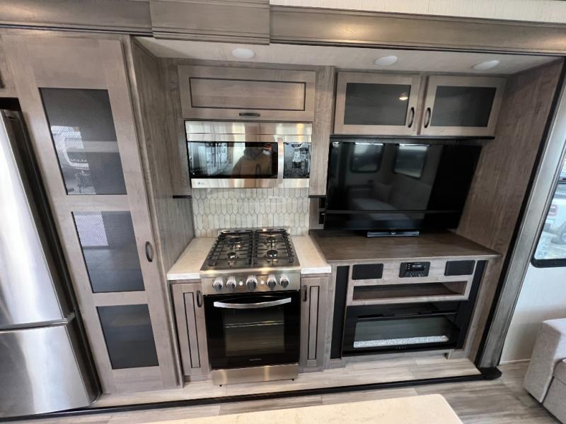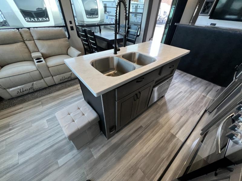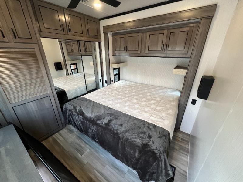 This Cedar Creek Cottage destination trailer will be the perfect entertaining companion! There is a wet bar with peninsula countertop, sink, and mini refrigerator that you can use to serve drinks to your friends when they stop by. The opposing slides at the front will give you plenty of room to work around the kitchen island or rest in the power theater seats and hide-a-bed sofa. The pantry will store all of your goodies, and you can even add an optional dishwasher to create more convenience. The king bed slide back in the private bedroom sits right next to the large wardrobe, and the ceiling-mounted, individually-switched overhead reading lights in the slide will let you read that last chapter before bed.
